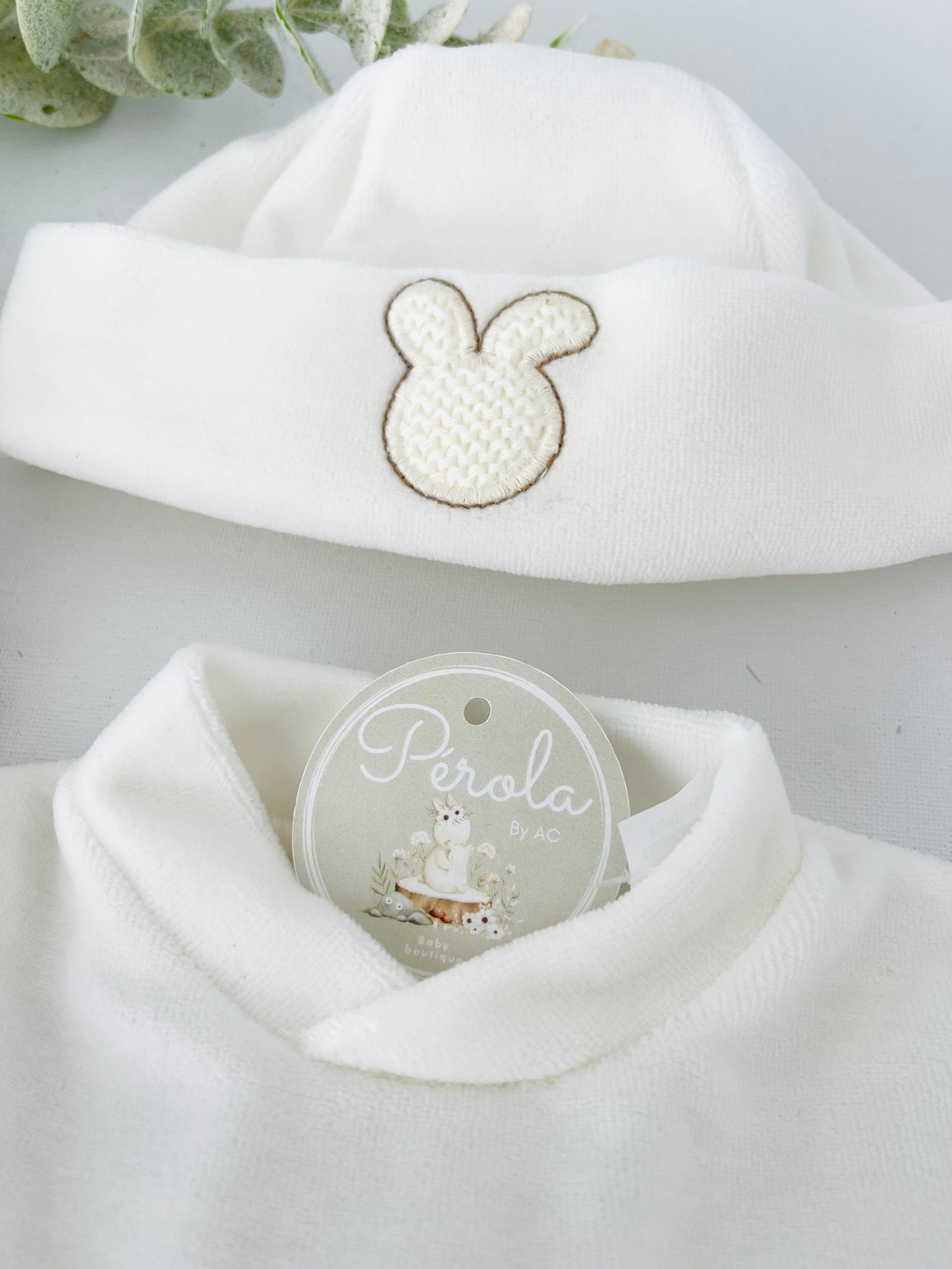 Conjunto em veludo 4 peças tema coelhinho : calças, camisola, carapins e gorro