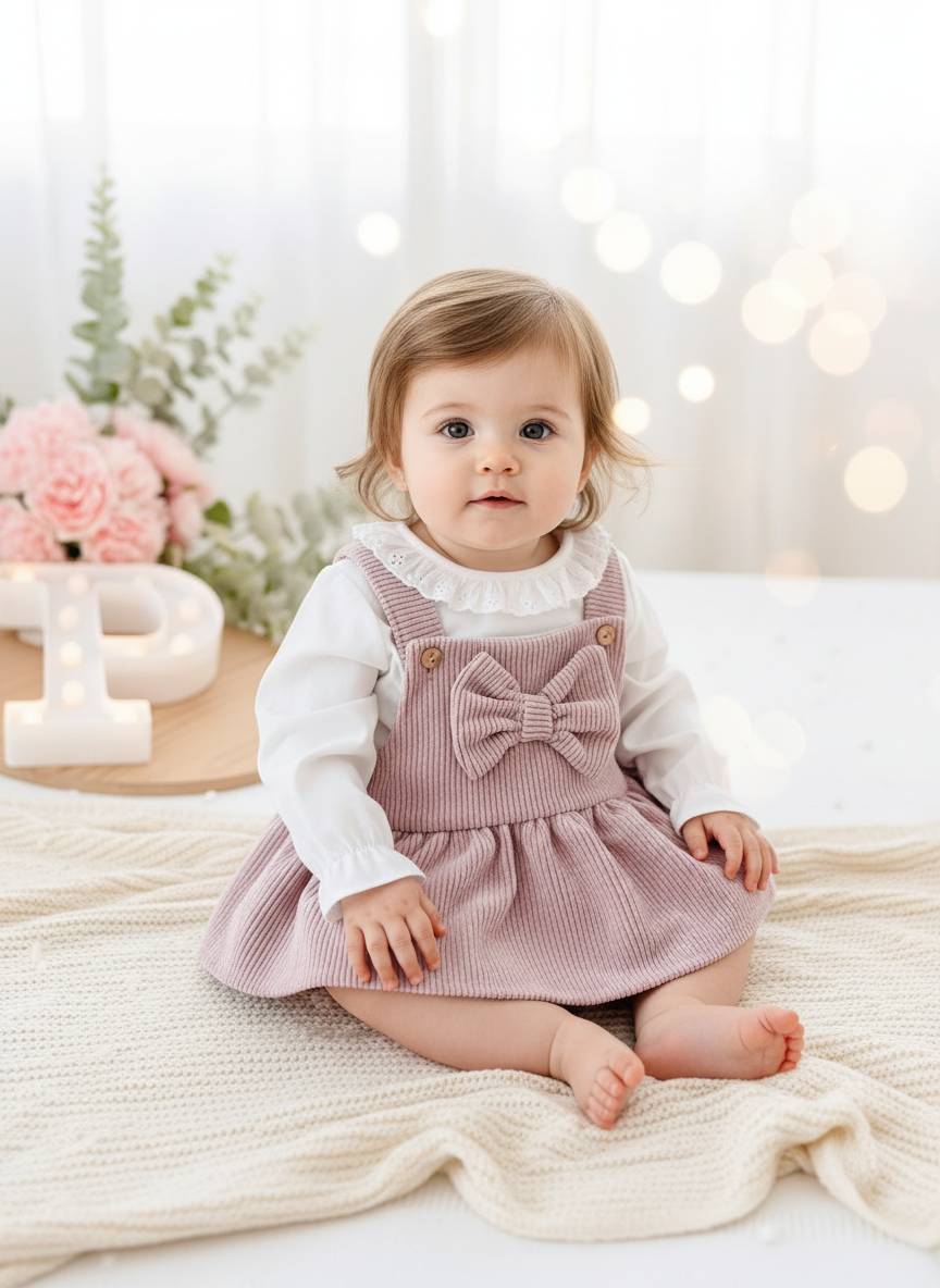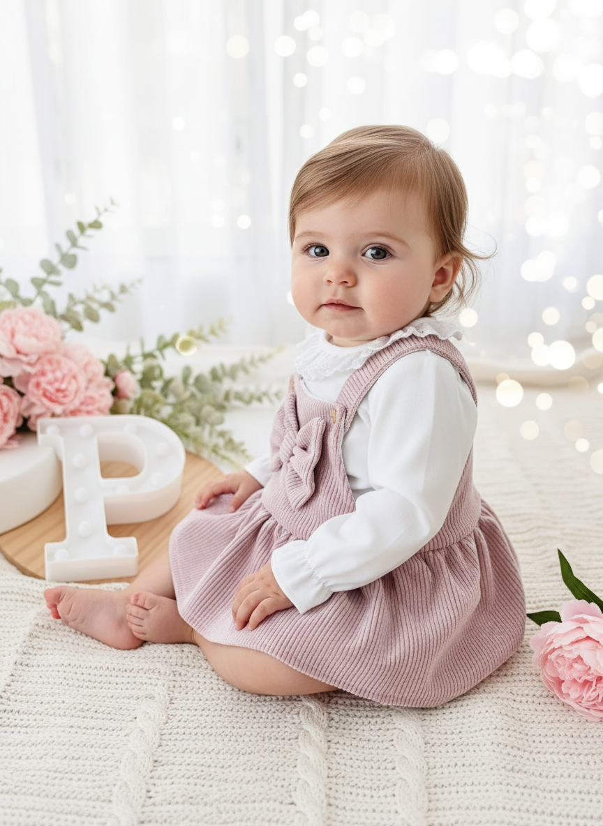 Este elegante conjunto rosa em bombazine é a escolha perfeita para os momentos especiais do seu bebé. Composto por um fofo e uma blusa coordenada, oferece conforto e estilo em cada detalhe.