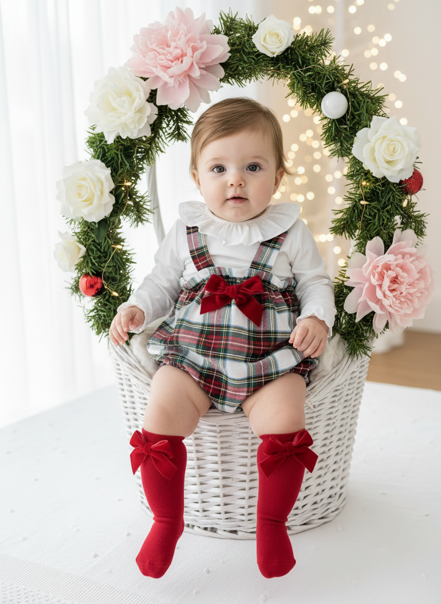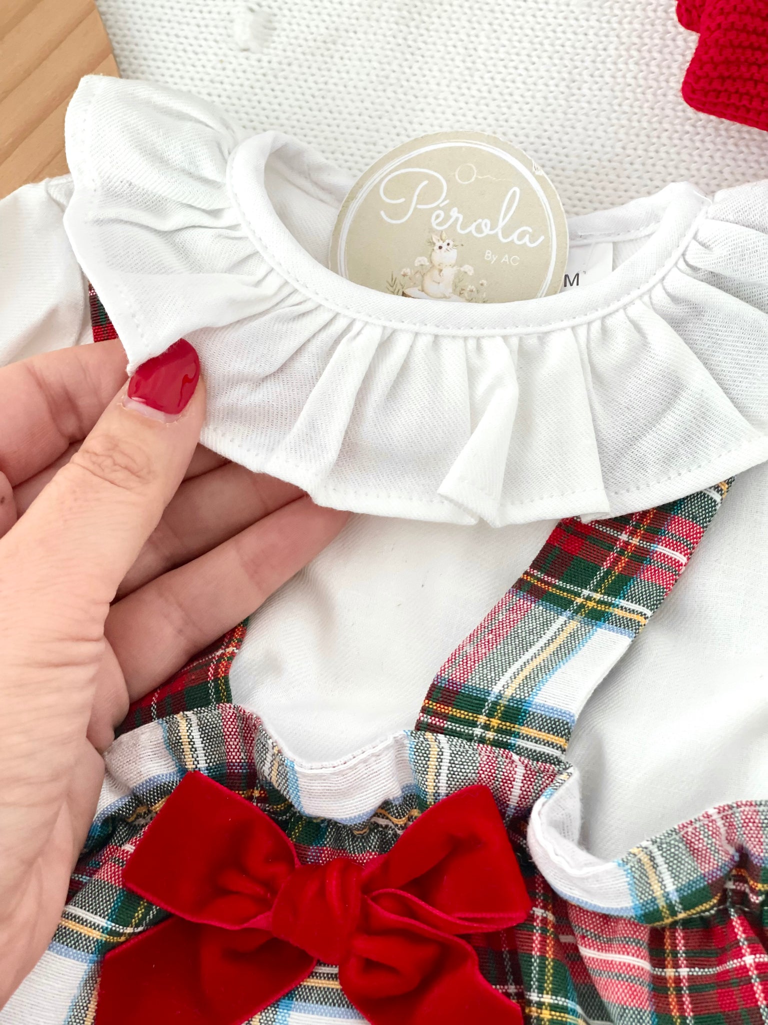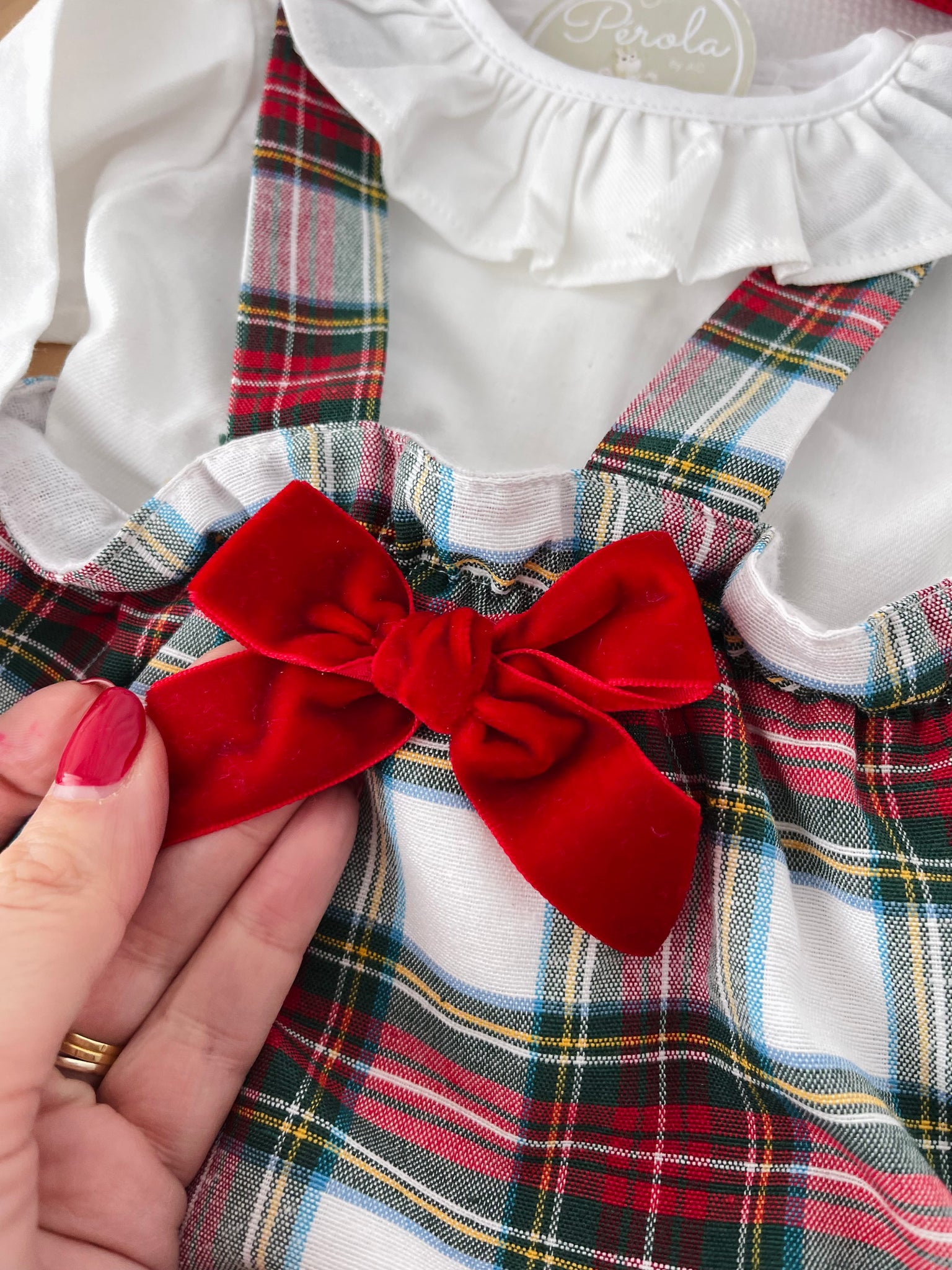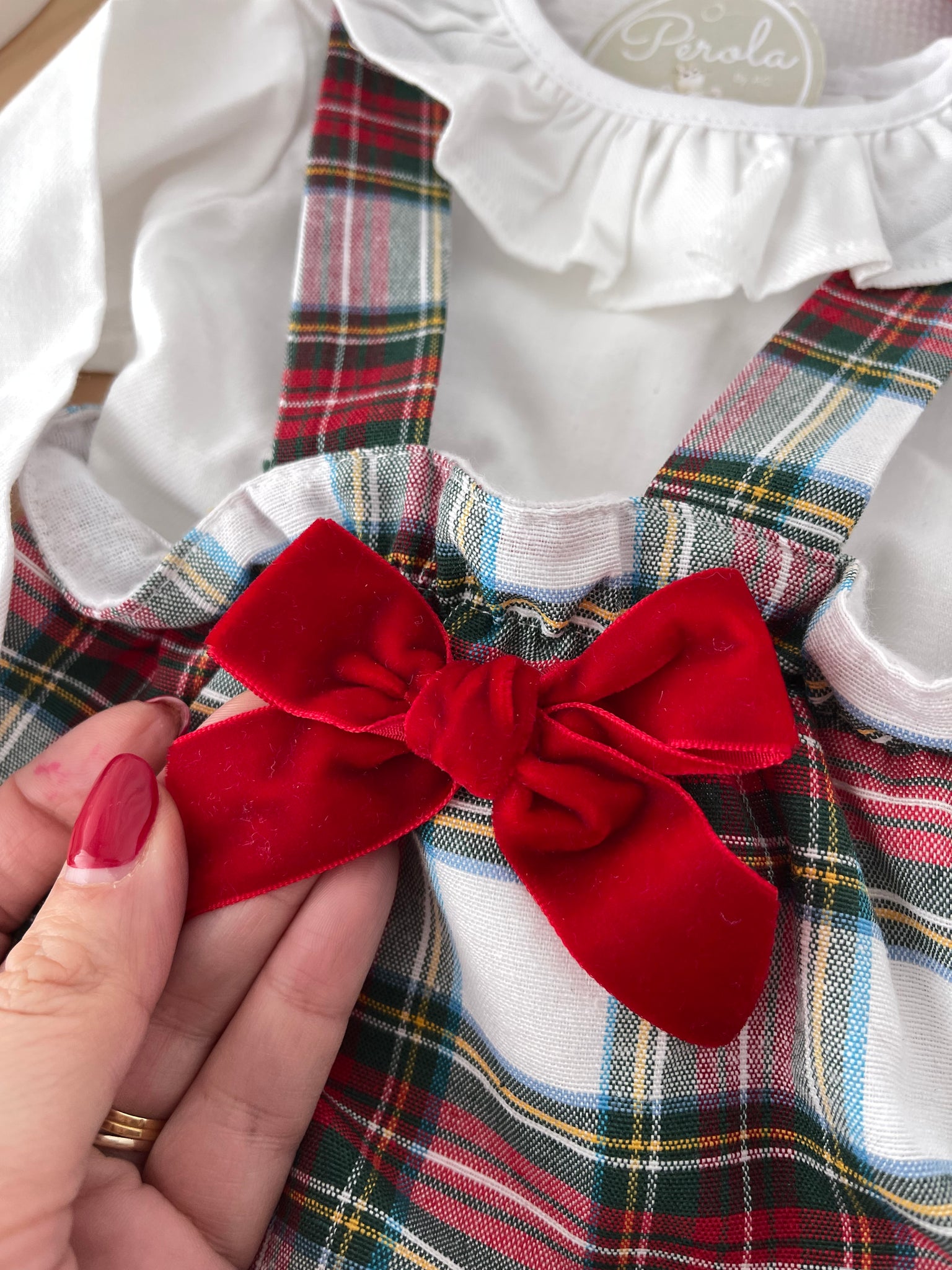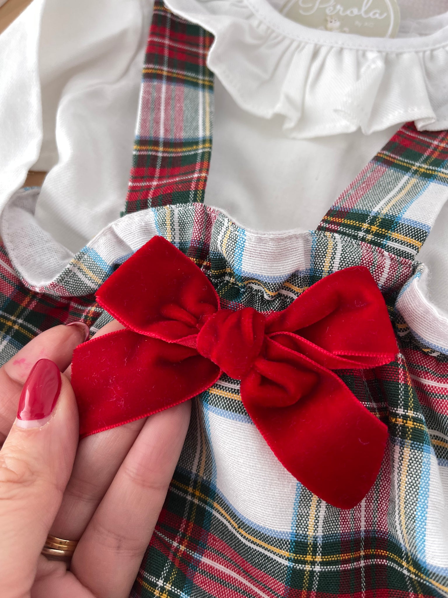 • Fofo curto em xadrez com alças e laço de veludo vermelho no peito