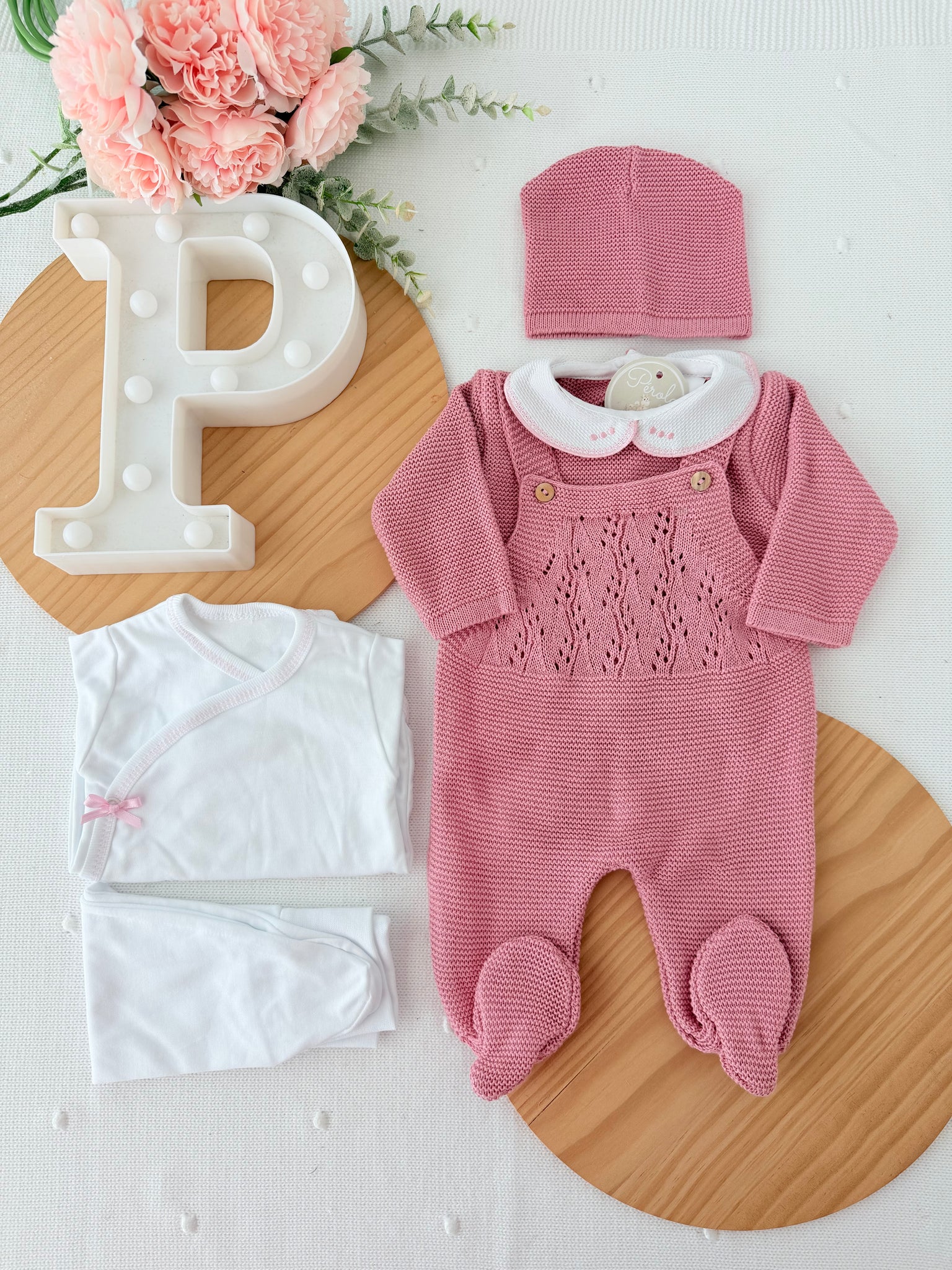 Pack saída de maternidade Rosa 5 peças: body, calças, jardineiras, camisola e gorro