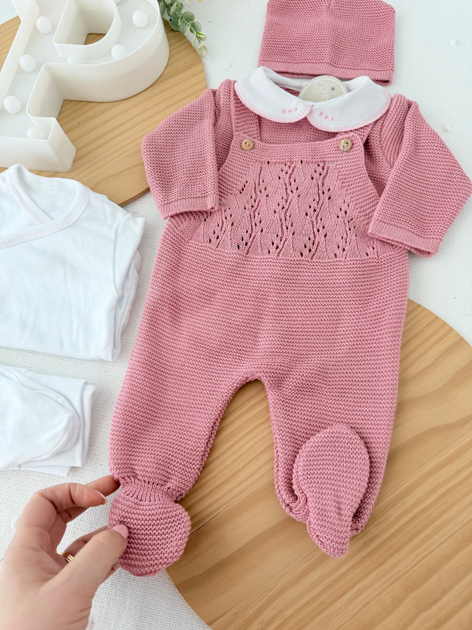 Pack completo de 5 peças: jardineiras de malha, camisola de malha, gorro de malha, body interior e calças interiores.