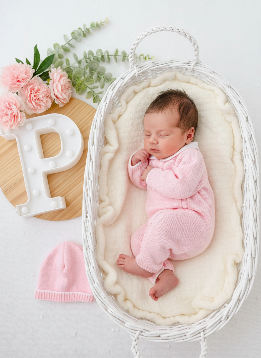 Conjunto suave e delicado de duas peças: macacão e gorro.