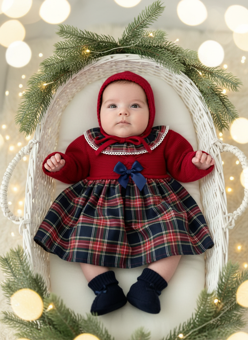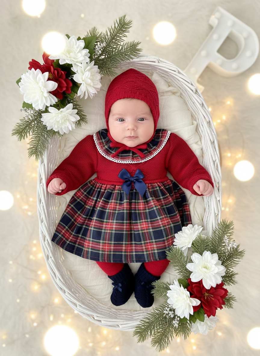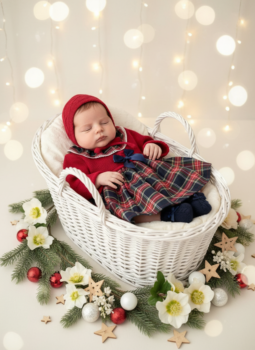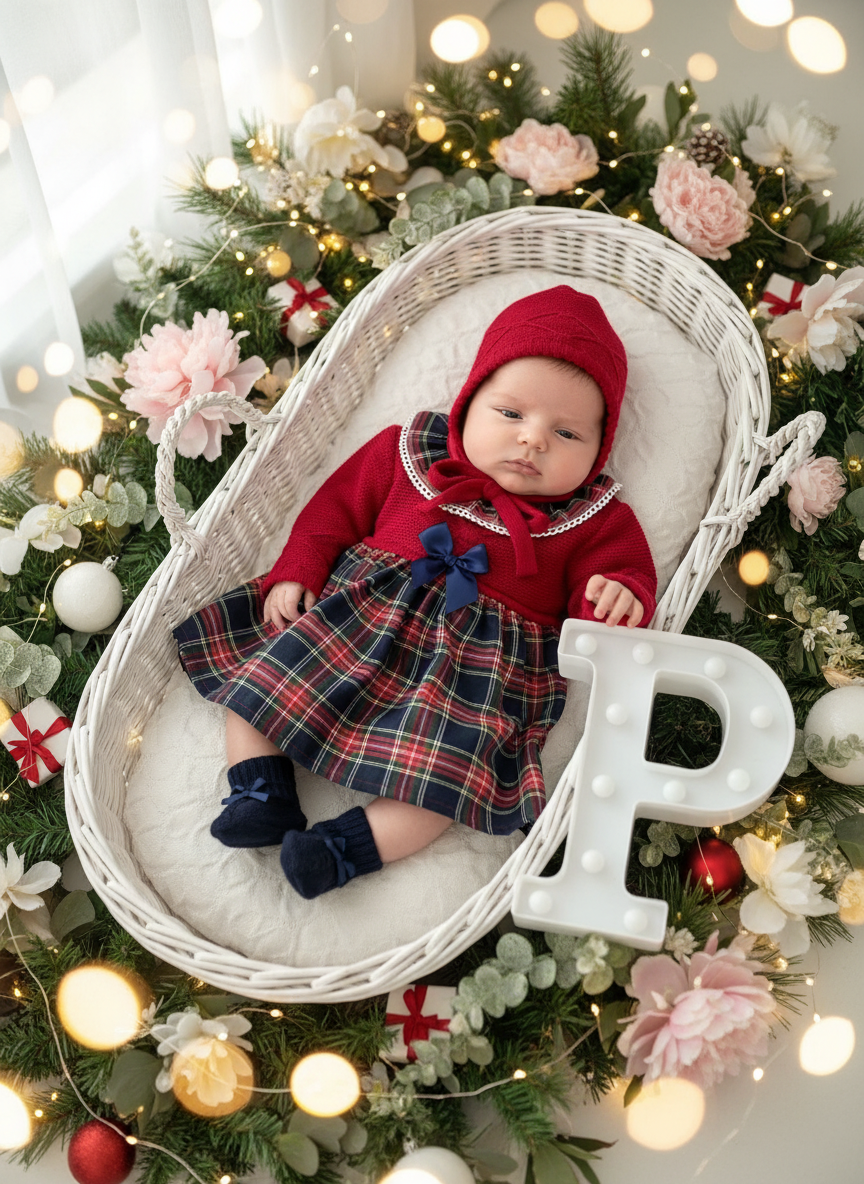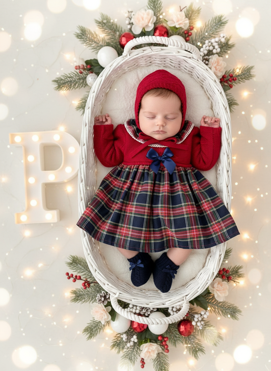 Cada peça é cuidadosamente confecionada com atenção aos detalhes. A combinação do vermelho vibrante com o padrão xadrez clássico cria um visual sofisticado e atemporal, perfeito para as primeiras fotografias e momentos especiais do seu bebé.