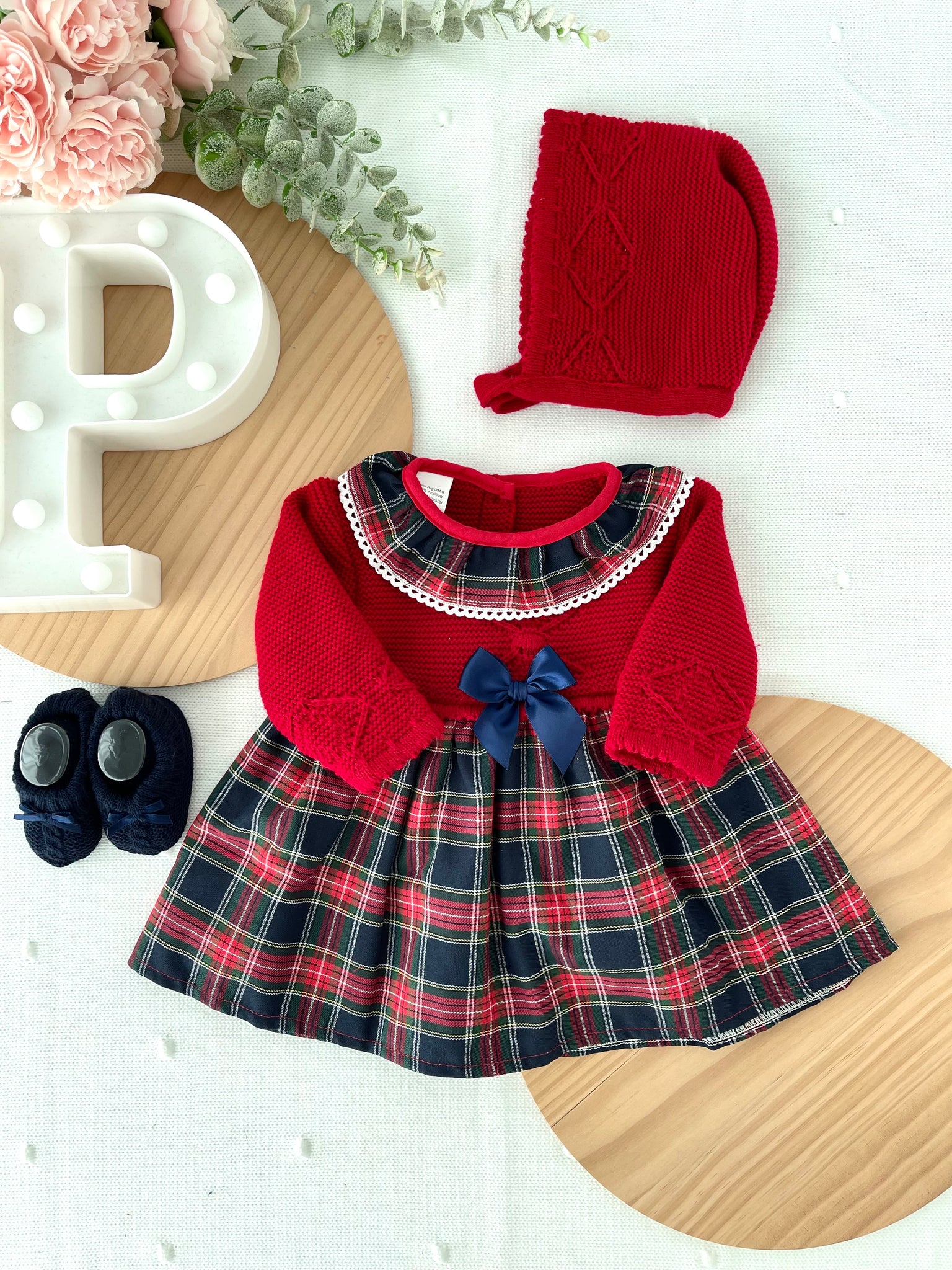 • Touca: Touca em malha vermelha tricotada a condizer, com fitas para ajuste perfeito