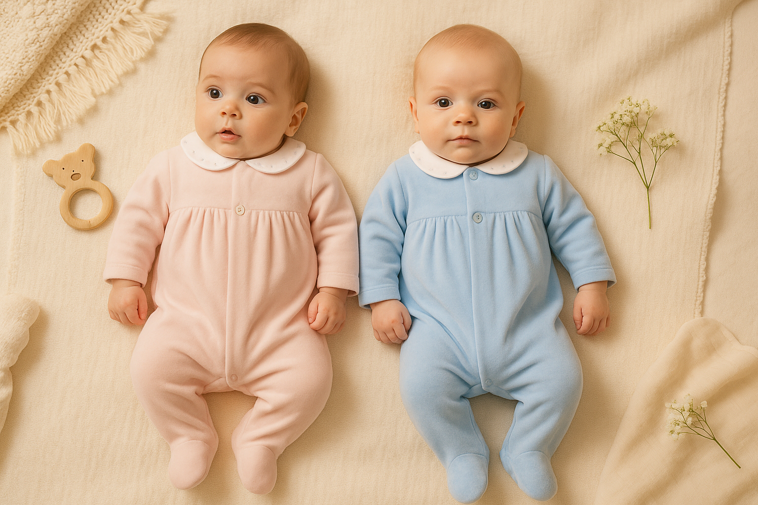 Babygrow em veludo muito suave,abertura à frente,  gola Peter Pan com pintinhas bordadas, botões, etc.