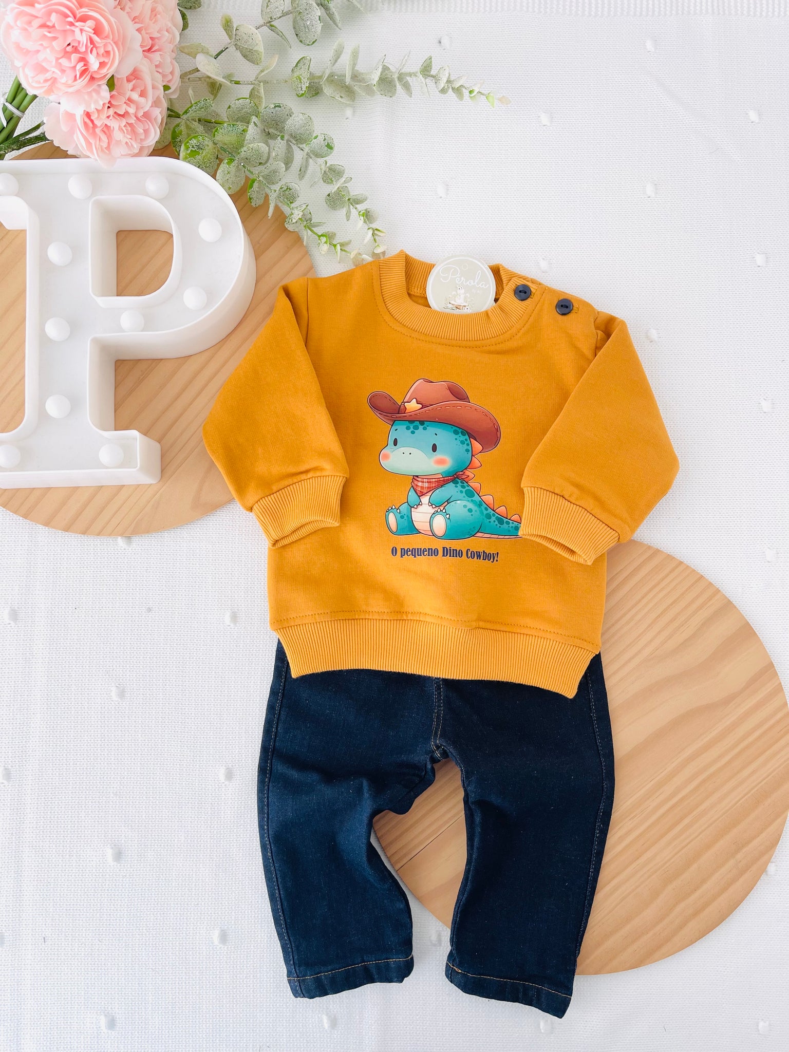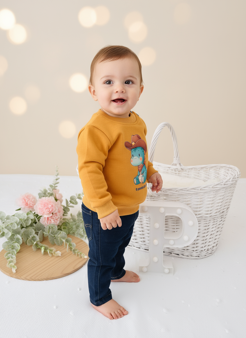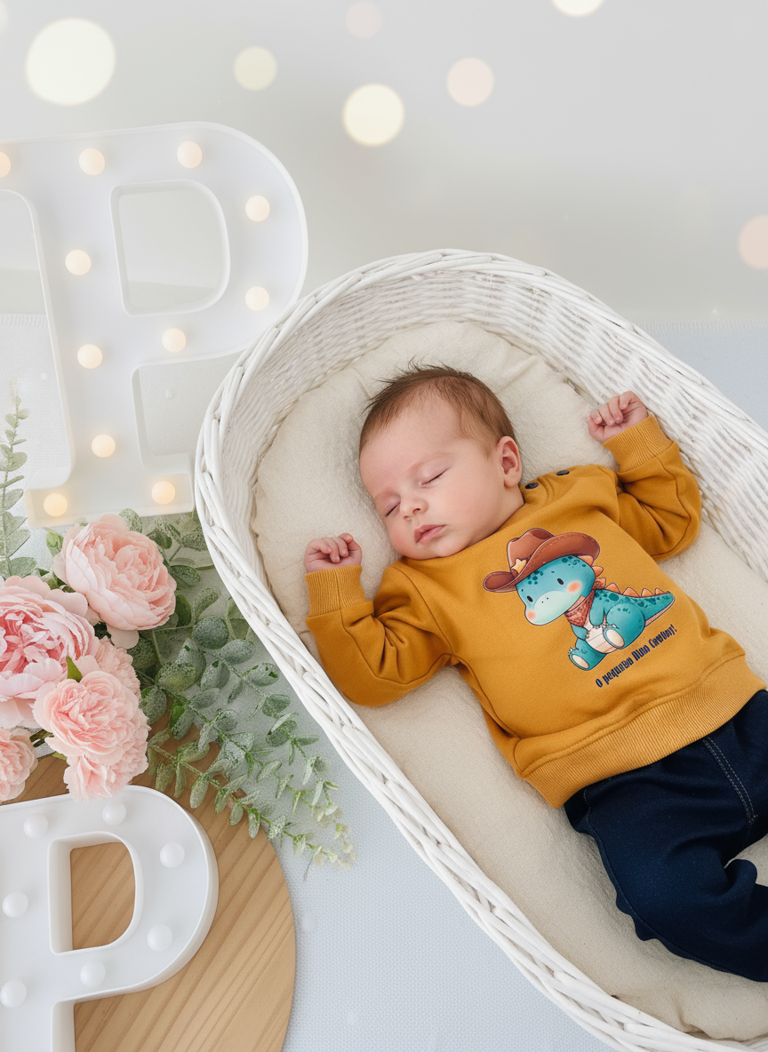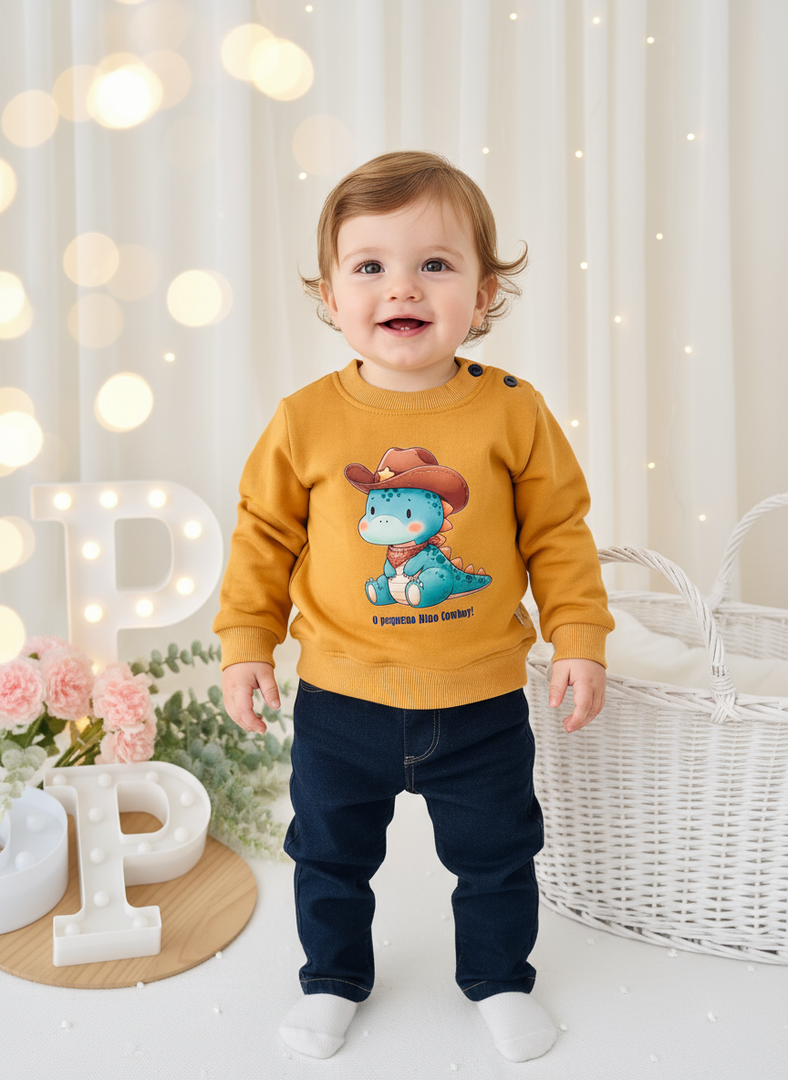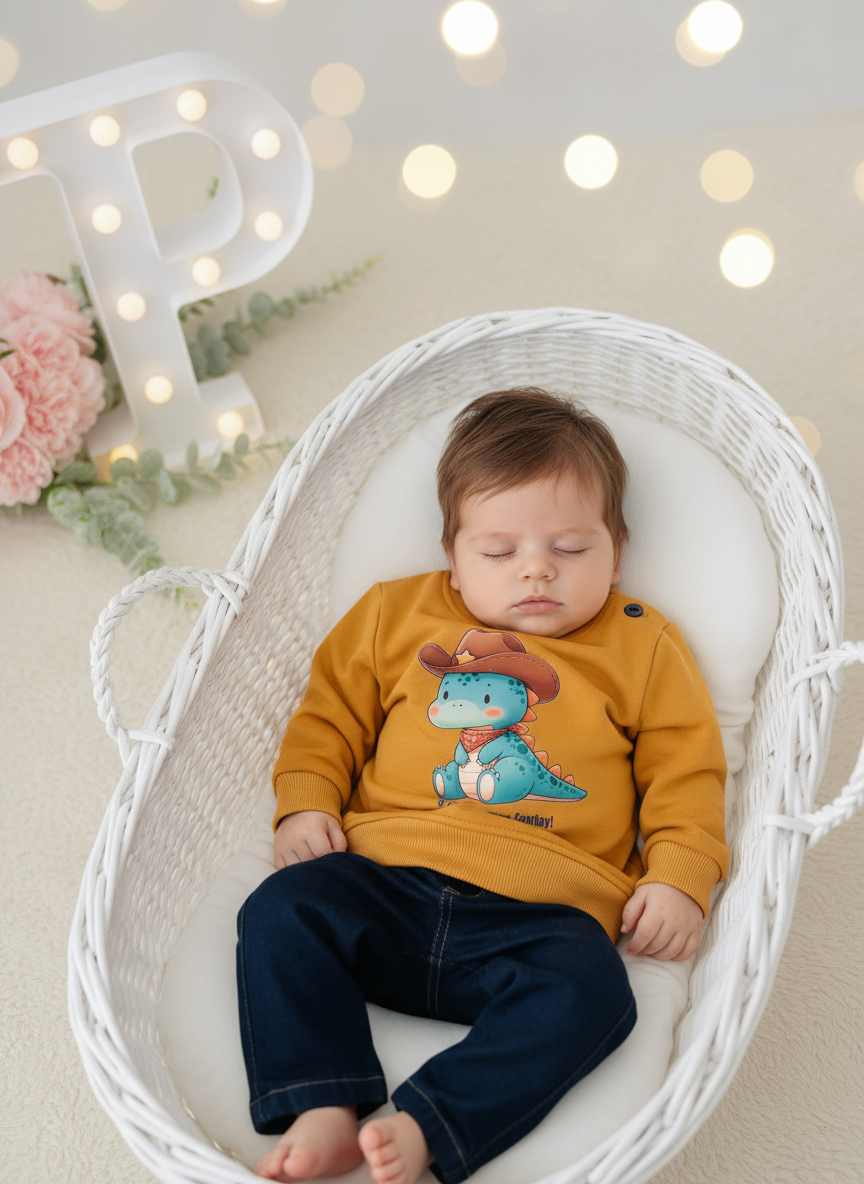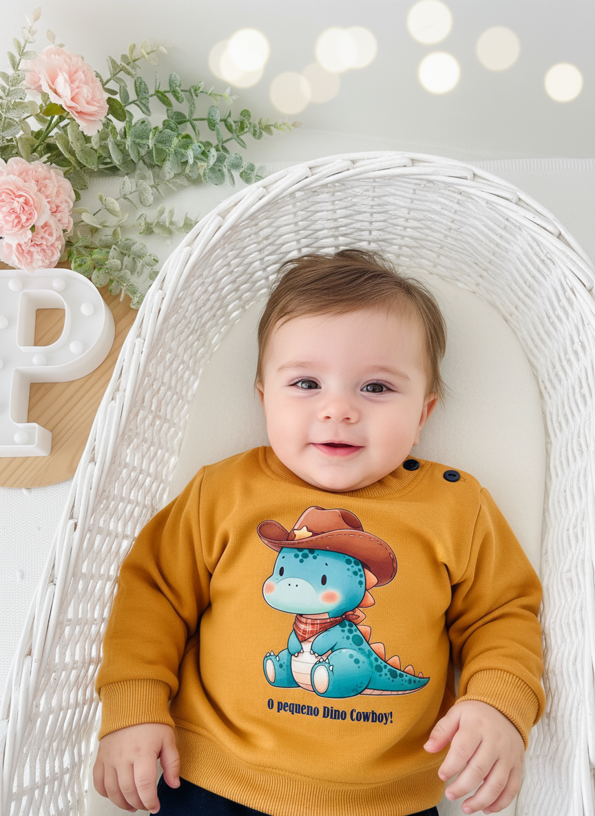 - Camisola camel com dinossauro cowboy: Um design encantador com um simpático dinossauro turquesa vestido de cowboy, completo com chapéu castanho e bandana vermelha. A frase "O pequeno Dino Cowboy!" adiciona um toque divertido. Detalhes práticos incluem botões azul-marinho no ombro para facilitar o vestir e punhos canelados para maior conforto.