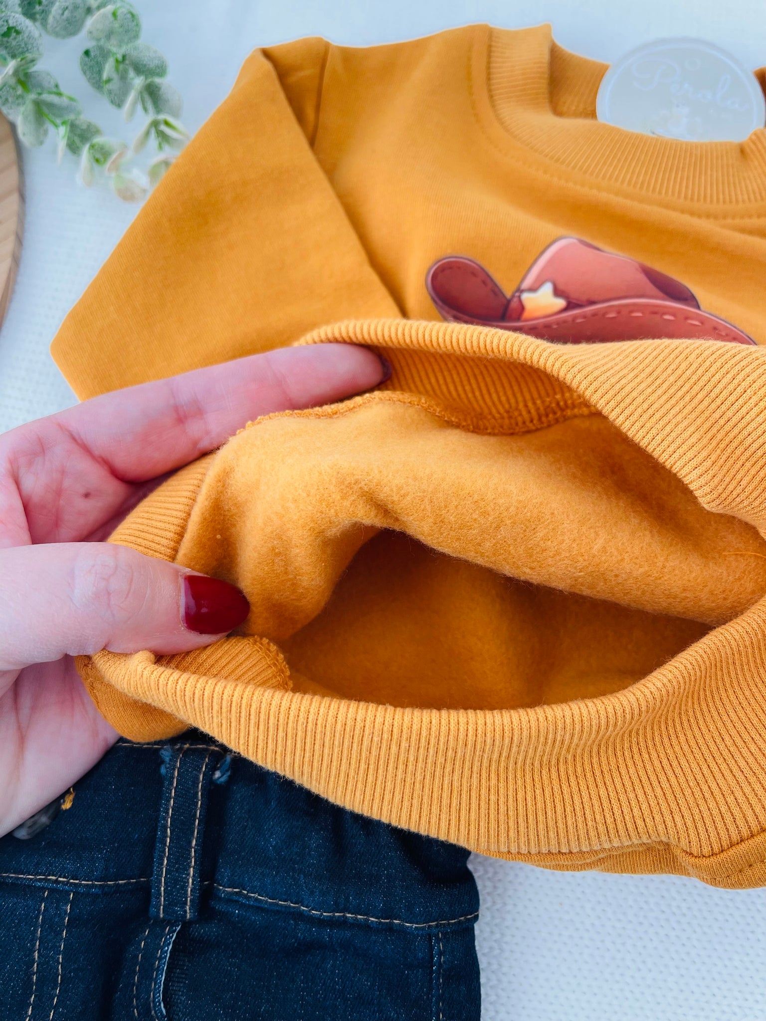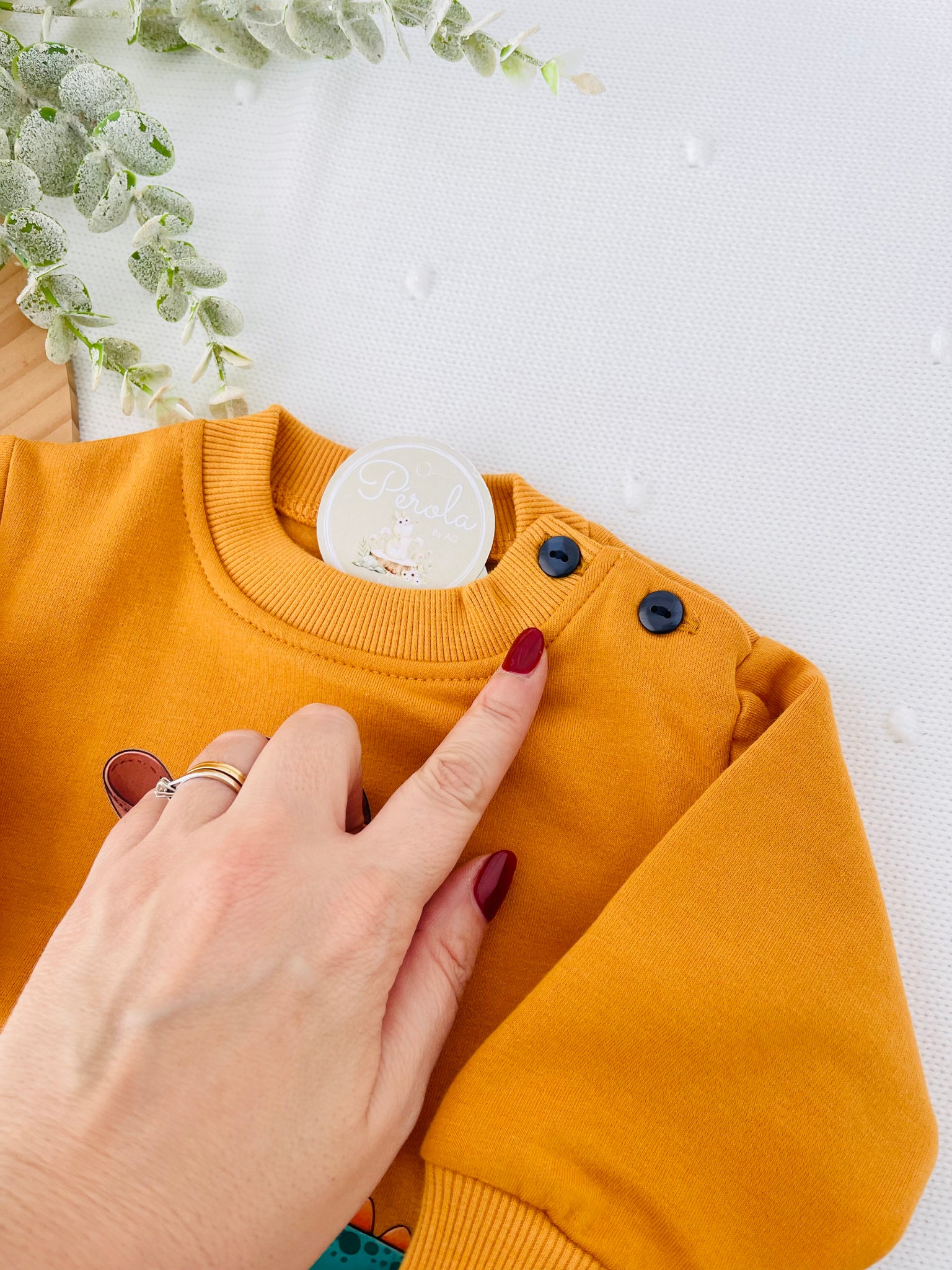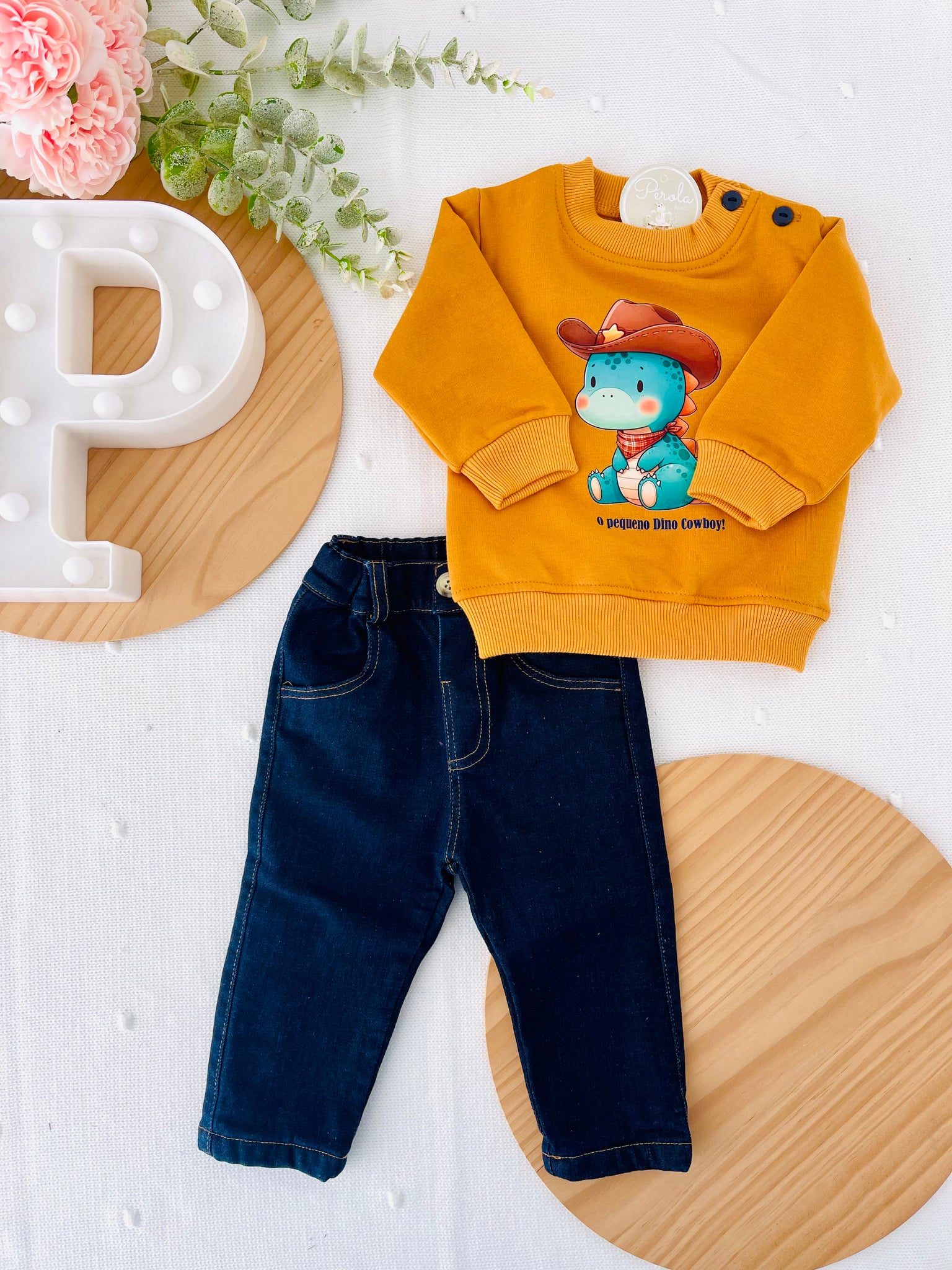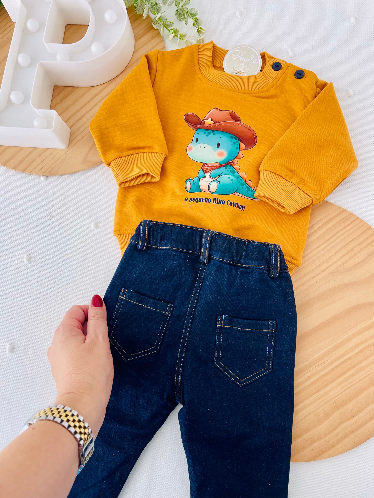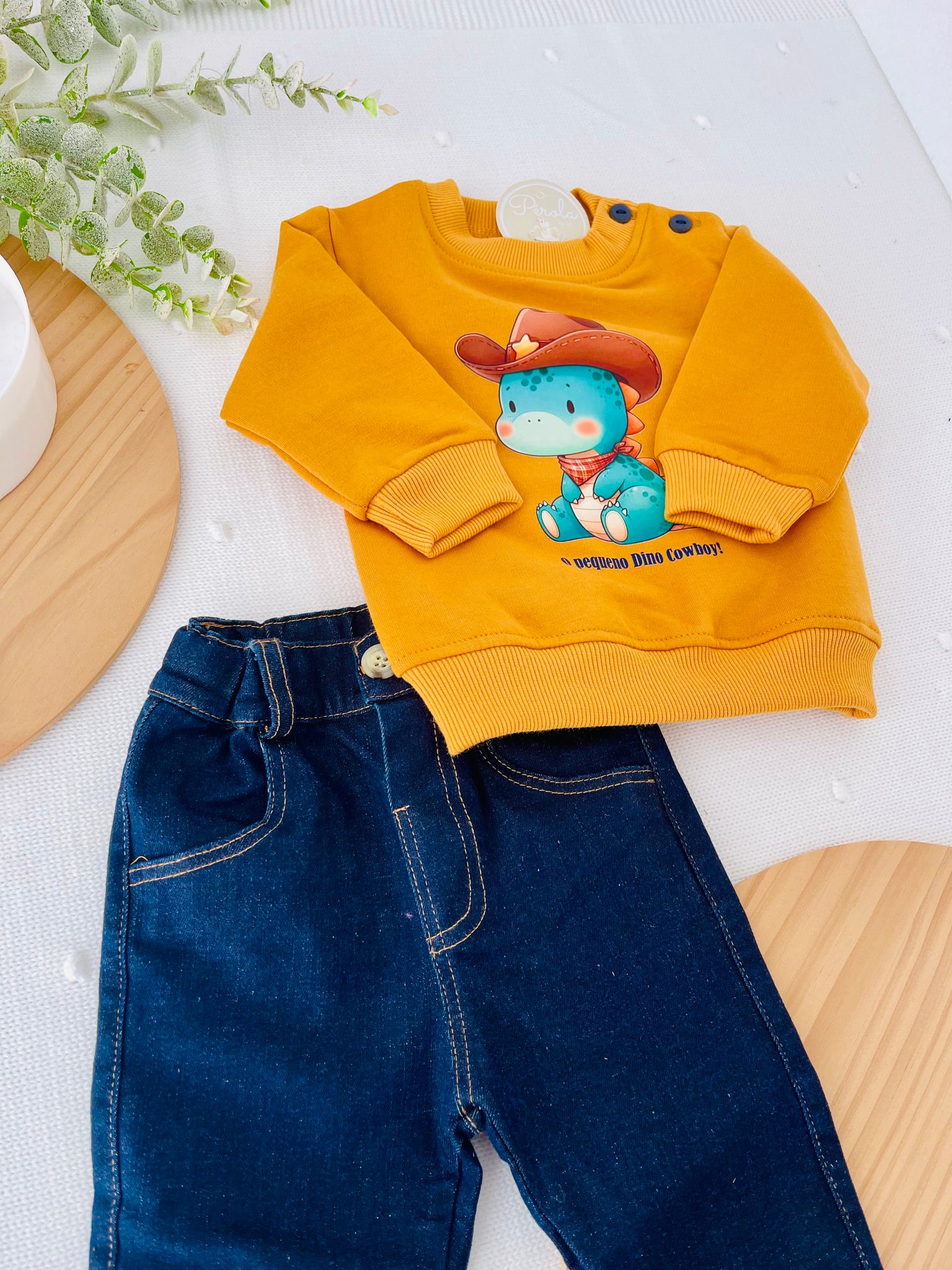 - Camisola camel com dinossauro cowboy: Um design encantador com um simpático dinossauro turquesa vestido de cowboy, completo com chapéu castanho e bandana vermelha. A frase "O pequeno Dino Cowboy!" adiciona um toque divertido. Detalhes práticos incluem botões azul-marinho no ombro para facilitar o vestir e punhos canelados para maior conforto.