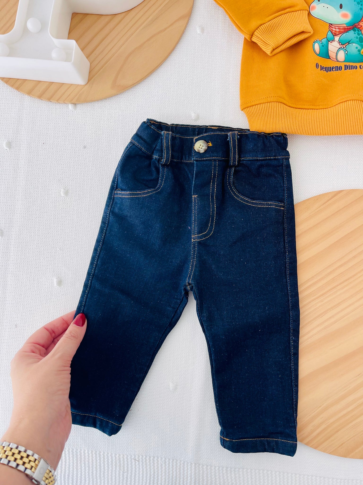 - Calças de ganga azul-marinho: Calças em denim escuro com pespontos de qualidade, perfeitas para combinar com a camisola e garantir um look completo e moderno.