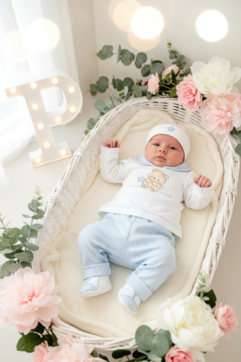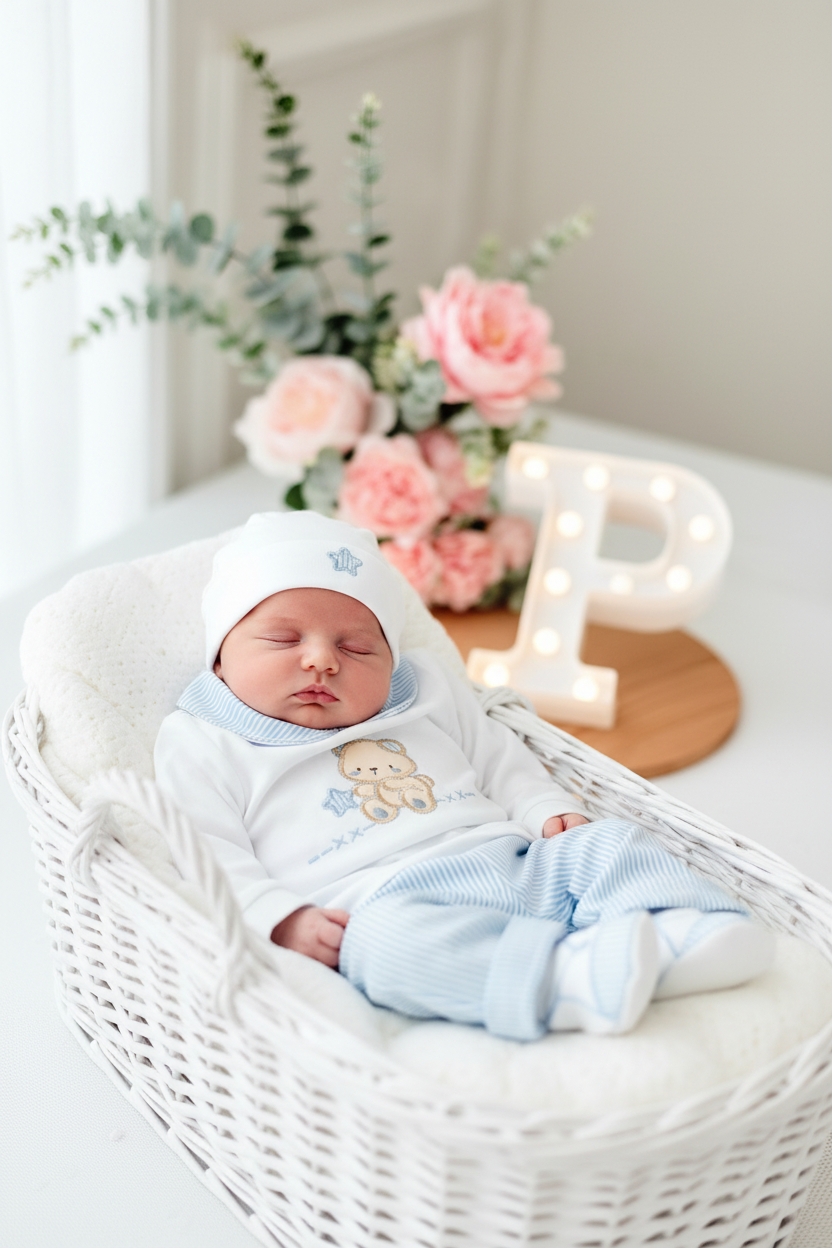 O design elegante e atemporal torna-o ideal tanto para o dia-a-dia como para ocasiões especiais, enquanto a praticidade das peças facilita a rotina de vestir o bebé.