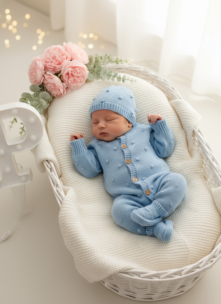 Conjunto de malha bolinhas 3 peças: macacão, gorro e carapins.