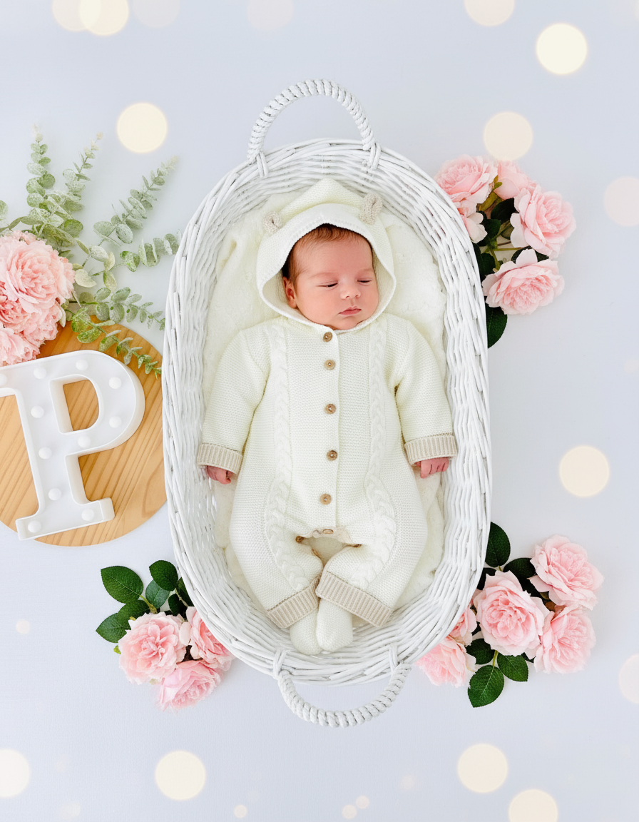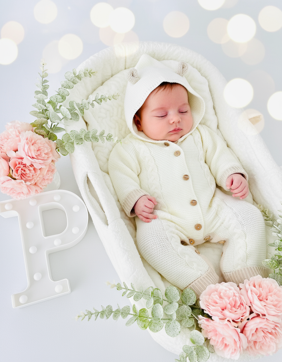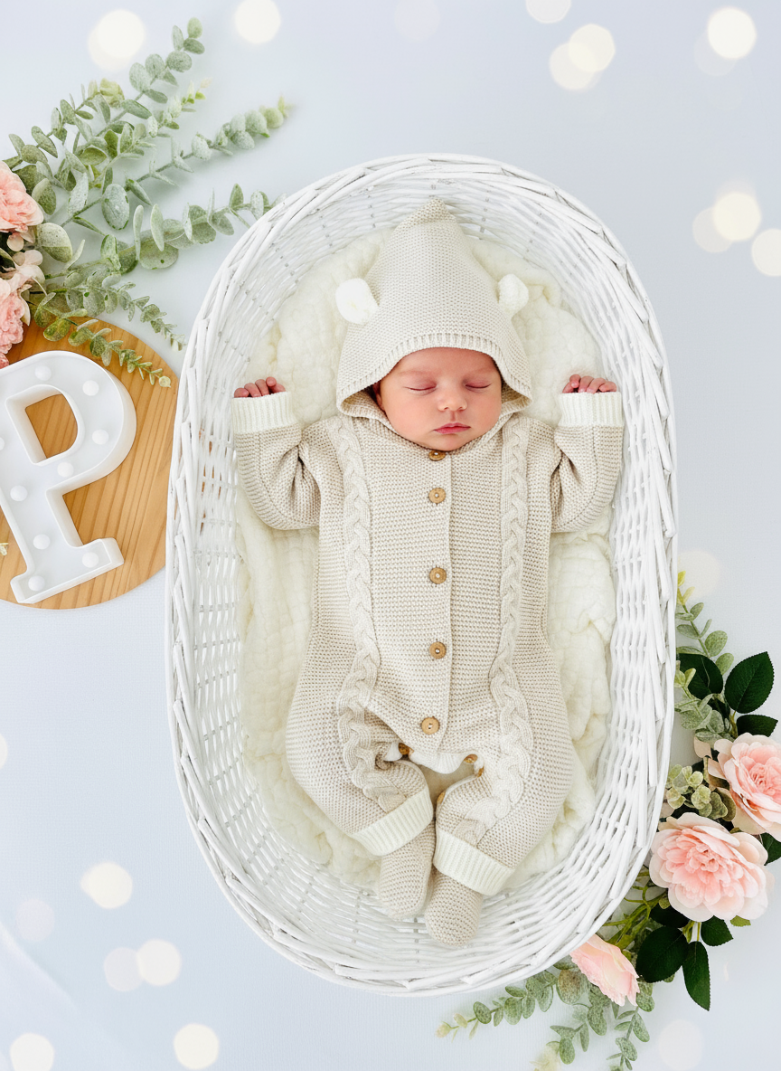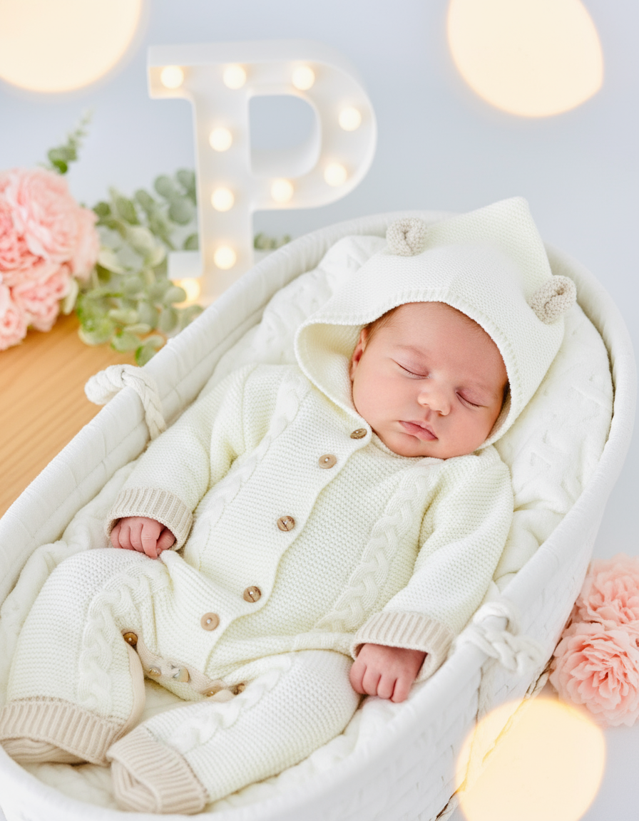 Um macacão absolutamente adorável em malha quentinha e suave, perfeito para manter o seu bebé confortável, quentinho e irresistivelmente fofo durante os meses mais frios. O capuz com orelhinhas torna esta peça ainda mais especial e encantadora!