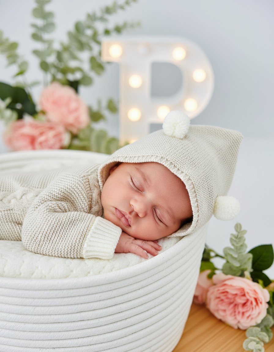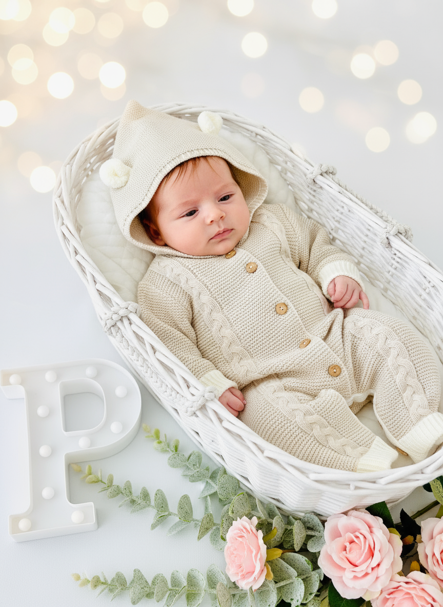 Os primeiros passeios de outono, as manhãs fresquinhas de inverno, aquela sessão fotográfica adorável que ficará para sempre, os momentos aconchegantes em casa. Este macacão foi pensado para criar memórias ternurentas enquanto mantém o seu bebé quentinho, confortável e absolutamente irresistível. O capuz com orelhinhas pompom adiciona um toque de fofura que vai derreter corações!
