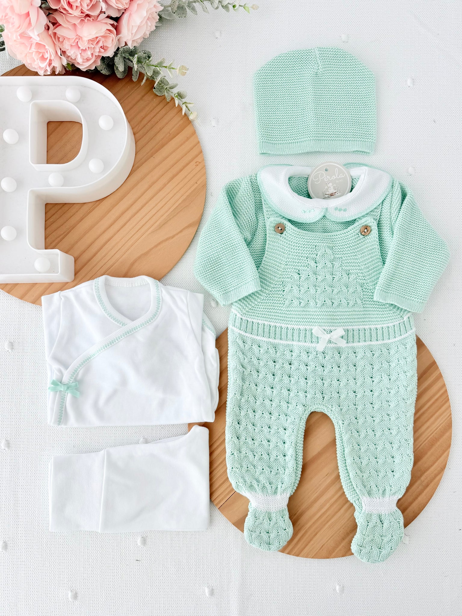 • Gorro de malha verde menta – Mantém o bebé quentinho e protegido desde o primeiro dia