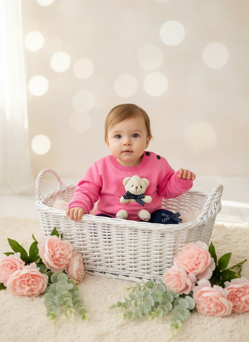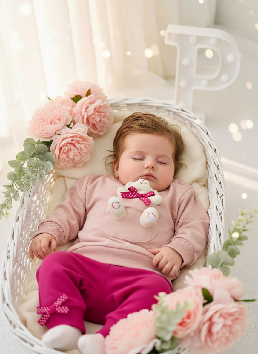 Conjunto de 3 peças muito quentinho: calças, camisola e peluche removível do bolso.