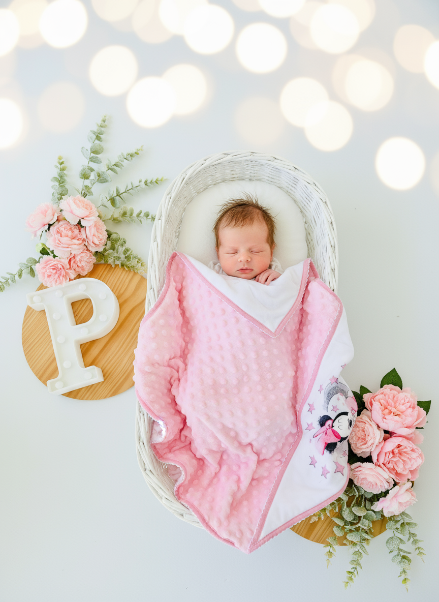 Manta quentinha (estilo edredão) com o desenho da Minnie ou do Mickey estampados.