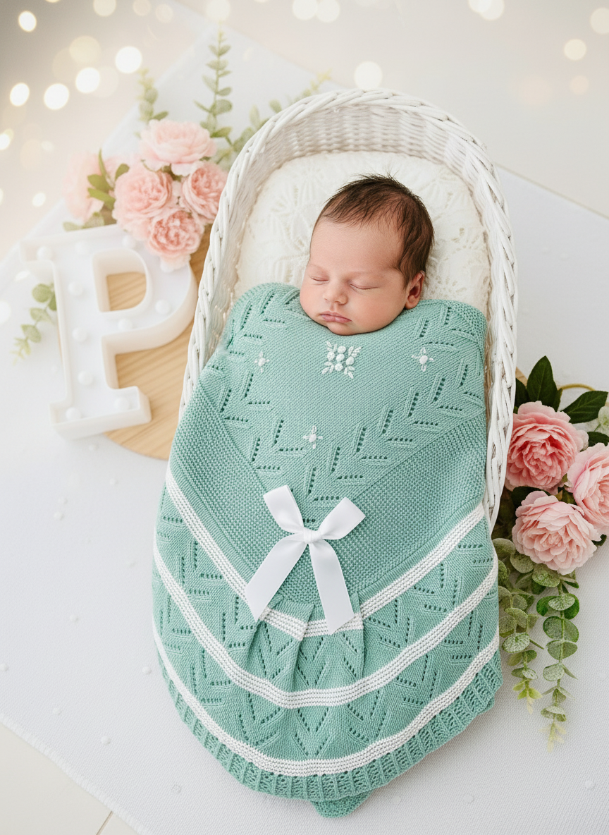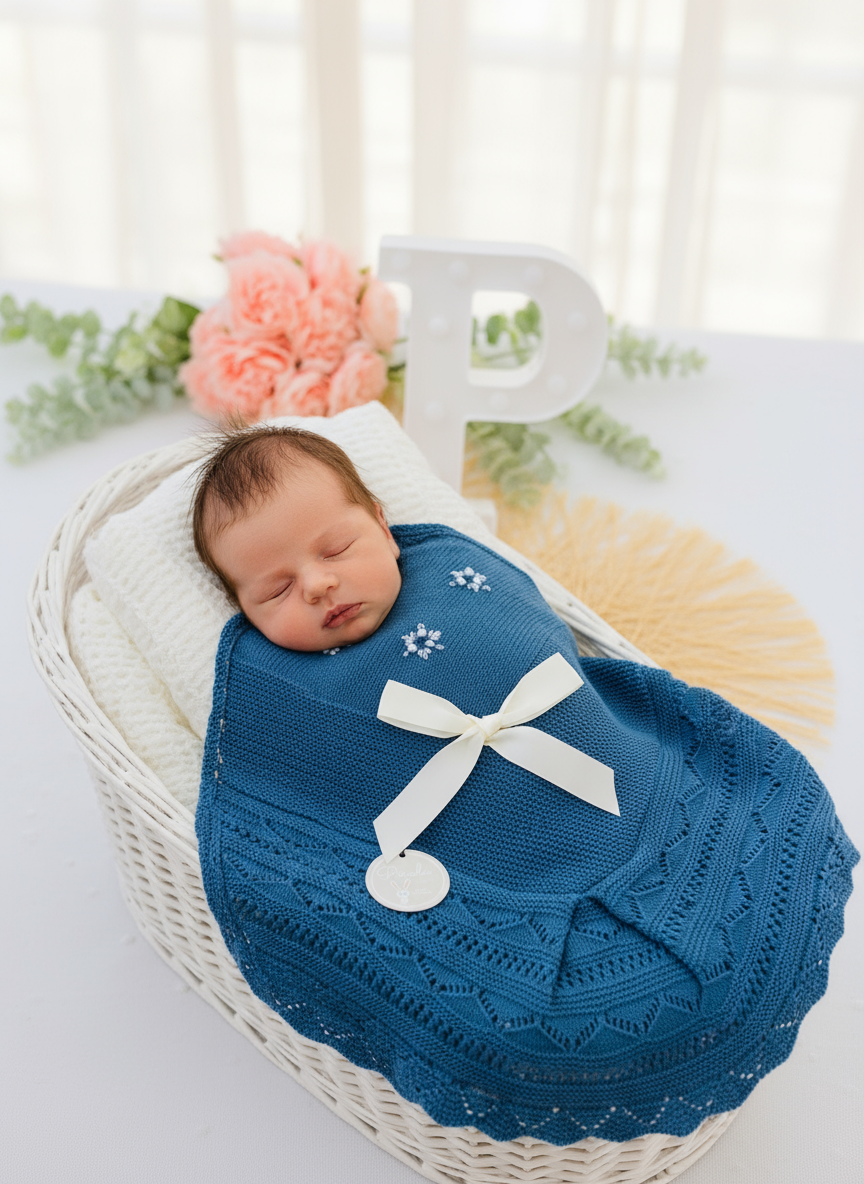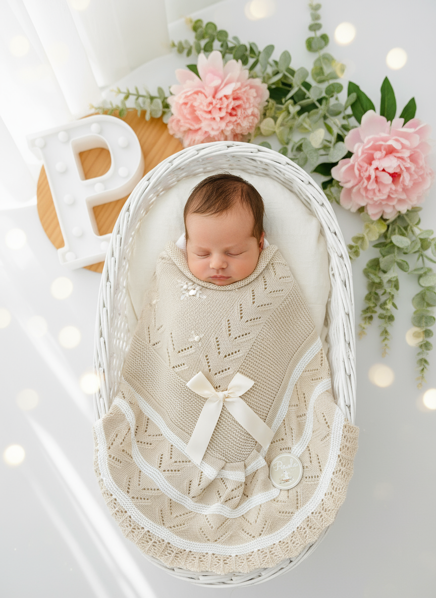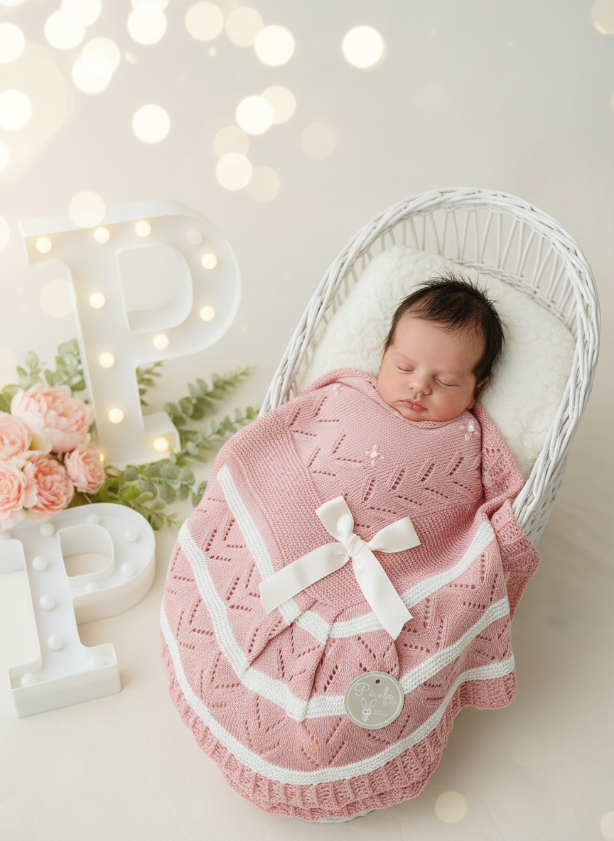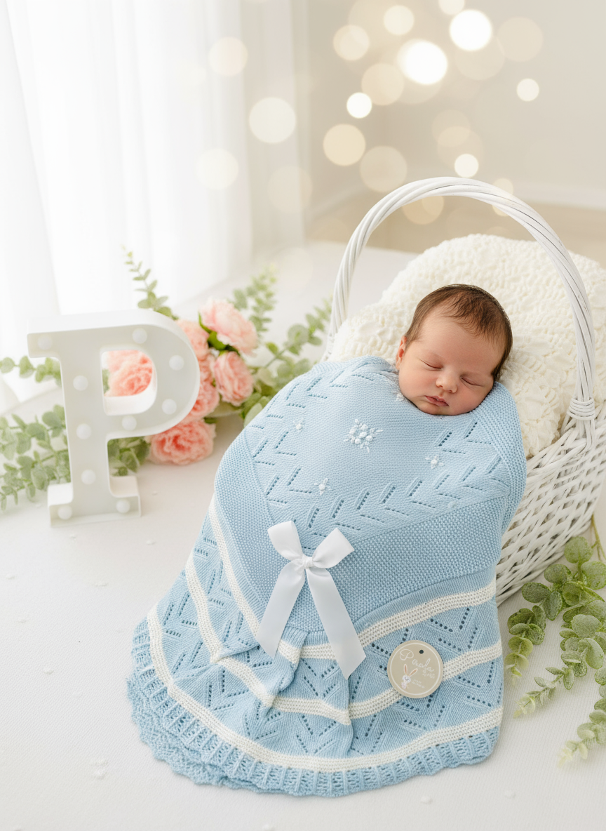 Envolva o seu bebé no conforto supremo desta manta/xaile em malha excepcionalmente quentinha e aconchegante.