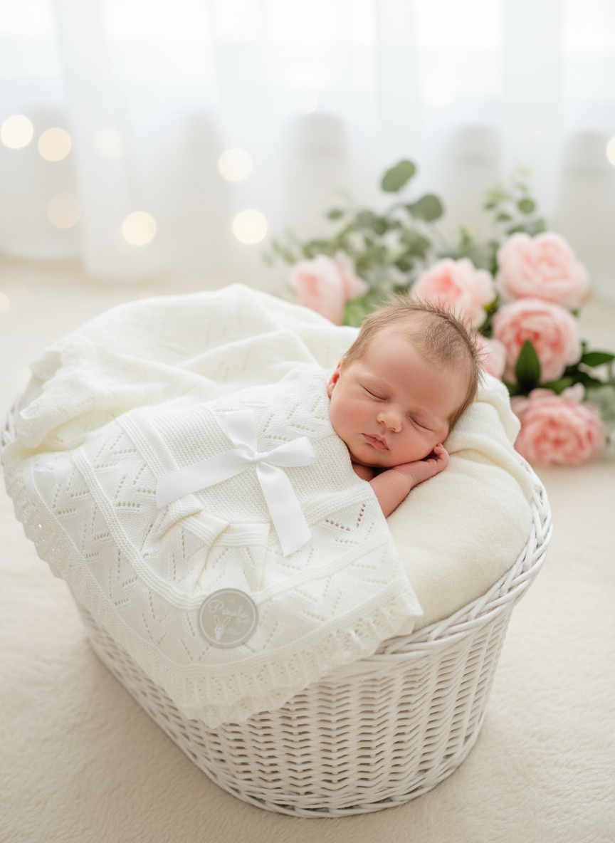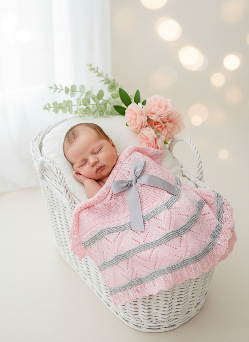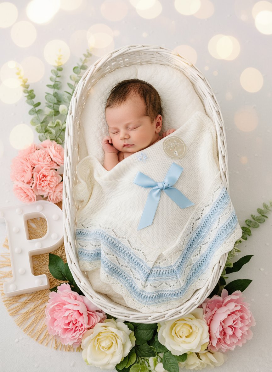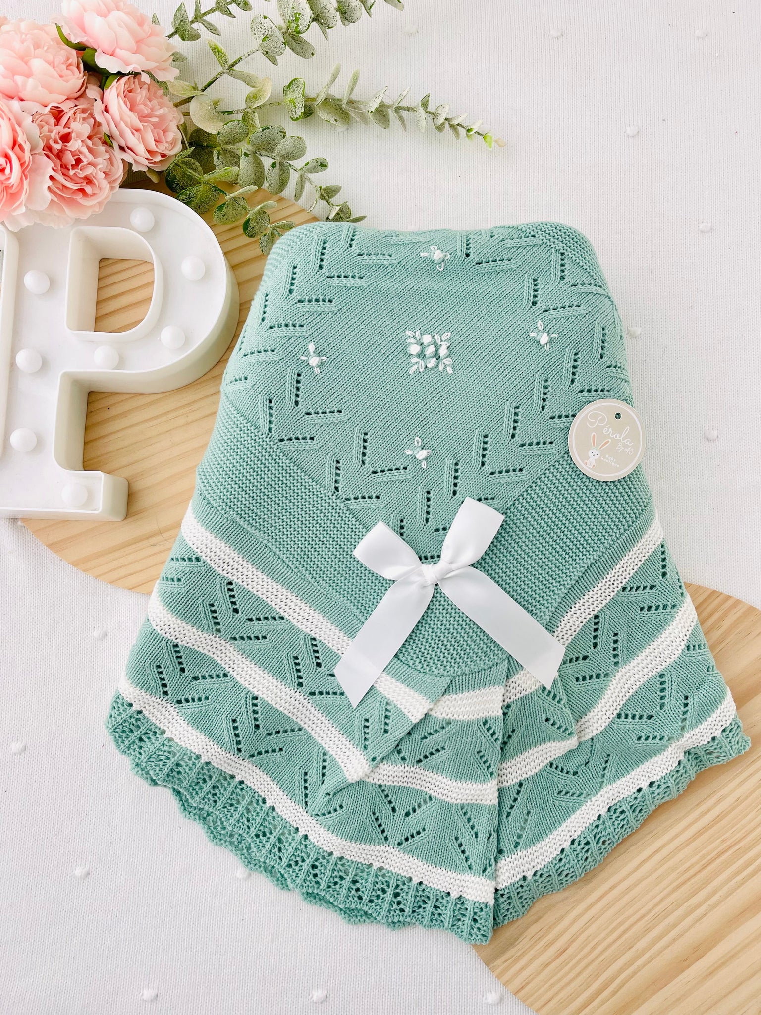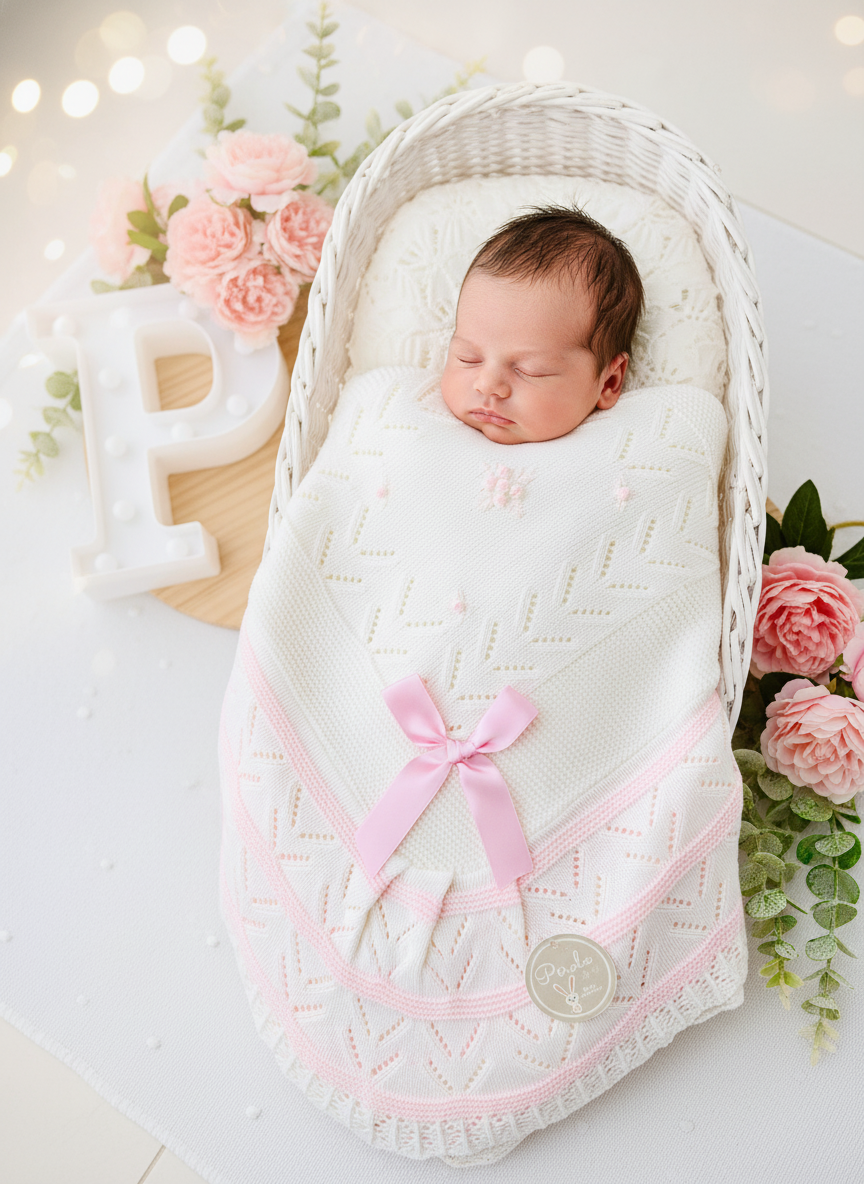 Envolva o seu bebé no conforto supremo desta manta/xaile em malha excepcionalmente quentinha e aconchegante.