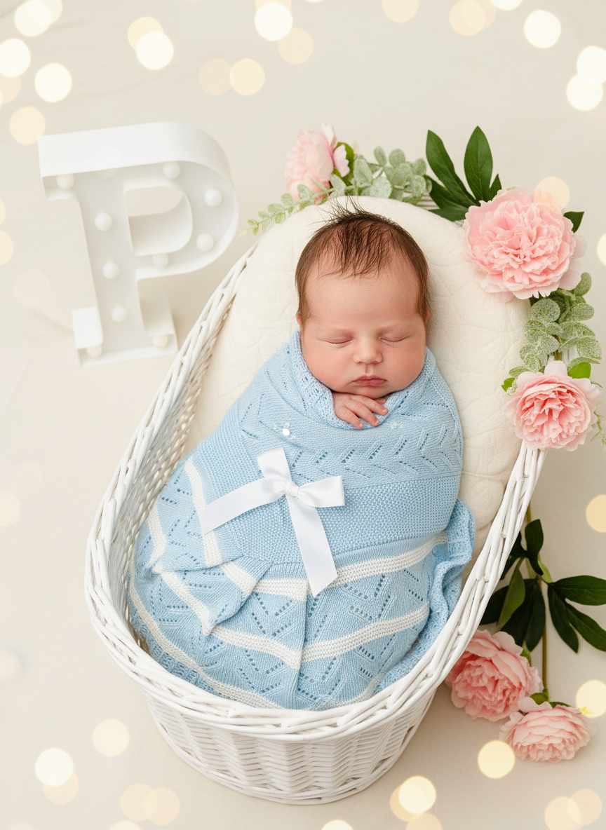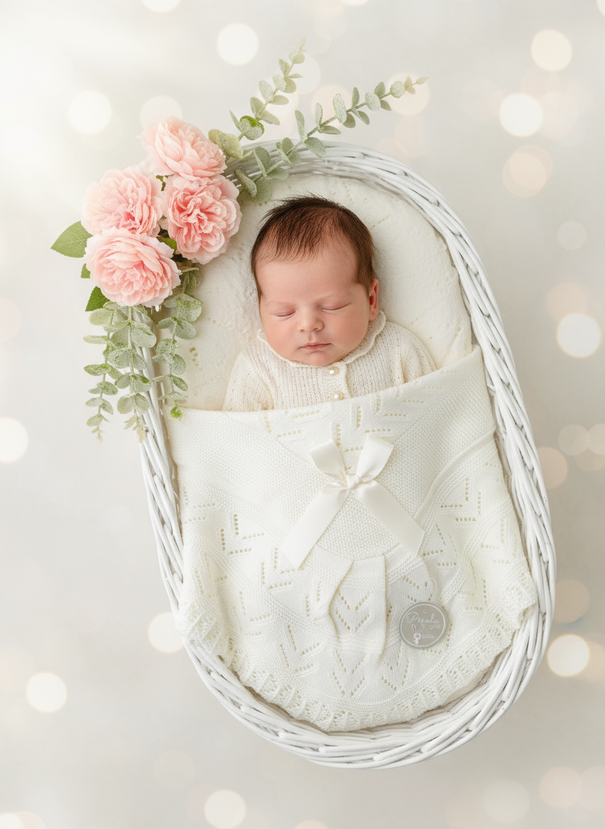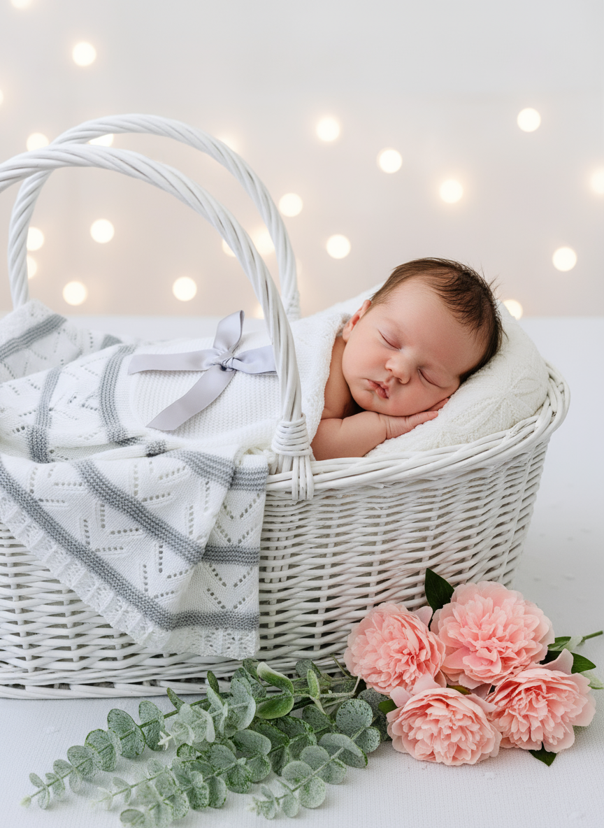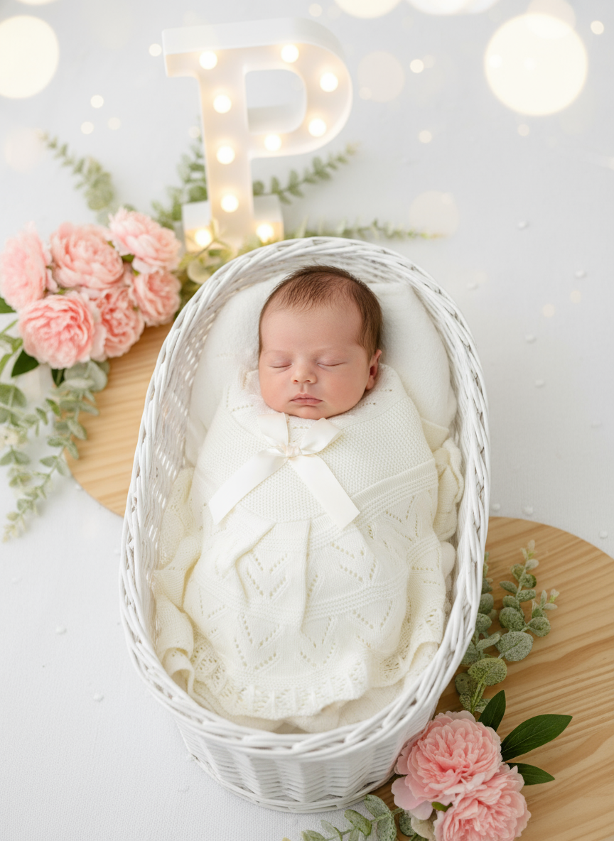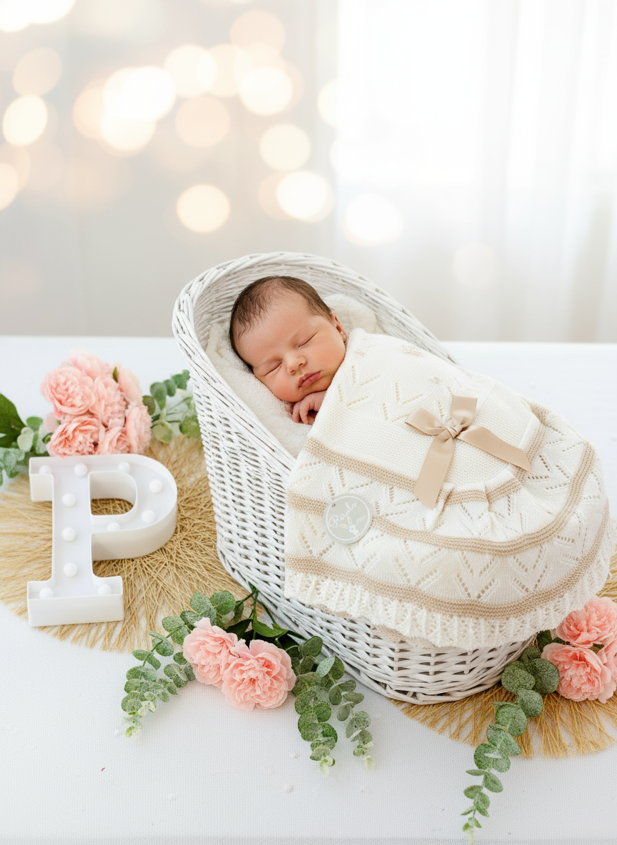 Envolva o seu bebé no conforto supremo desta manta/xaile em malha excepcionalmente quentinha e aconchegante.