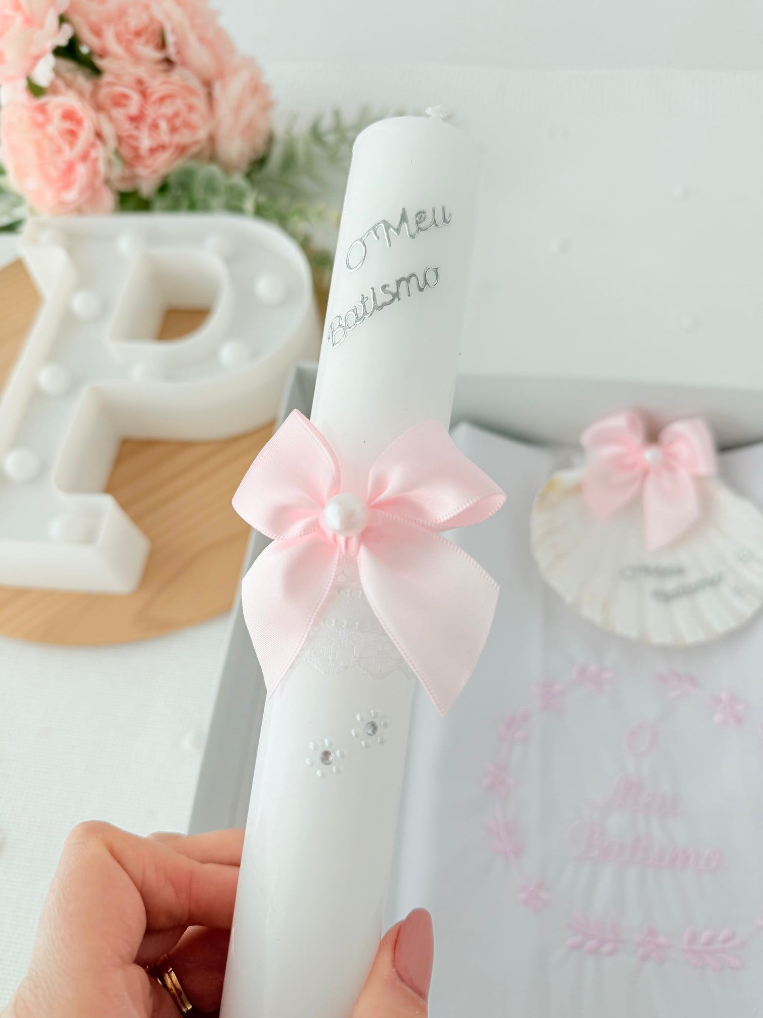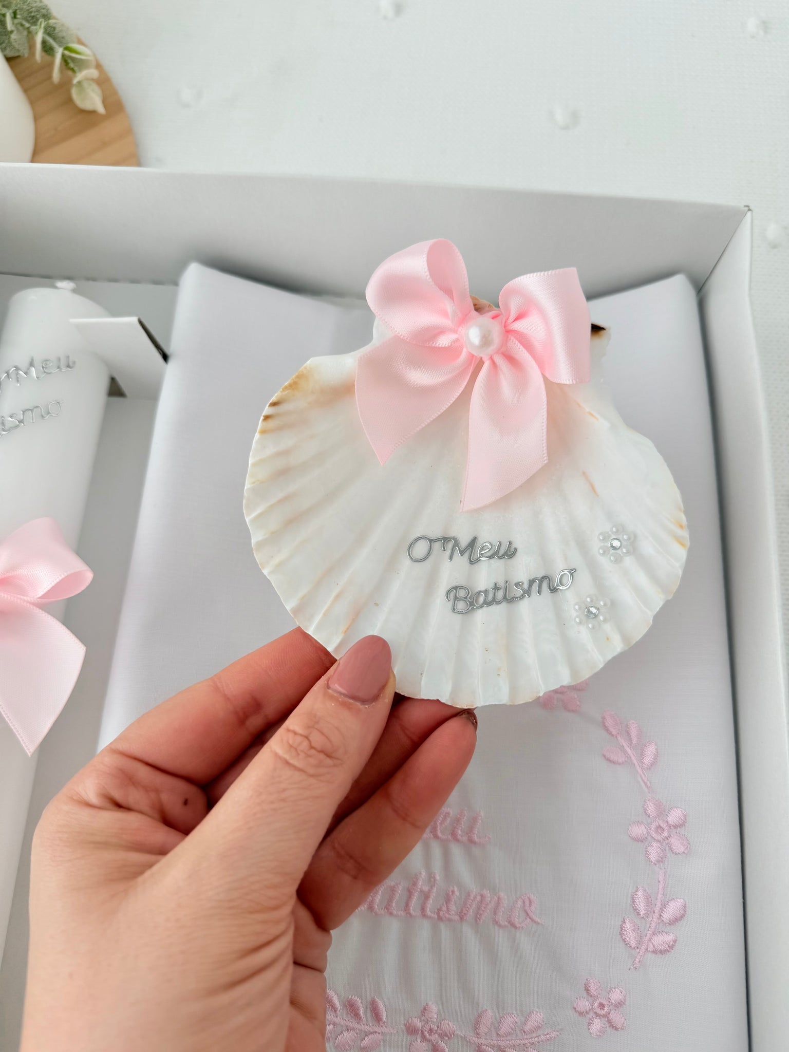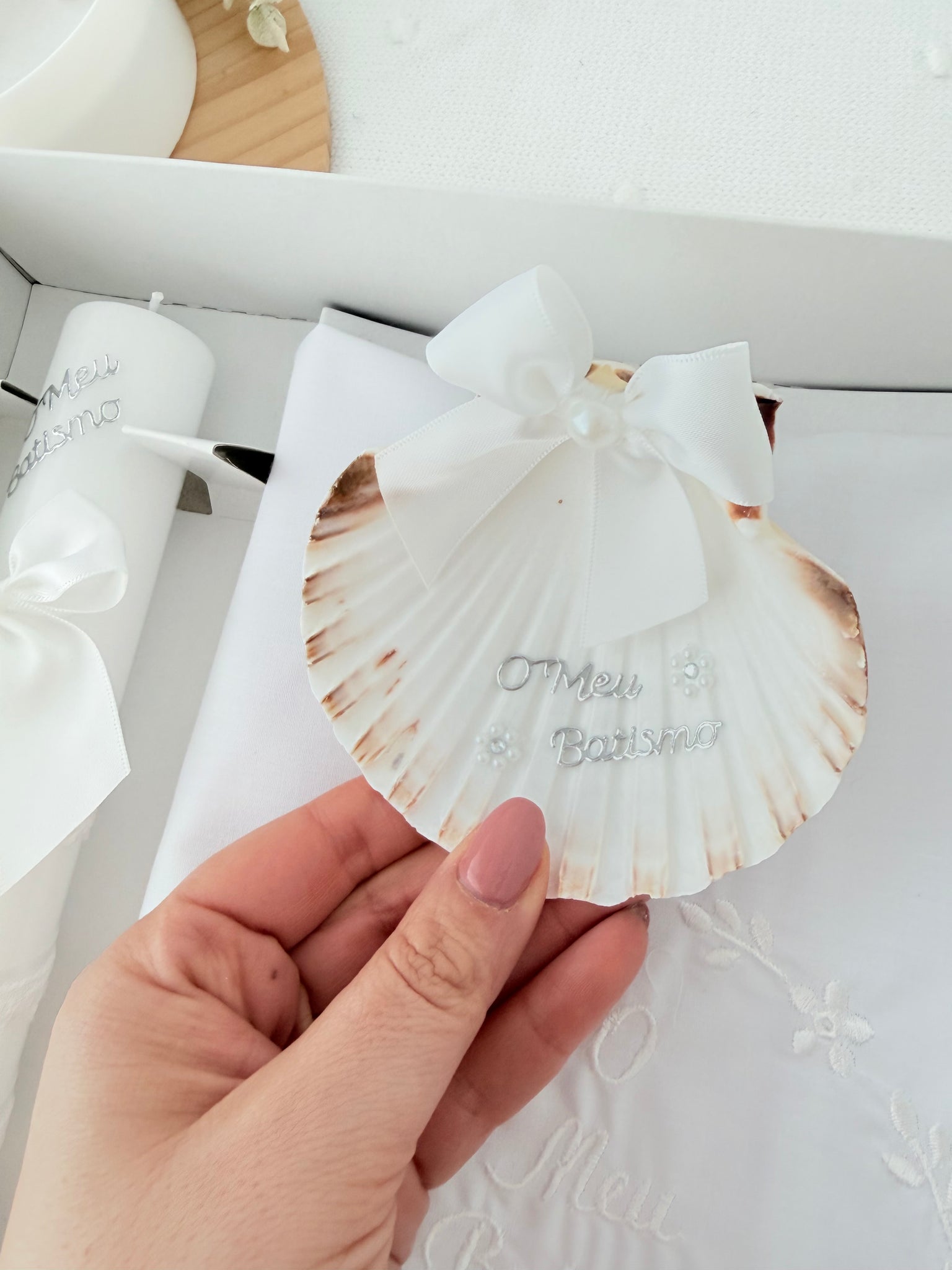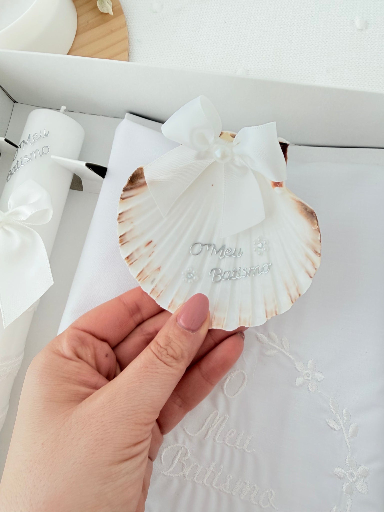 Conjunto para Batizado: vela, toalha e concha Batizado - Ramos