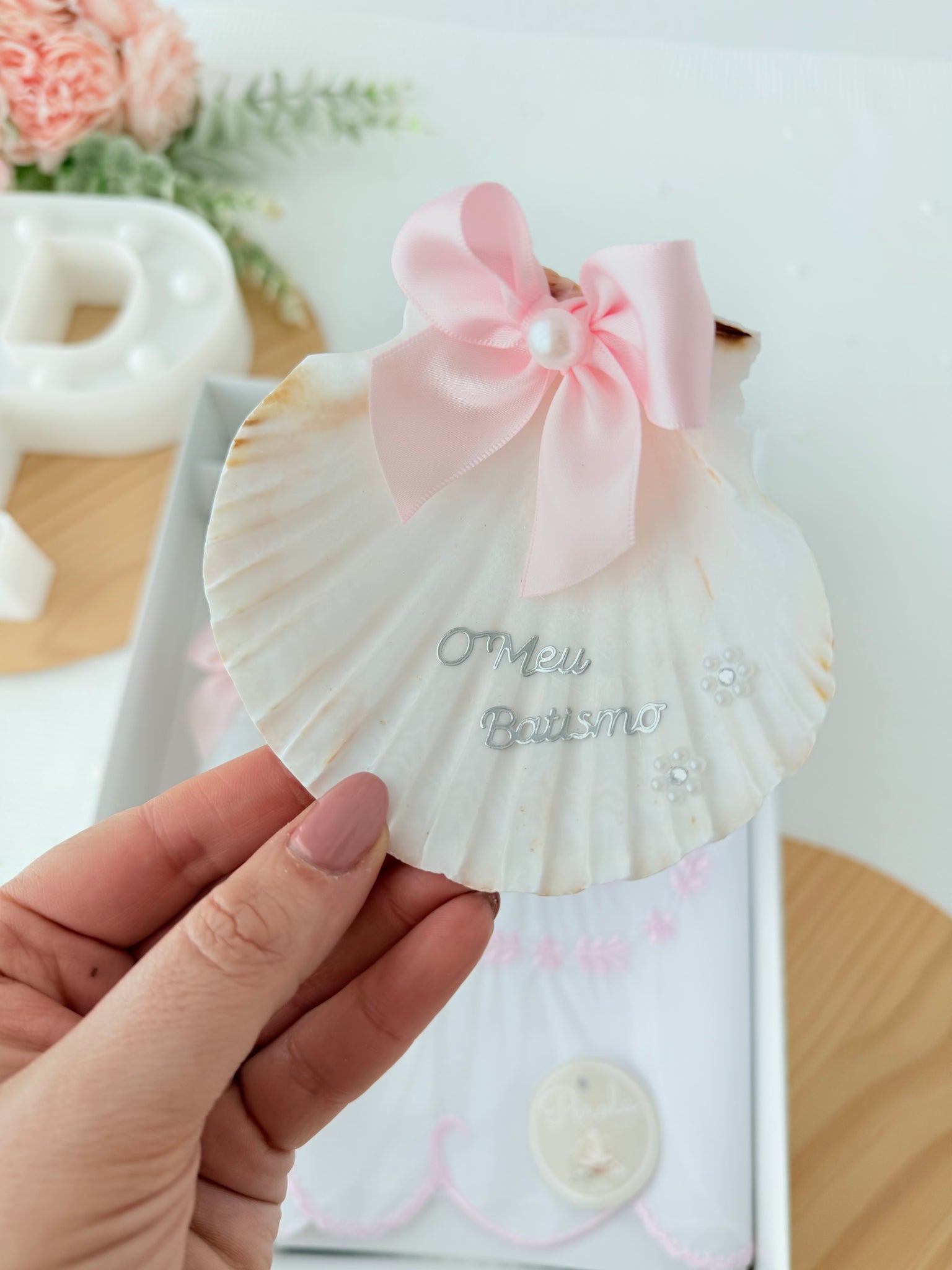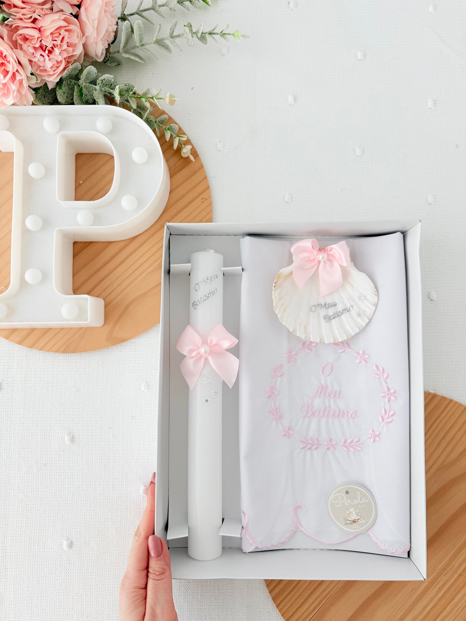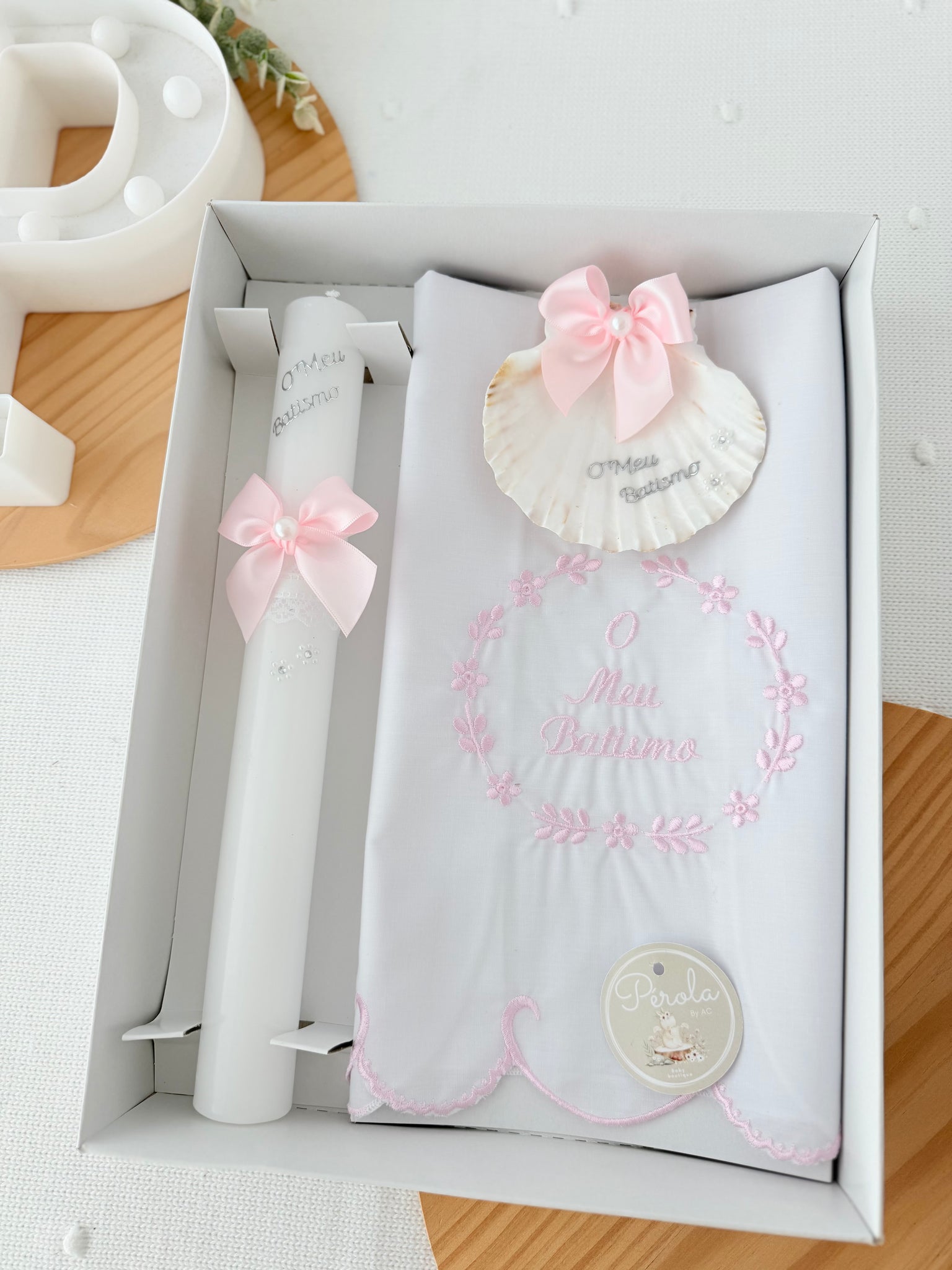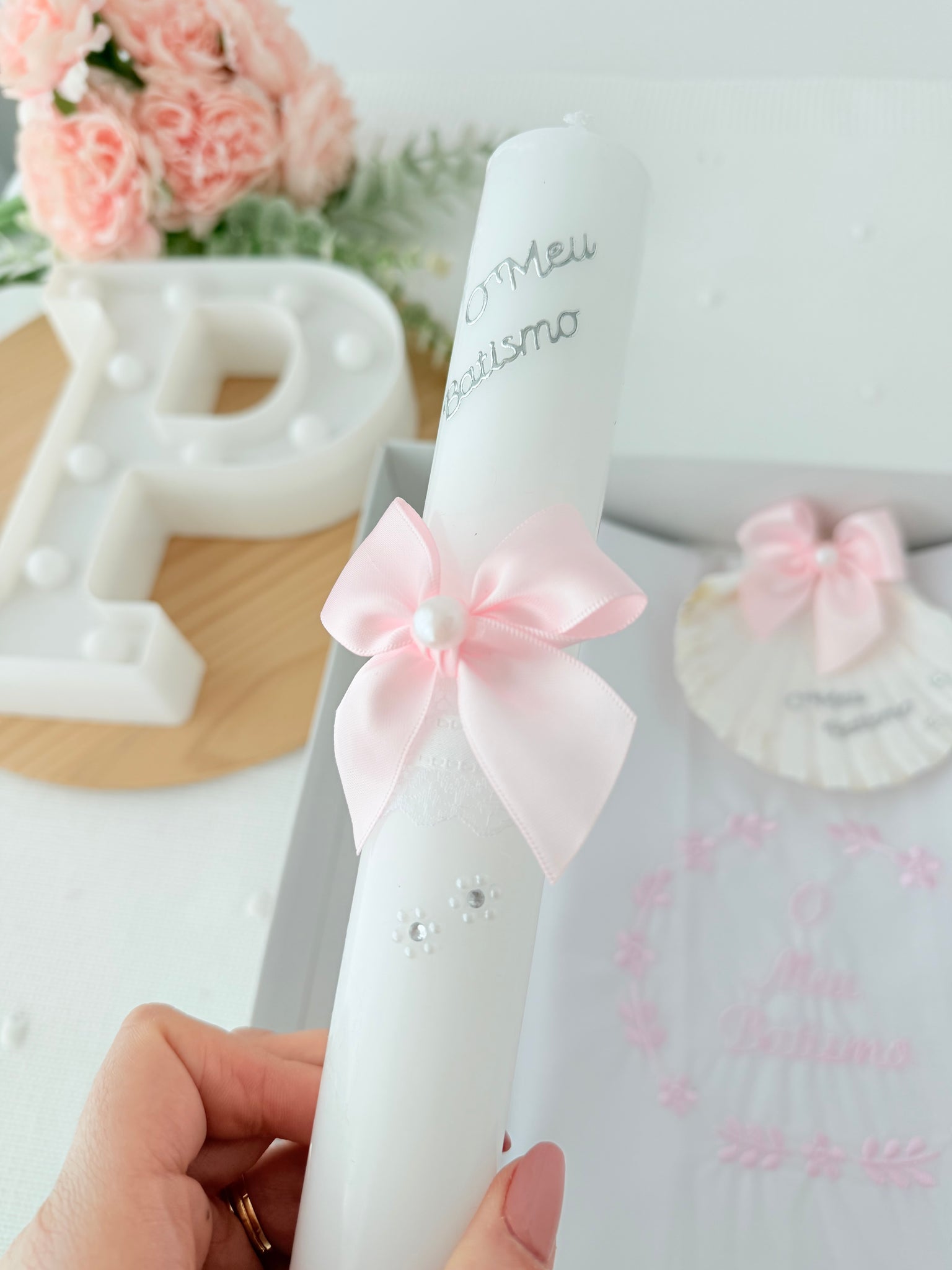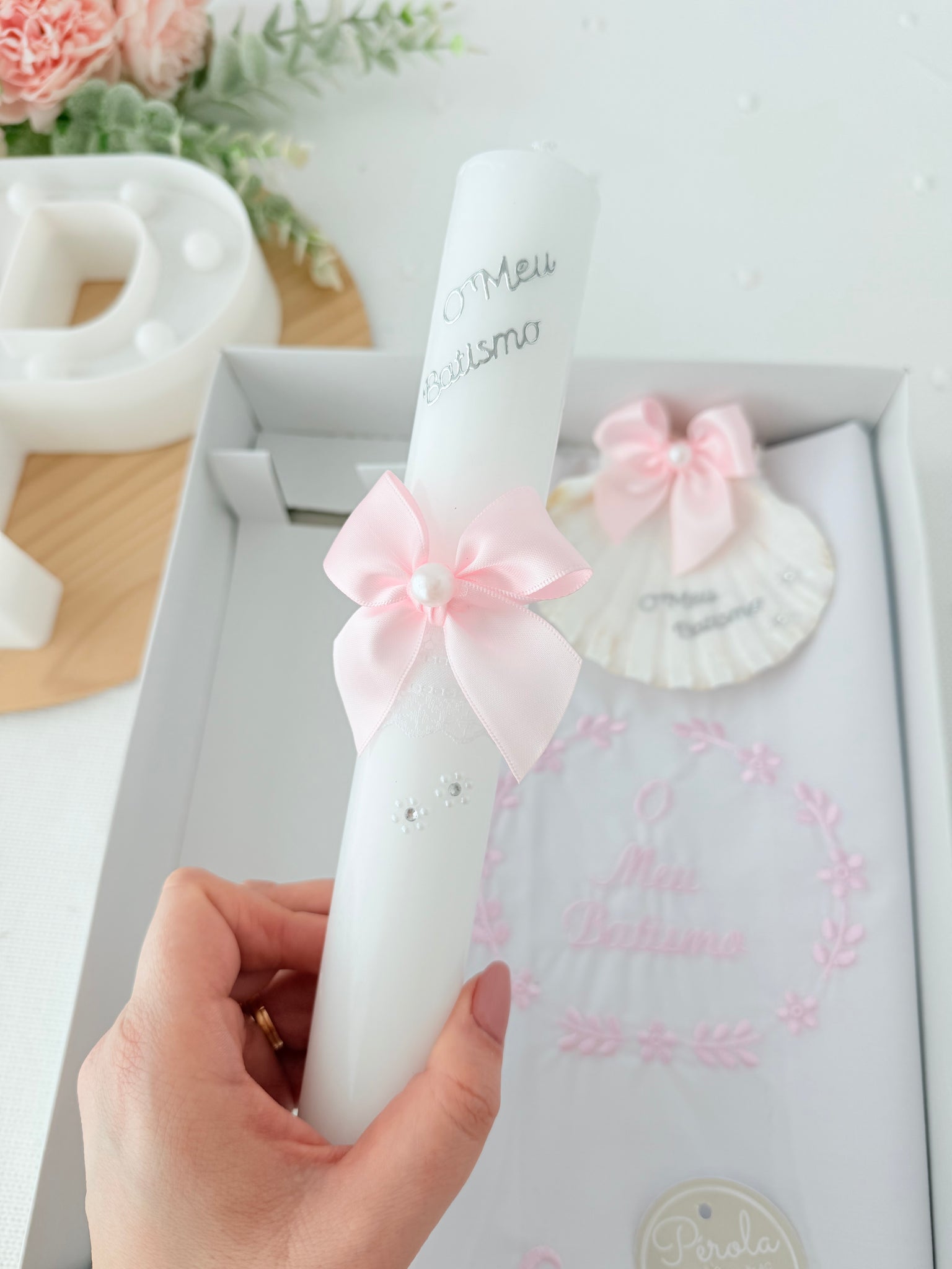 Conjunto para Batizado: vela, toalha e concha Batizado - Ramos