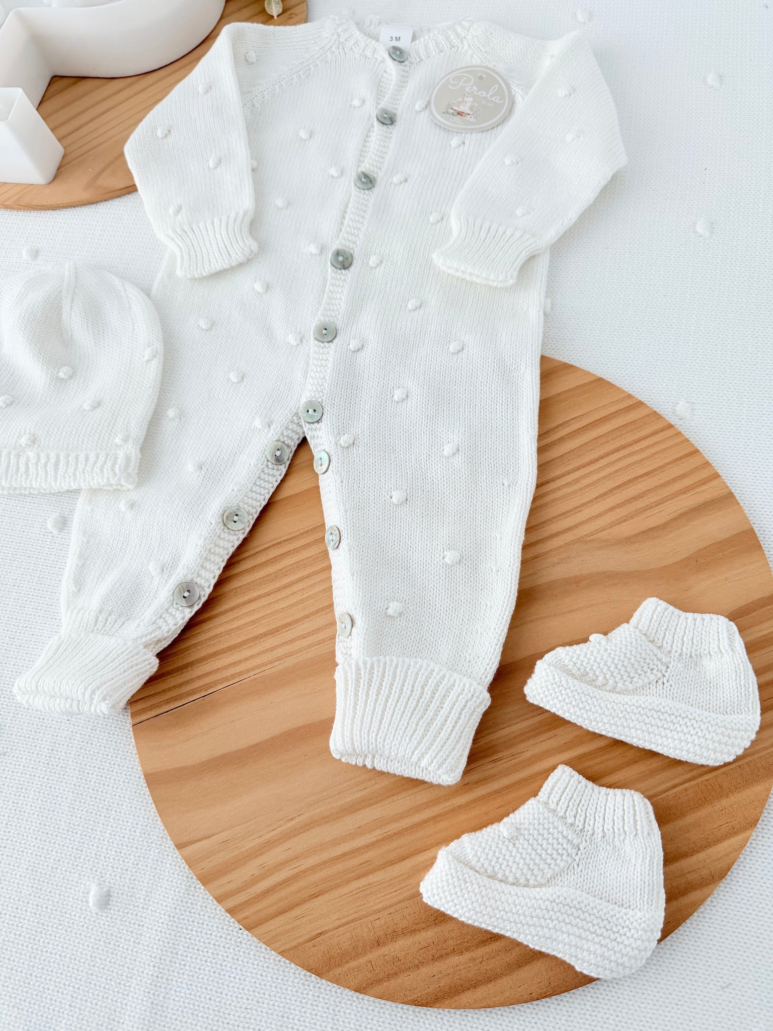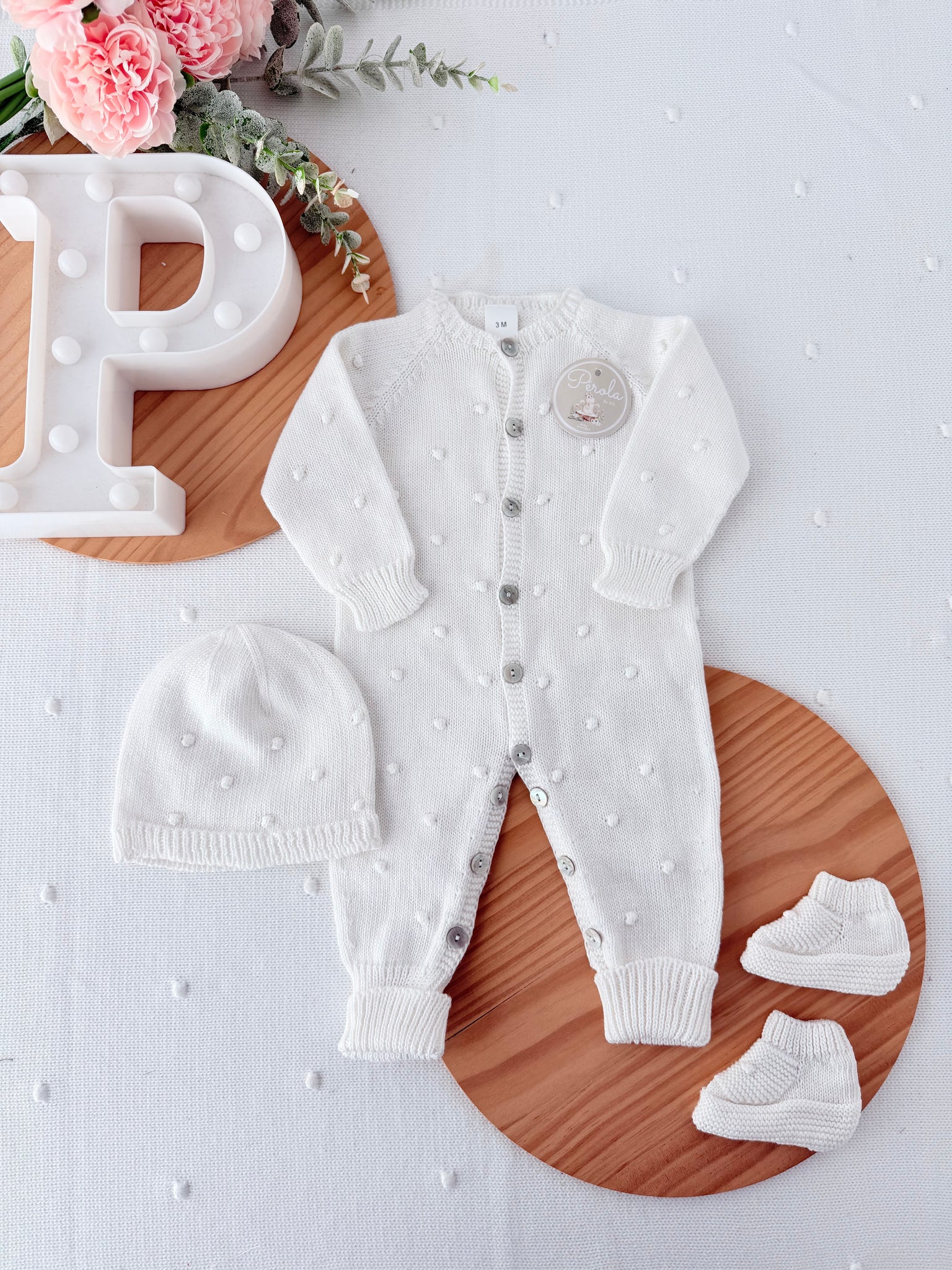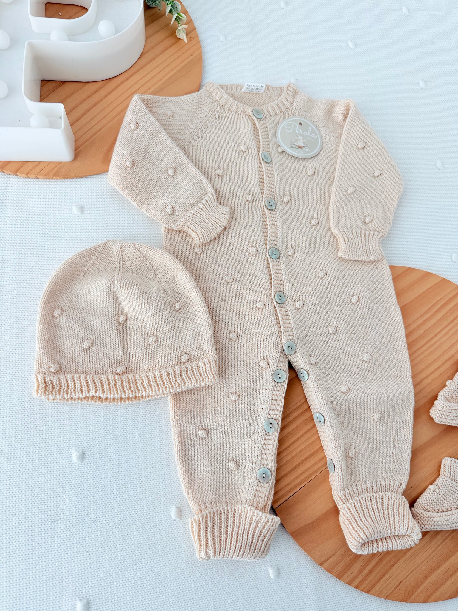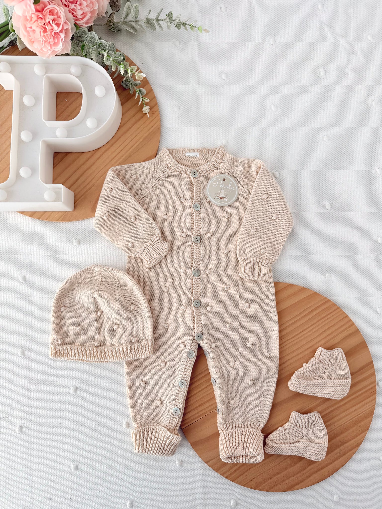 Este encantador conjunto de malha de algodão apresenta um bonito efeito de bolinhas em relevo, perfeito para manter o teu bebé quentinho e elegante. O conjunto completo inclui macacão, gorro e carapins coordenados, ideal para os dias mais frescos.