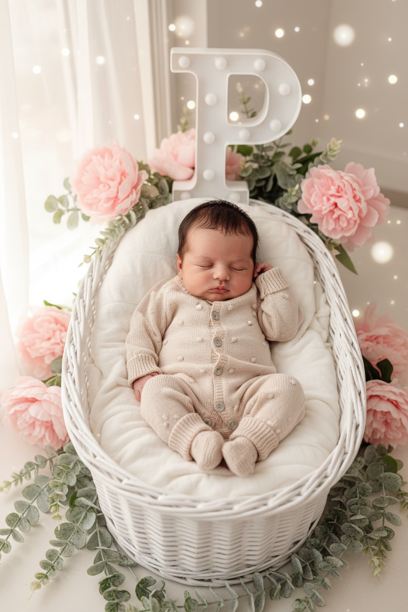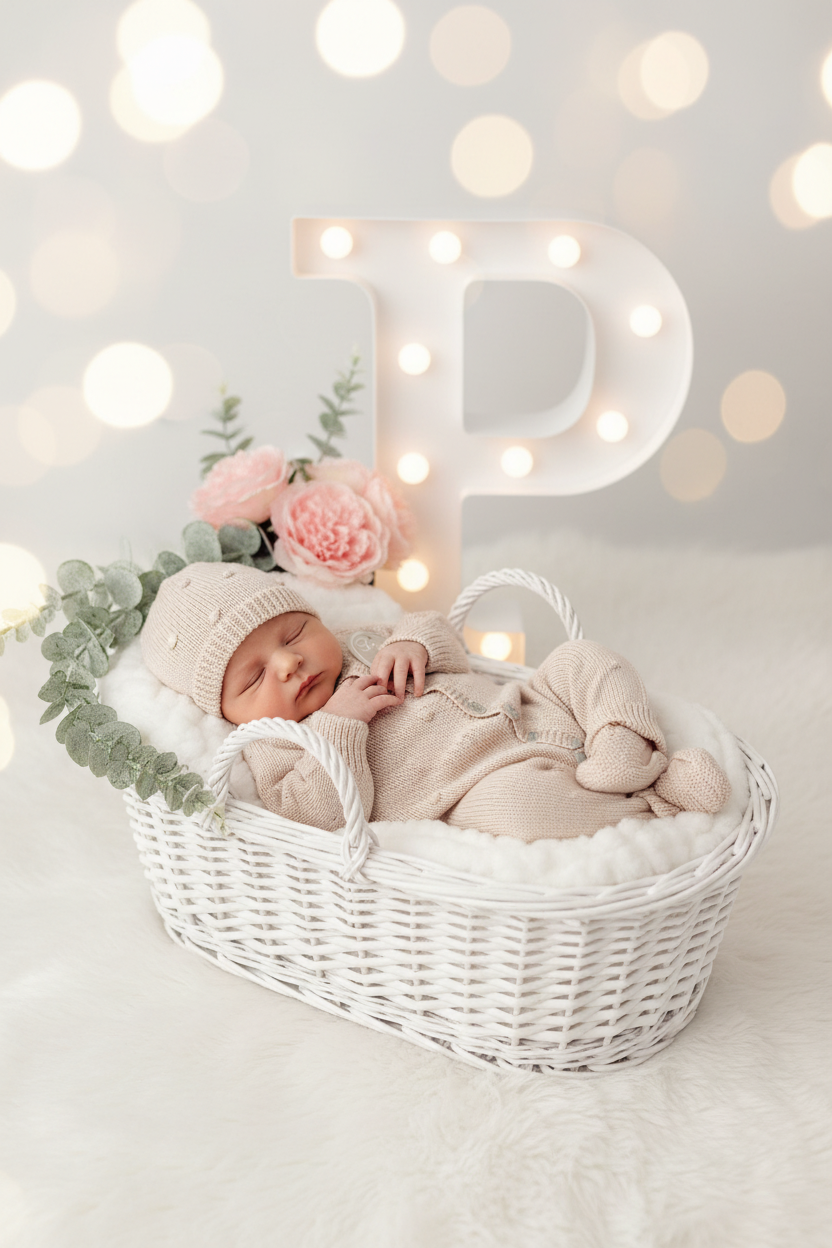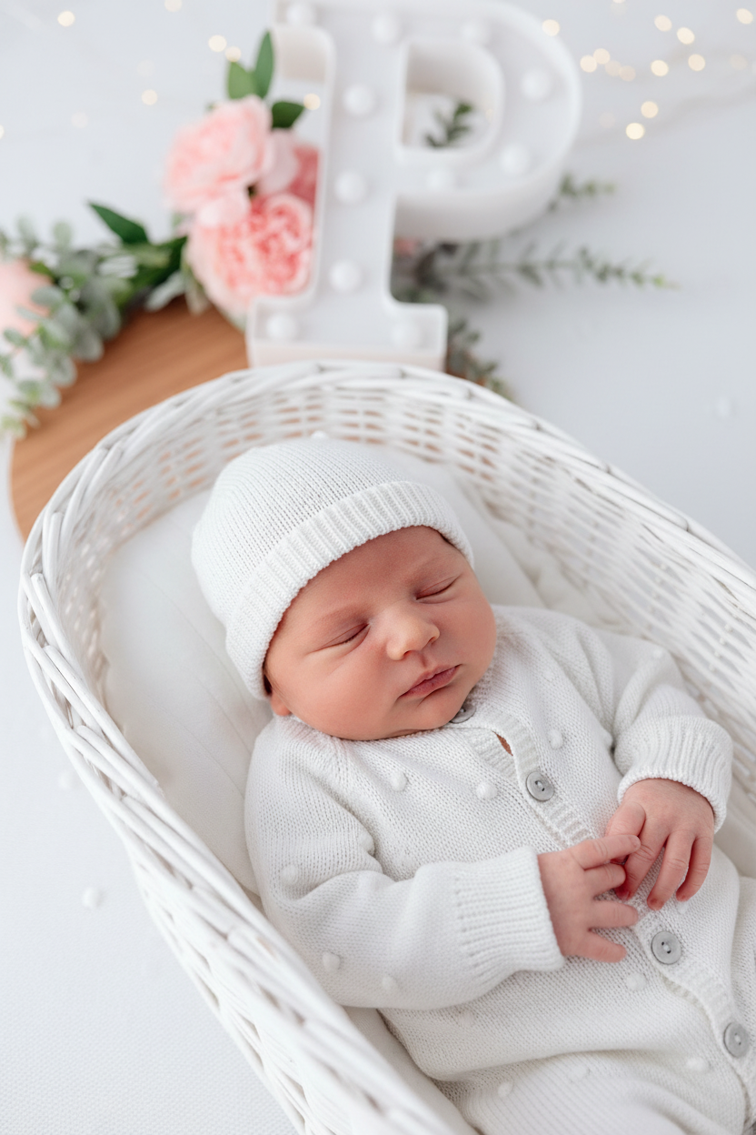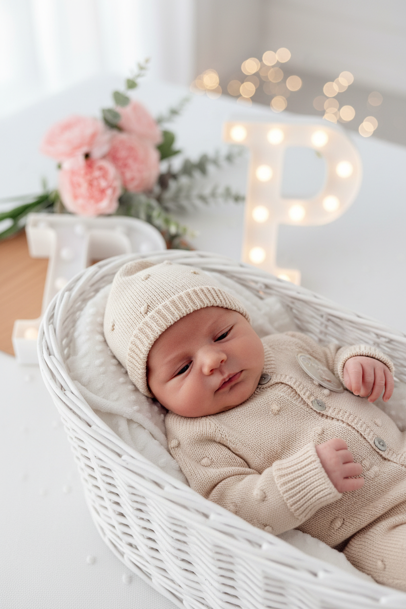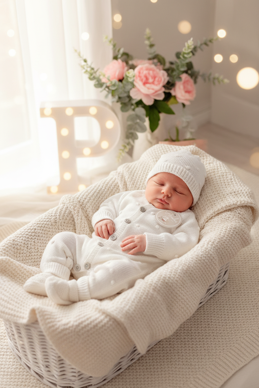 Este encantador conjunto de malha de algodão apresenta um bonito efeito de bolinhas em relevo, perfeito para manter o teu bebé quentinho e elegante. O conjunto completo inclui macacão, gorro e carapins coordenados, ideal para os dias mais frescos.