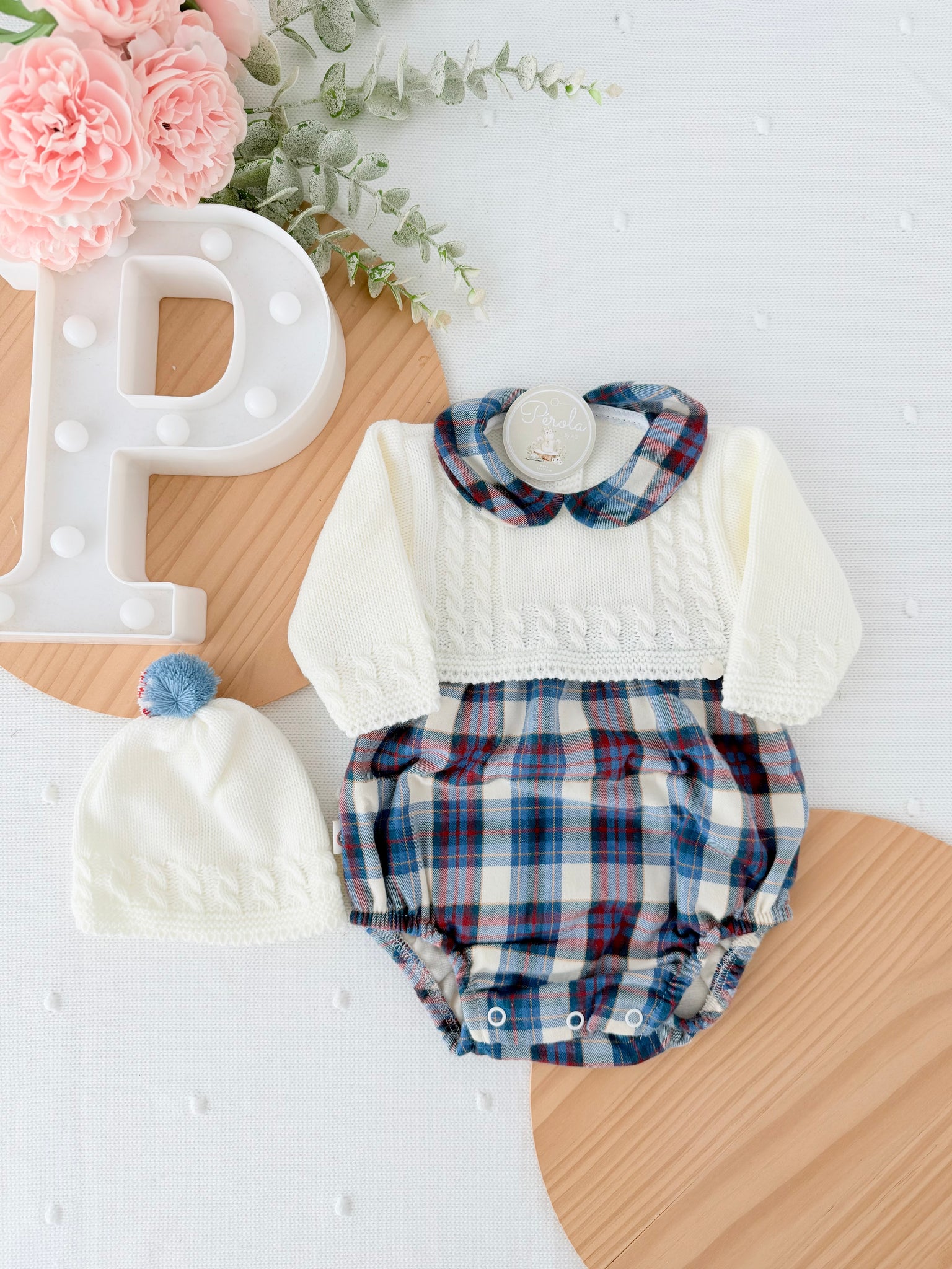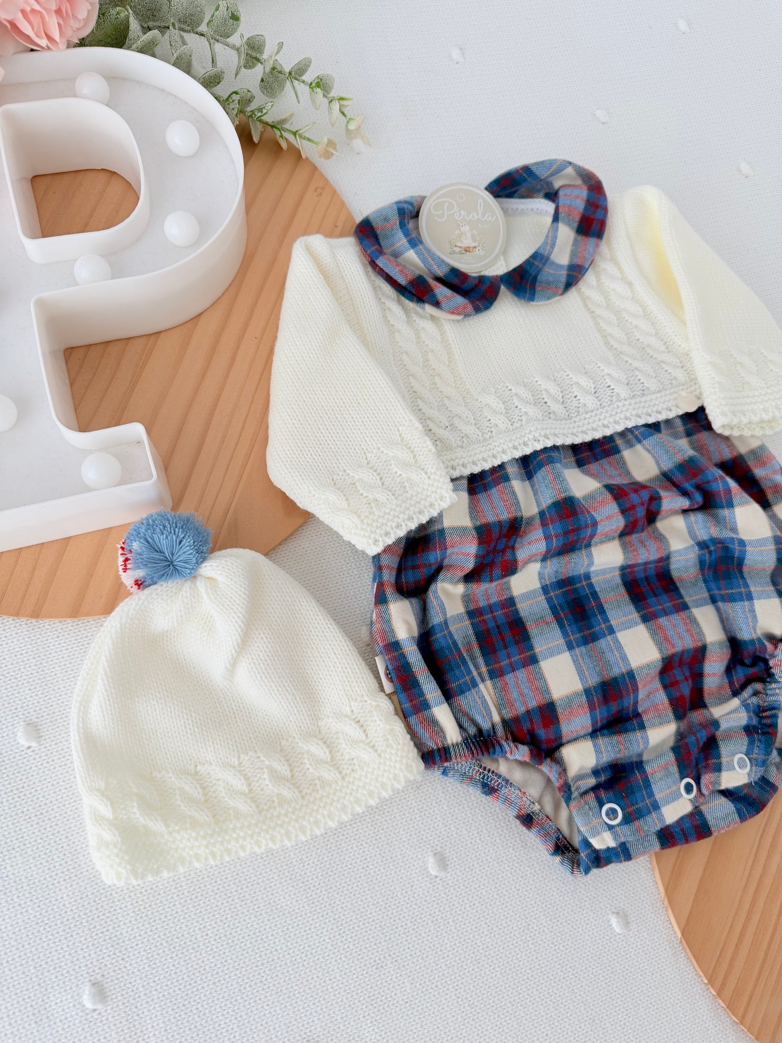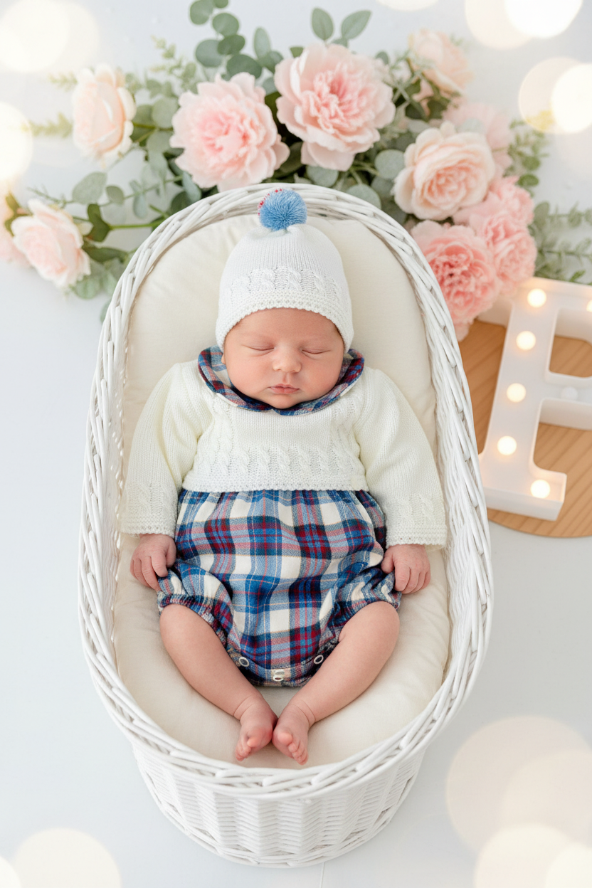 Um conjunto encantador que combina elegância e conforto para os primeiros dias do seu bebé. Este conjunto inclui fofo e gorro coordenados, confeccionados em tecidos macios e delicados.