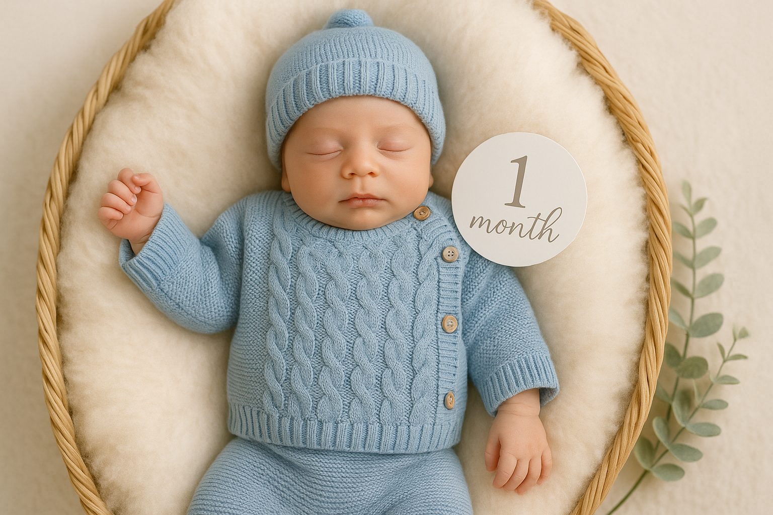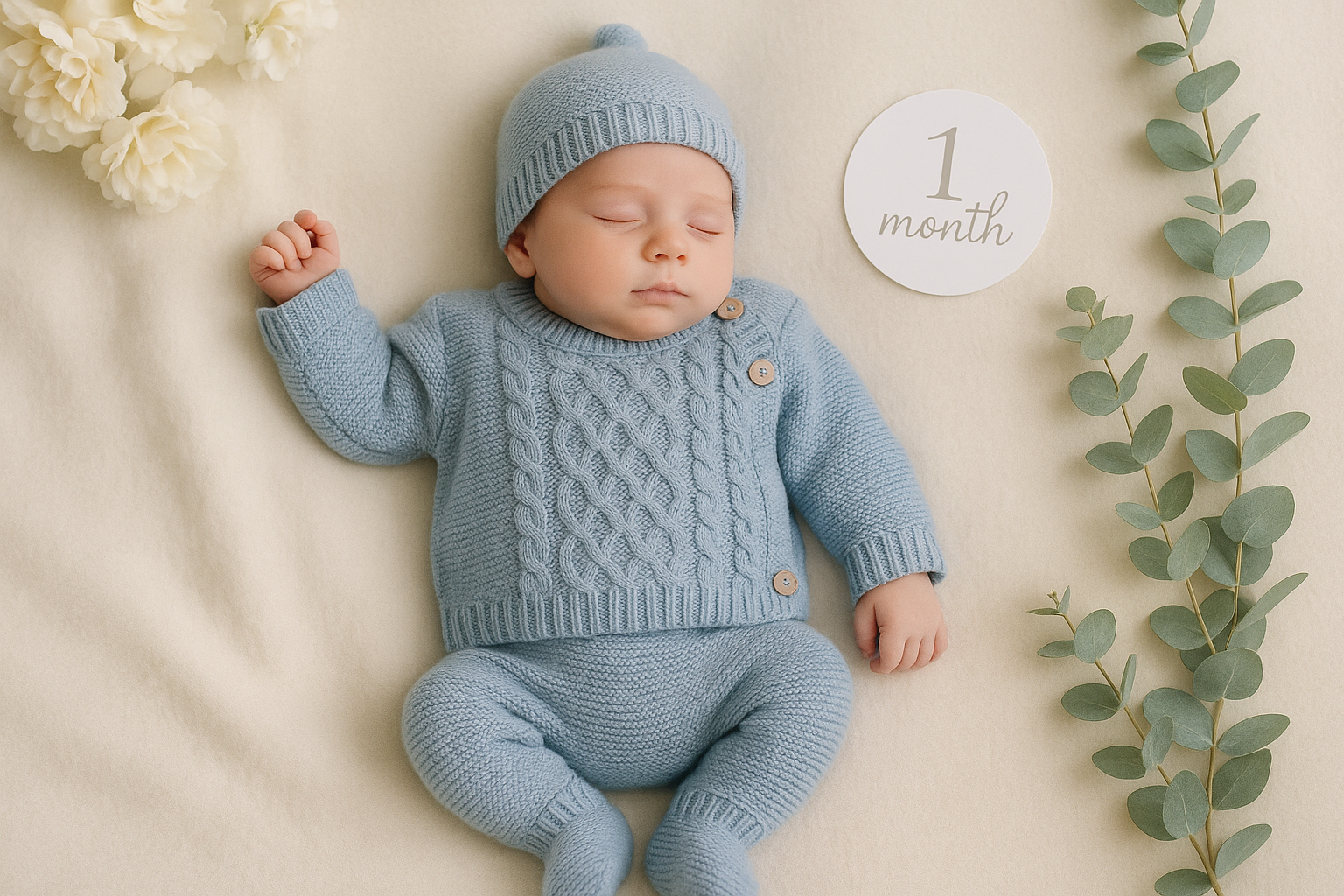 Conjunto de malha azul de 3 peças: camisola com botões em madeira, calças e gorro.