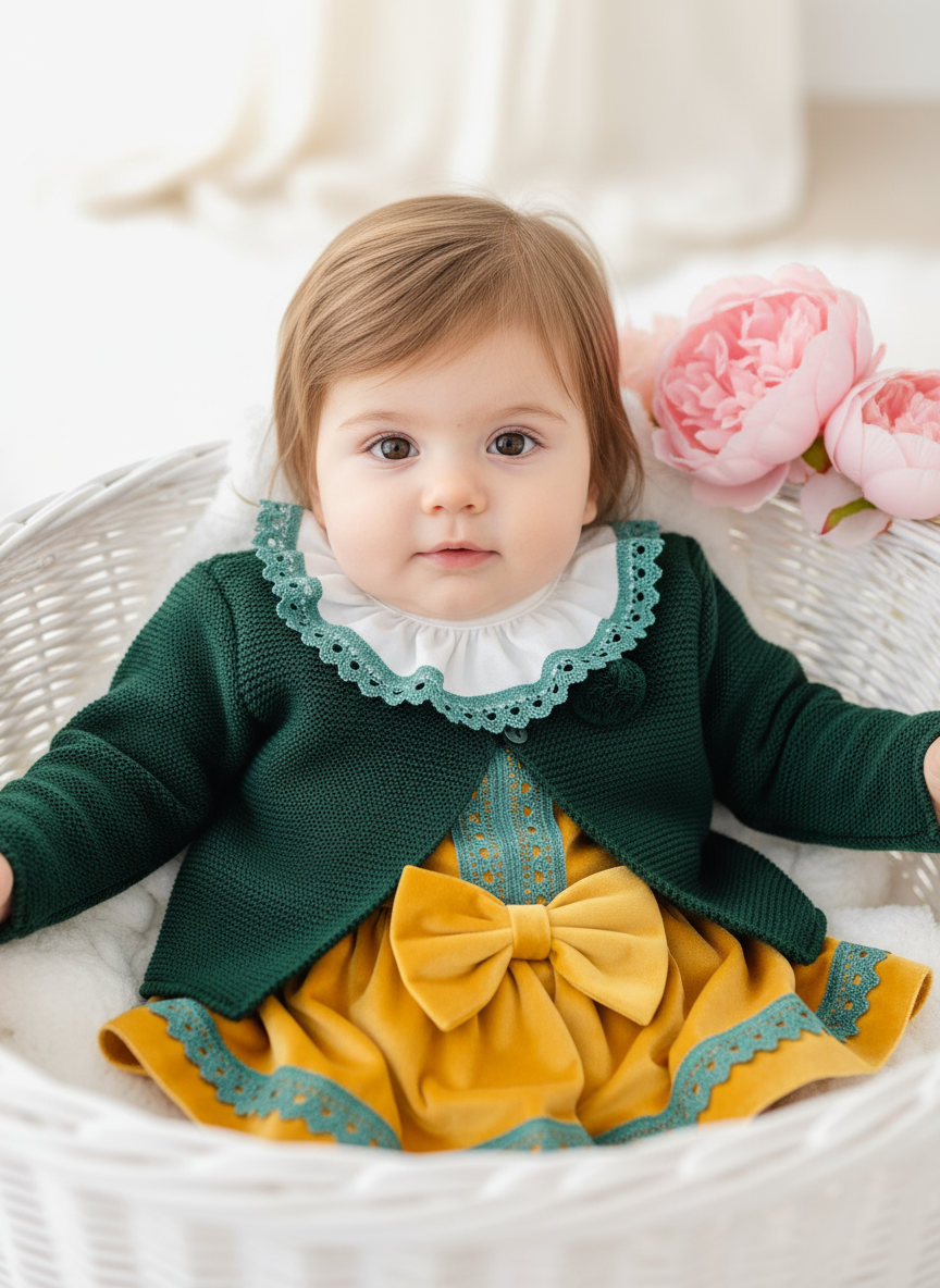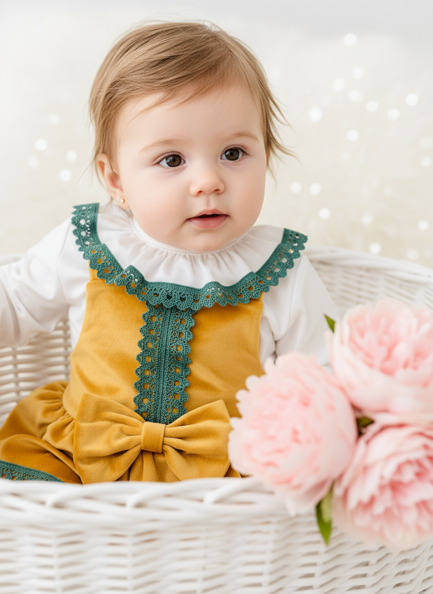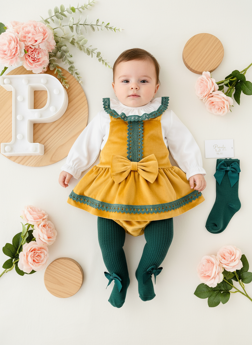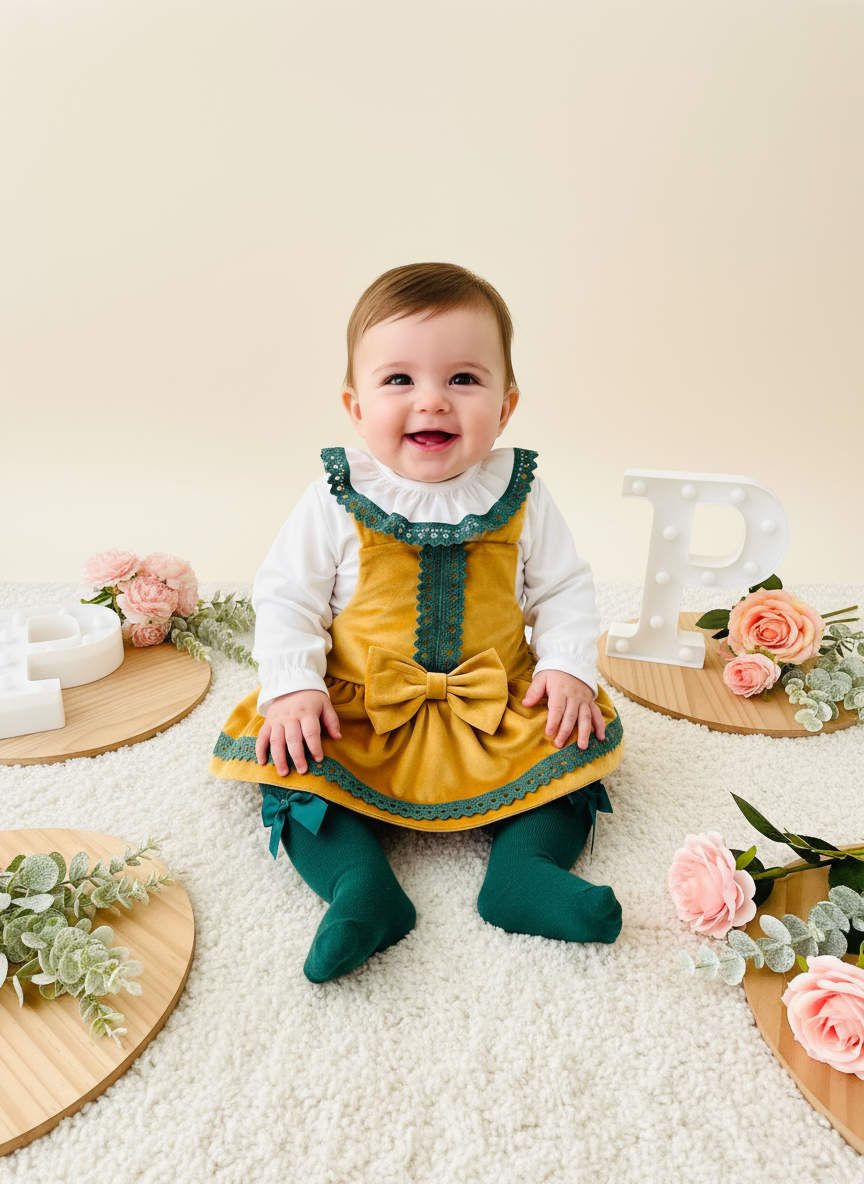 Conjunto maravilhoso em amarelo: fofo em veludo e blusa branca com detalhes em verde.