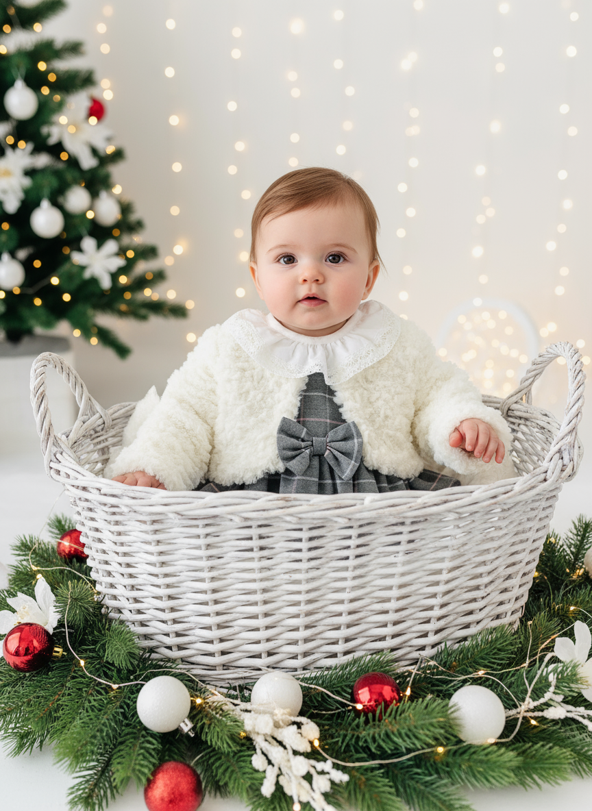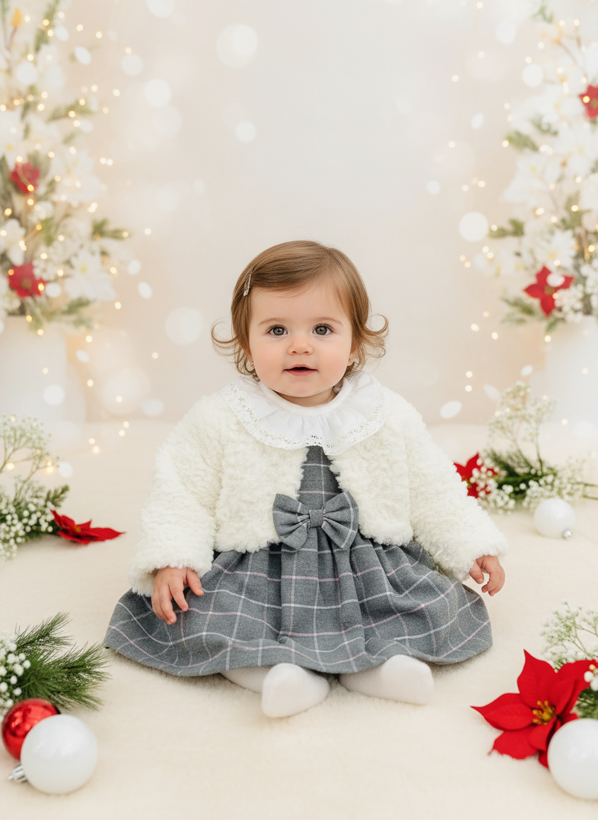 Conjunto elegante de 3 peças: casaco com pêlo por fora e tecido polar por dentro, vestido e blusa com renda na gola .