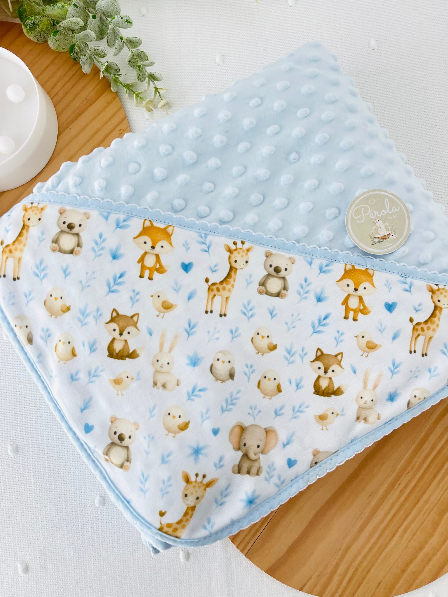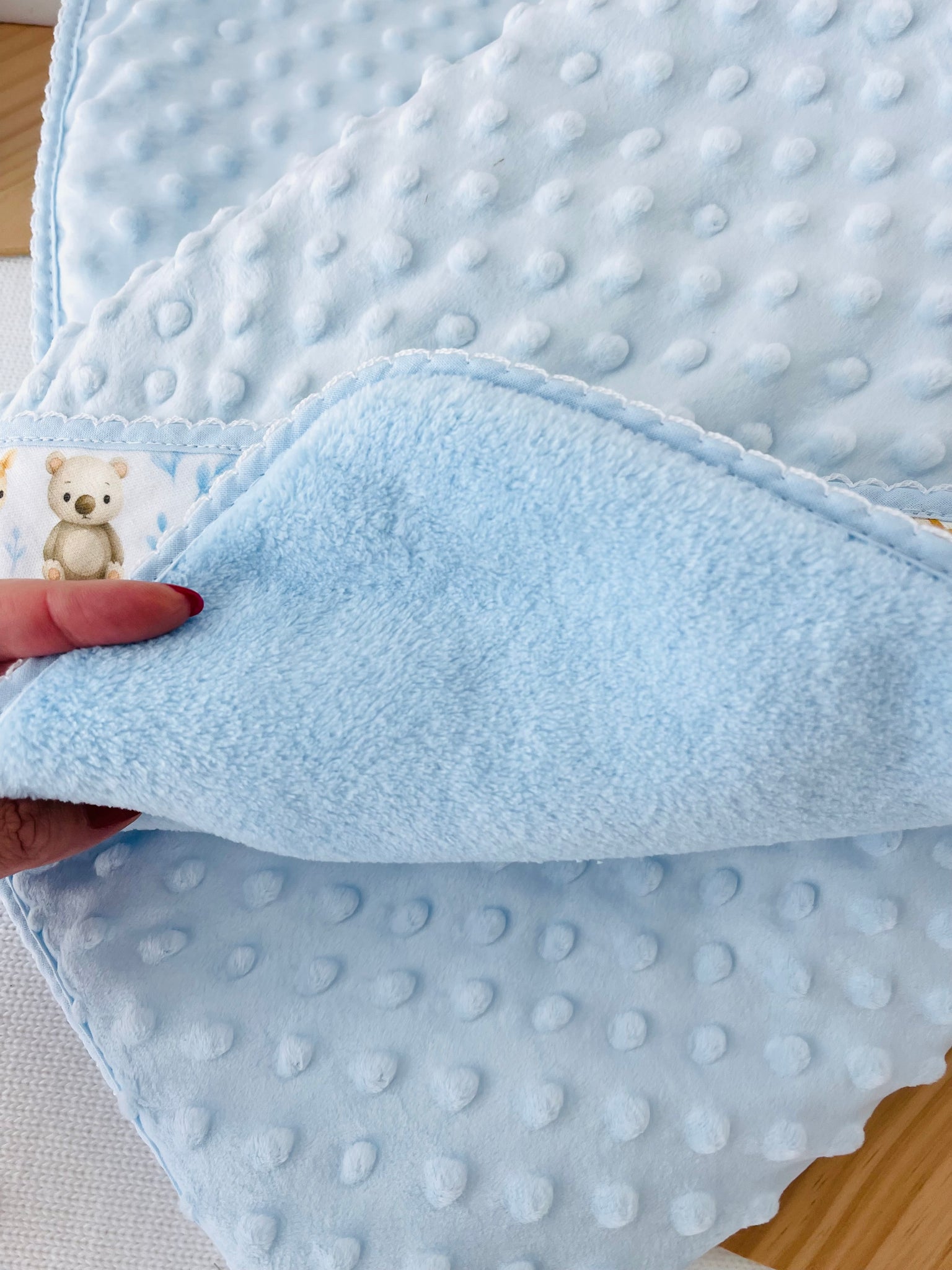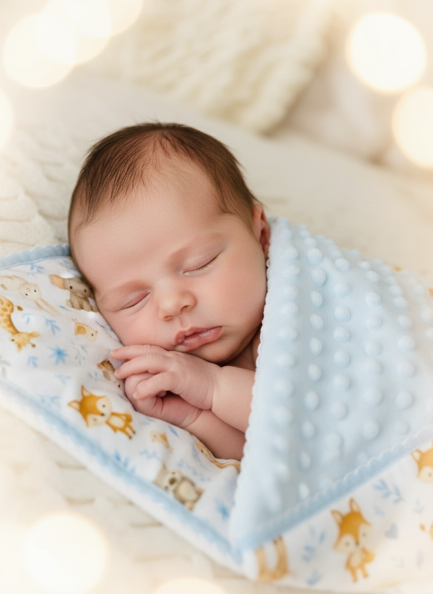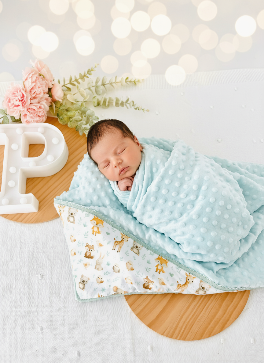 - Um lado em tecido minky texturizado com bolinhas em relevo, extremamente macio e quentinho