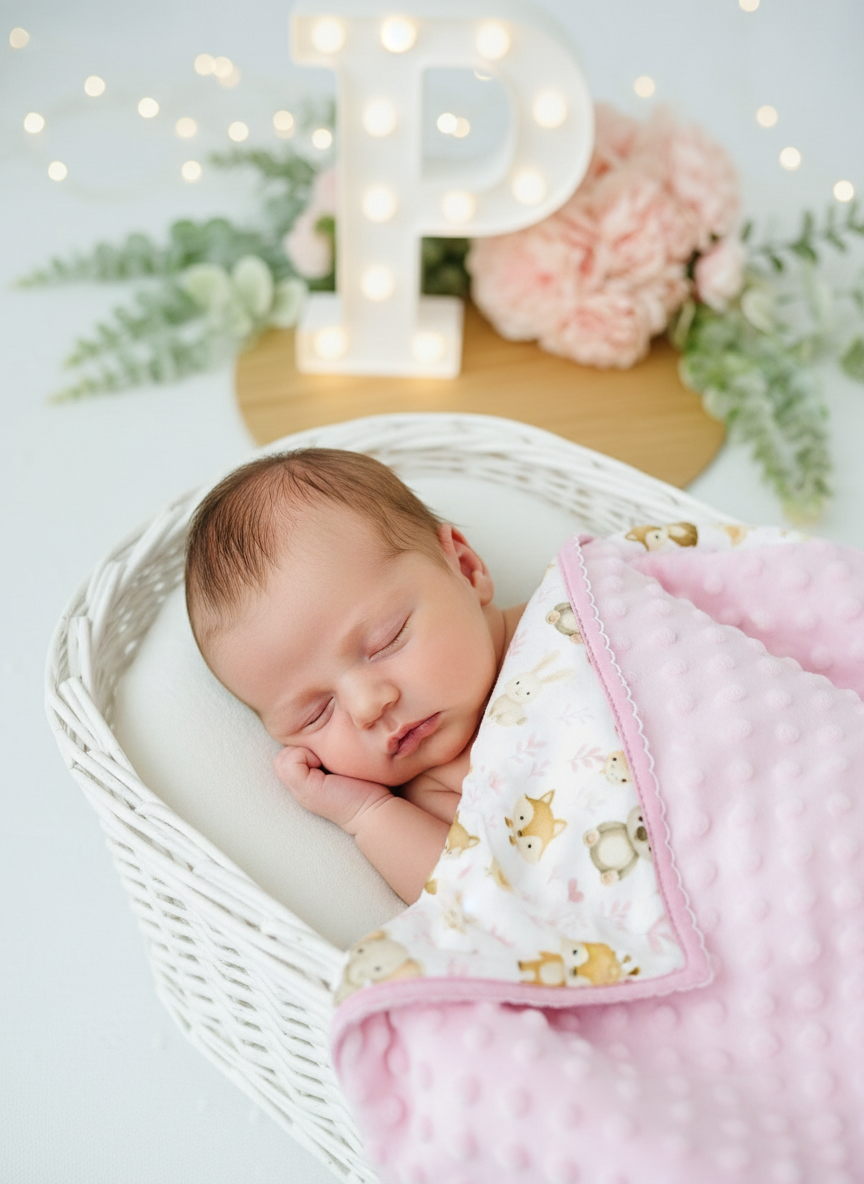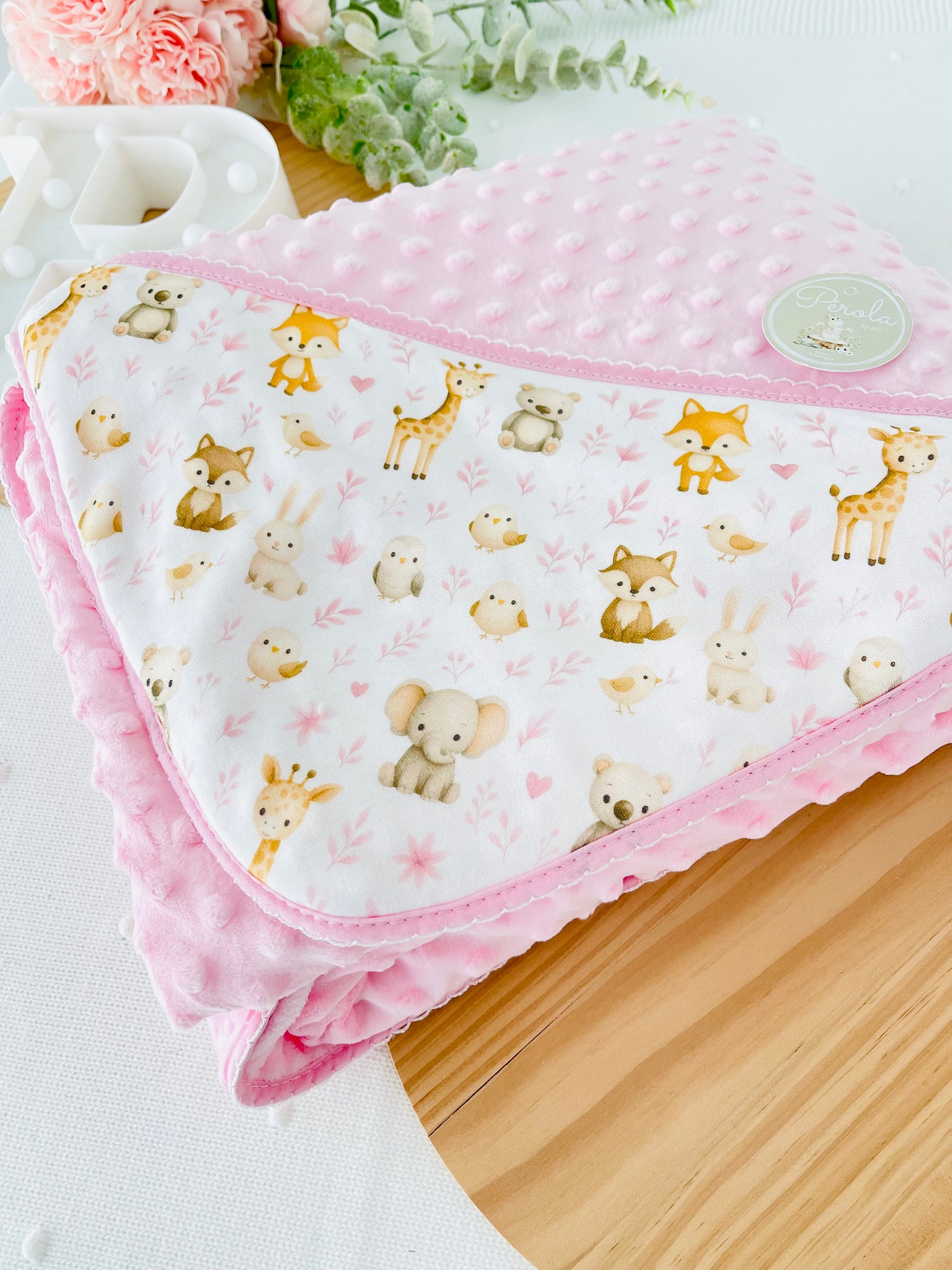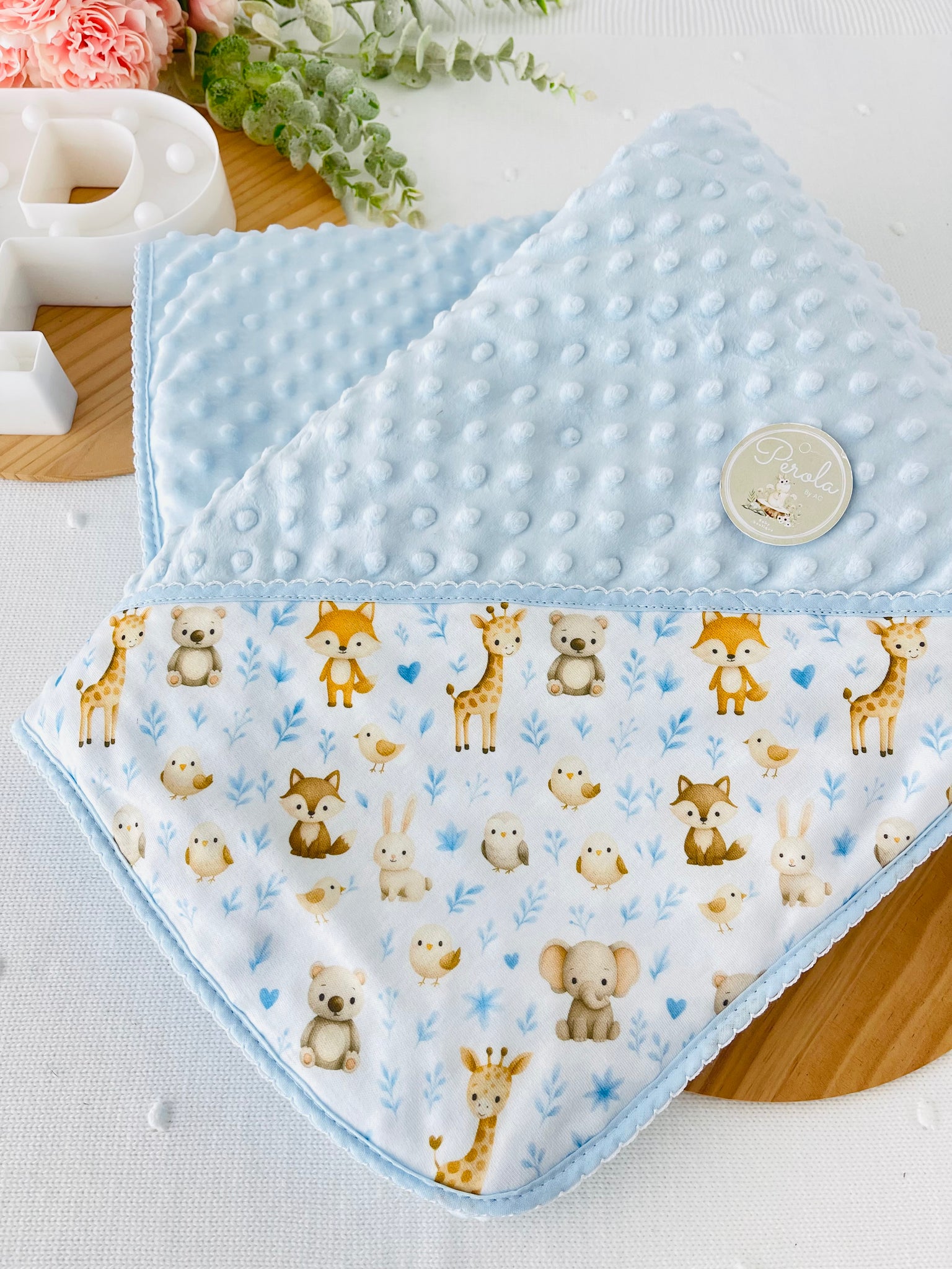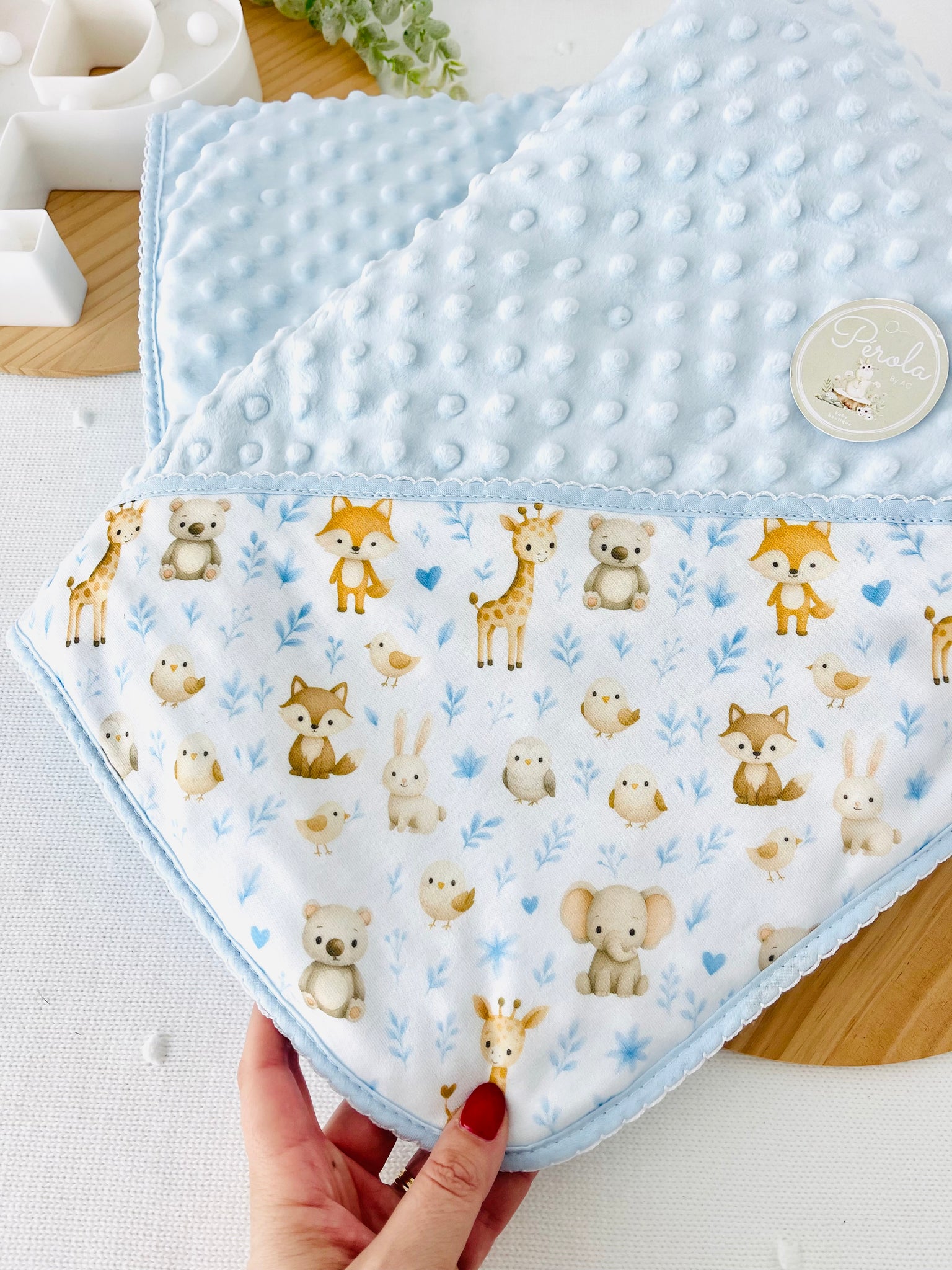- Um lado em tecido minky texturizado com bolinhas em relevo, extremamente macio e quentinho