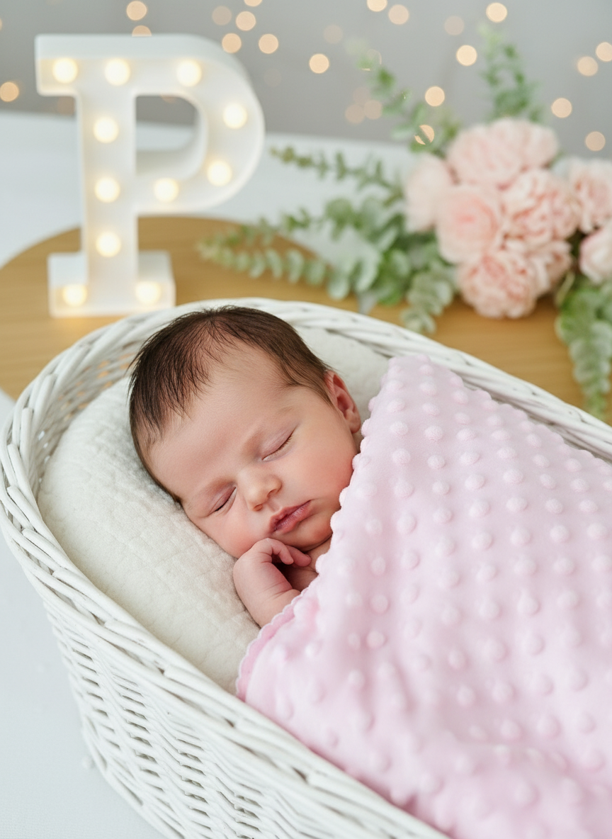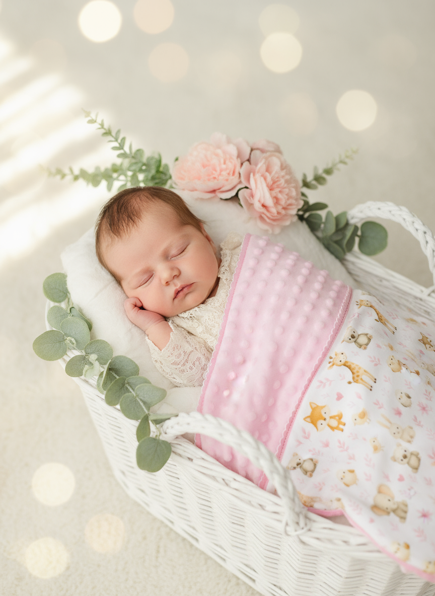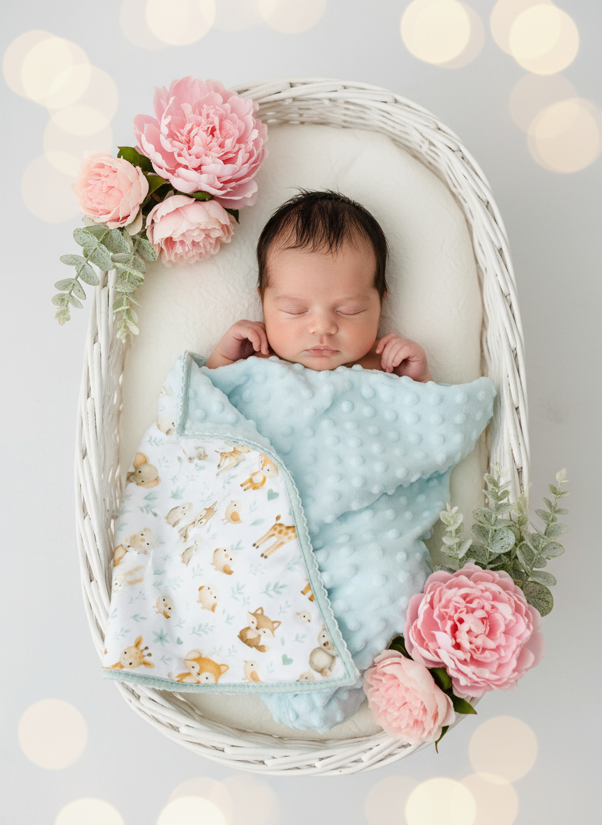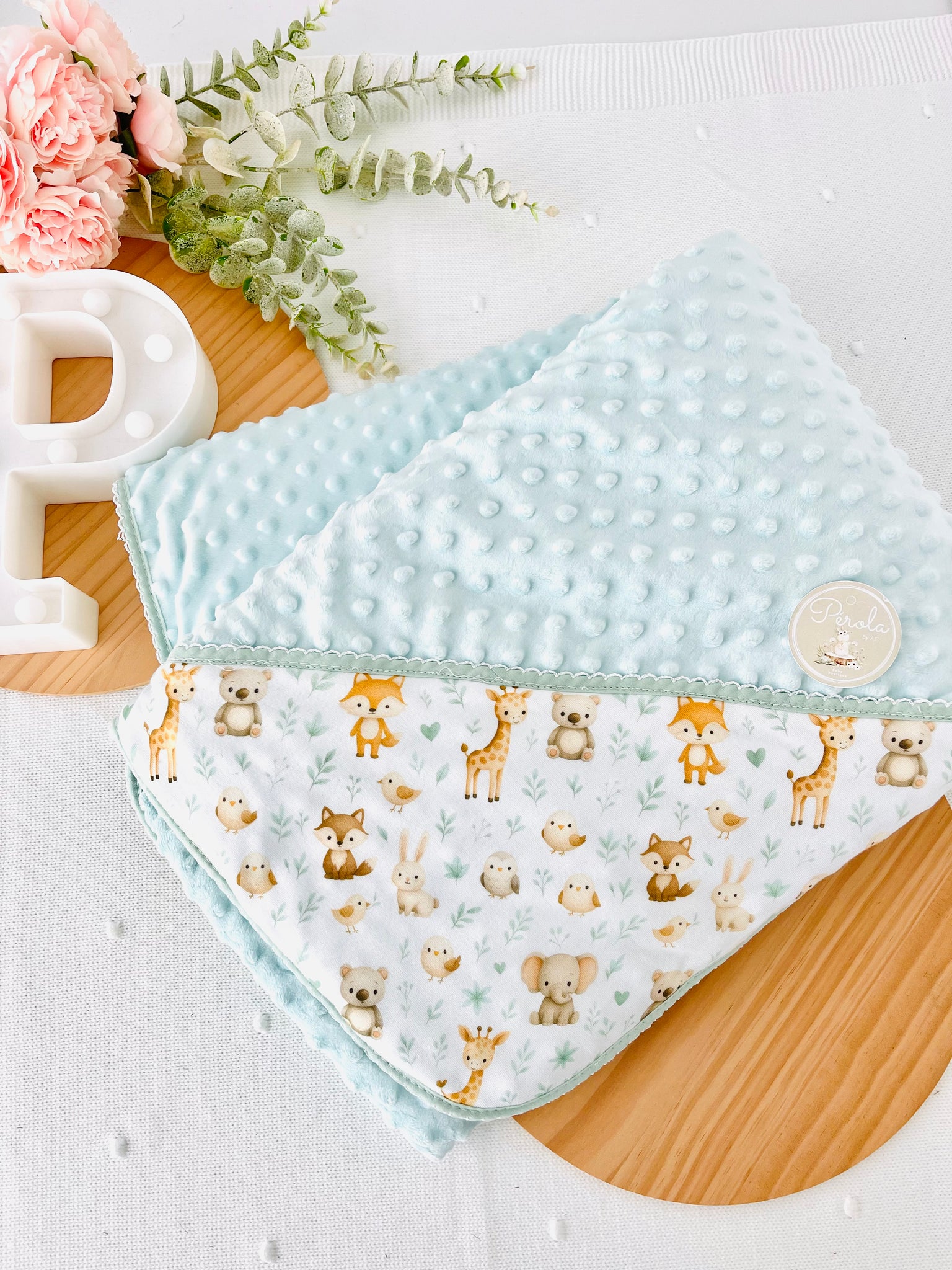 - Um lado em tecido minky texturizado com bolinhas em relevo, extremamente macio e quentinho