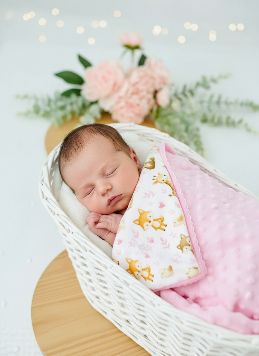 Esta manta dupla face ultra suave apresenta um adorável padrão de animais amorosos (girafas, coalas, raposas e coelhinhos) que traz um toque de doçura e delicadeza ao enxoval do teu pequeno tesouro.