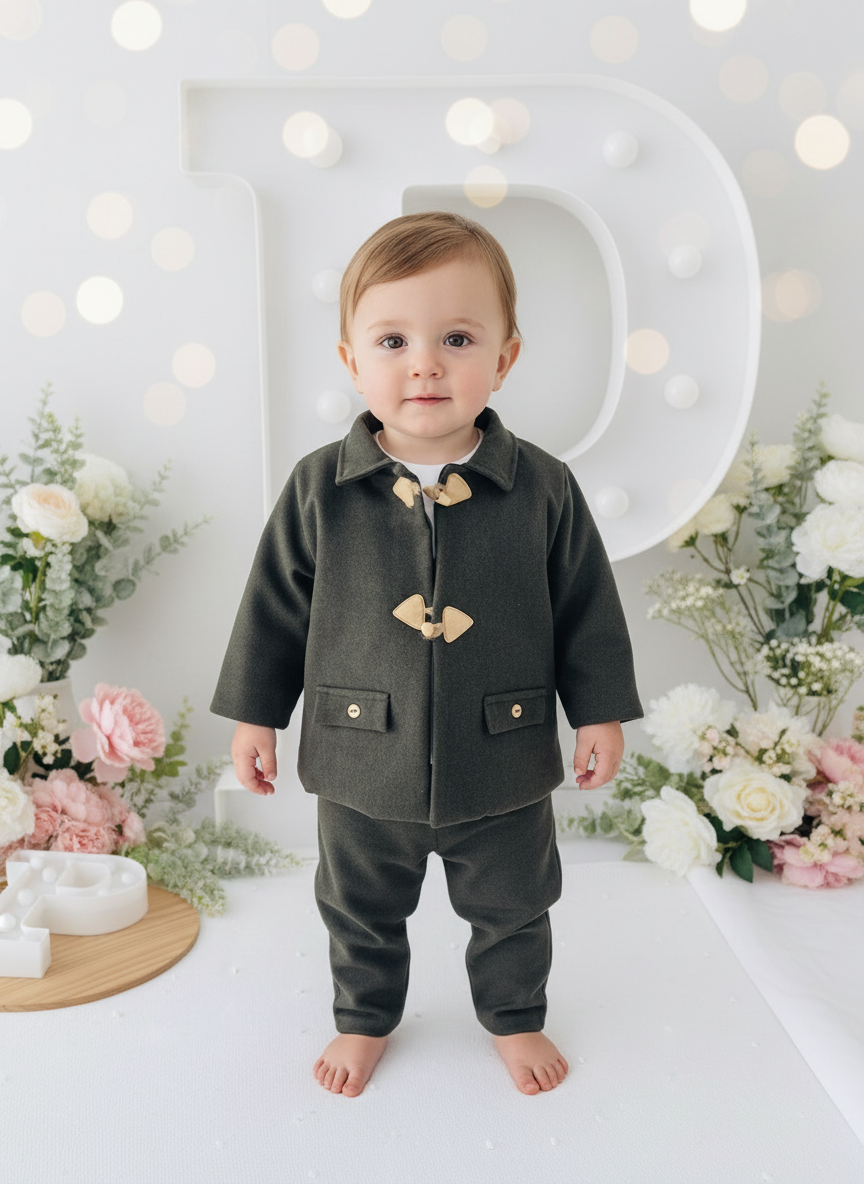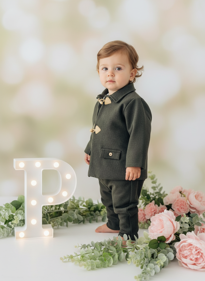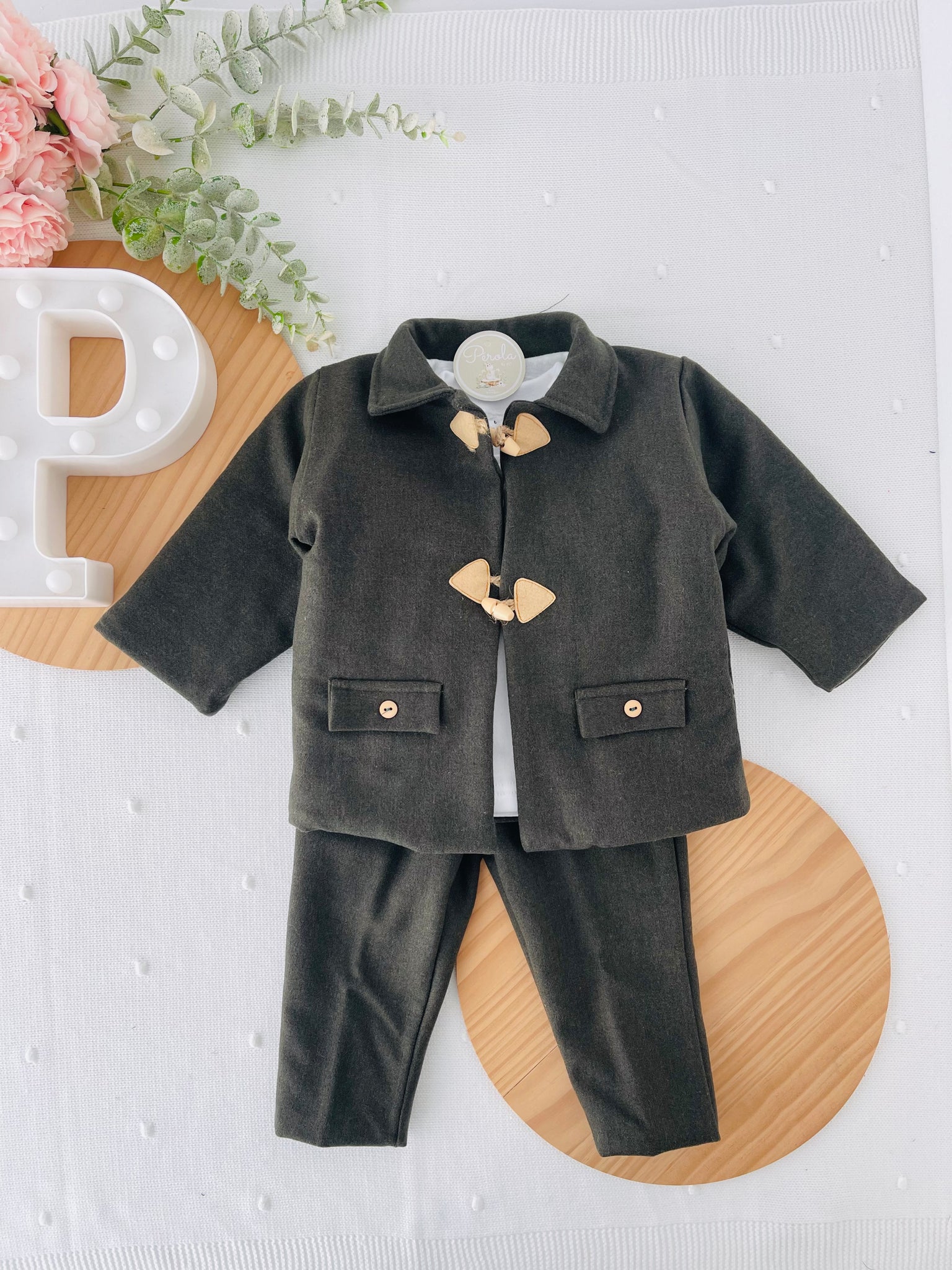 Conjunto menino em fazenda 3 peças: casaco, calças e camisola