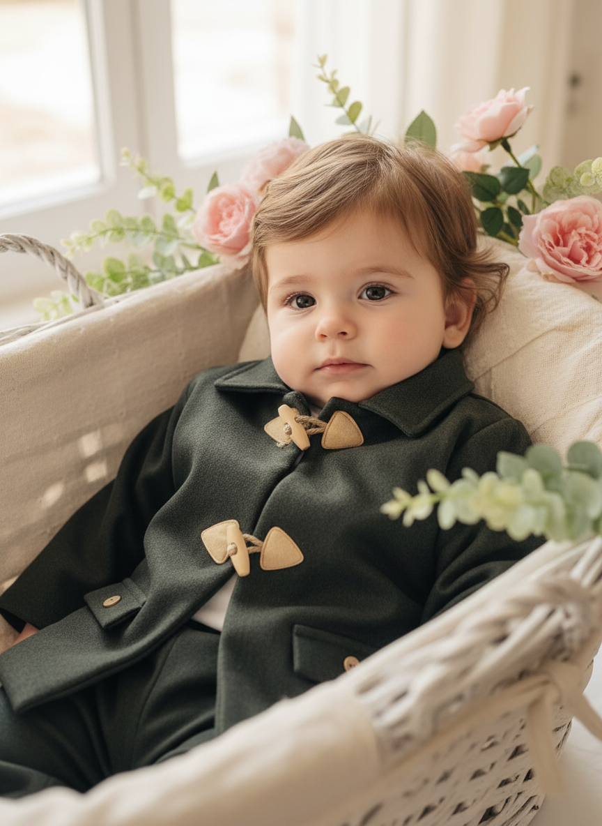 - Casaco Duffle em Verde Escura - Com fechos toggle em madeira camel, gola clássica e dois bolsos frontais