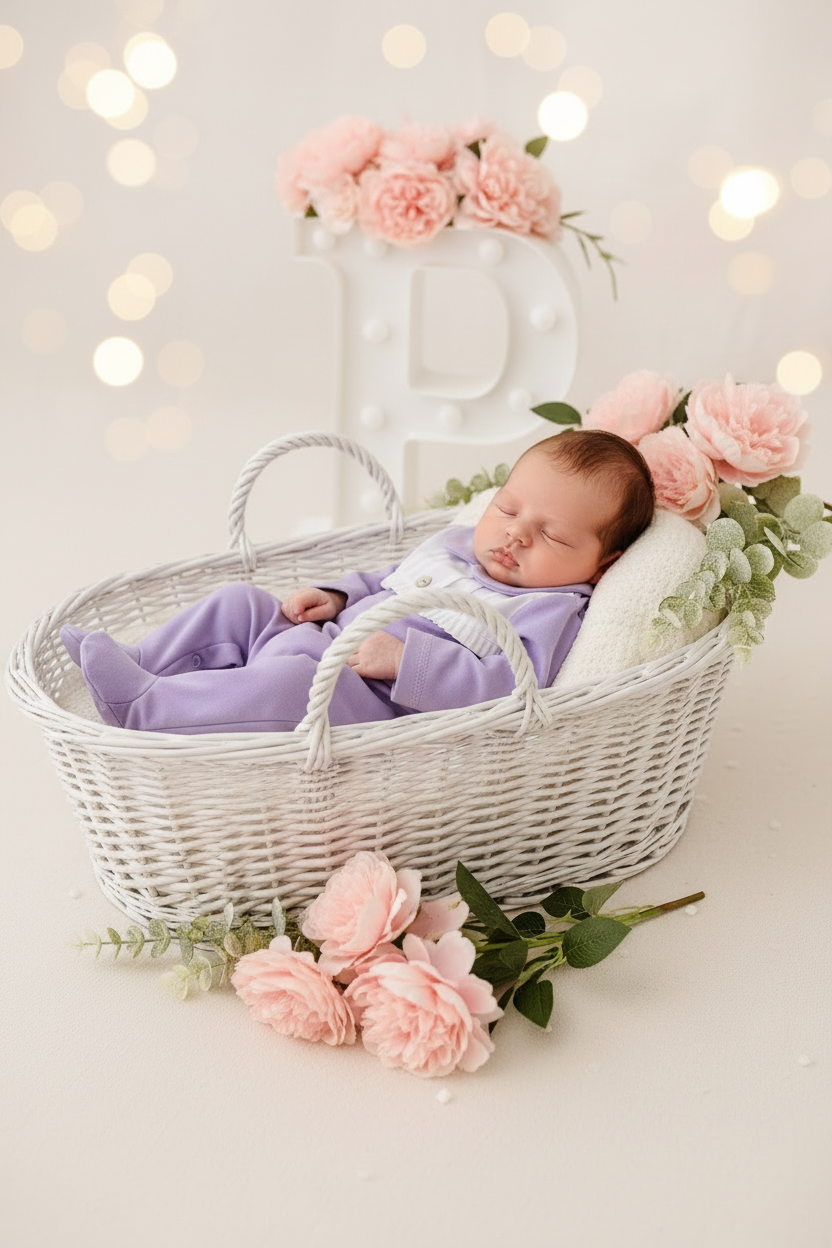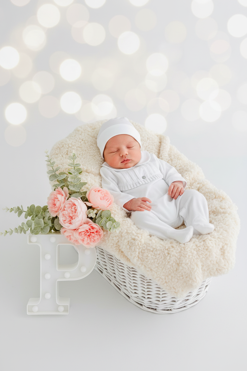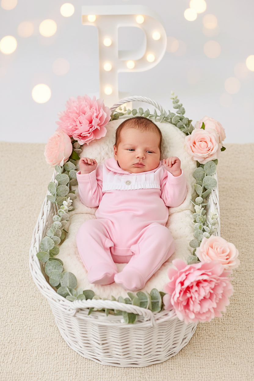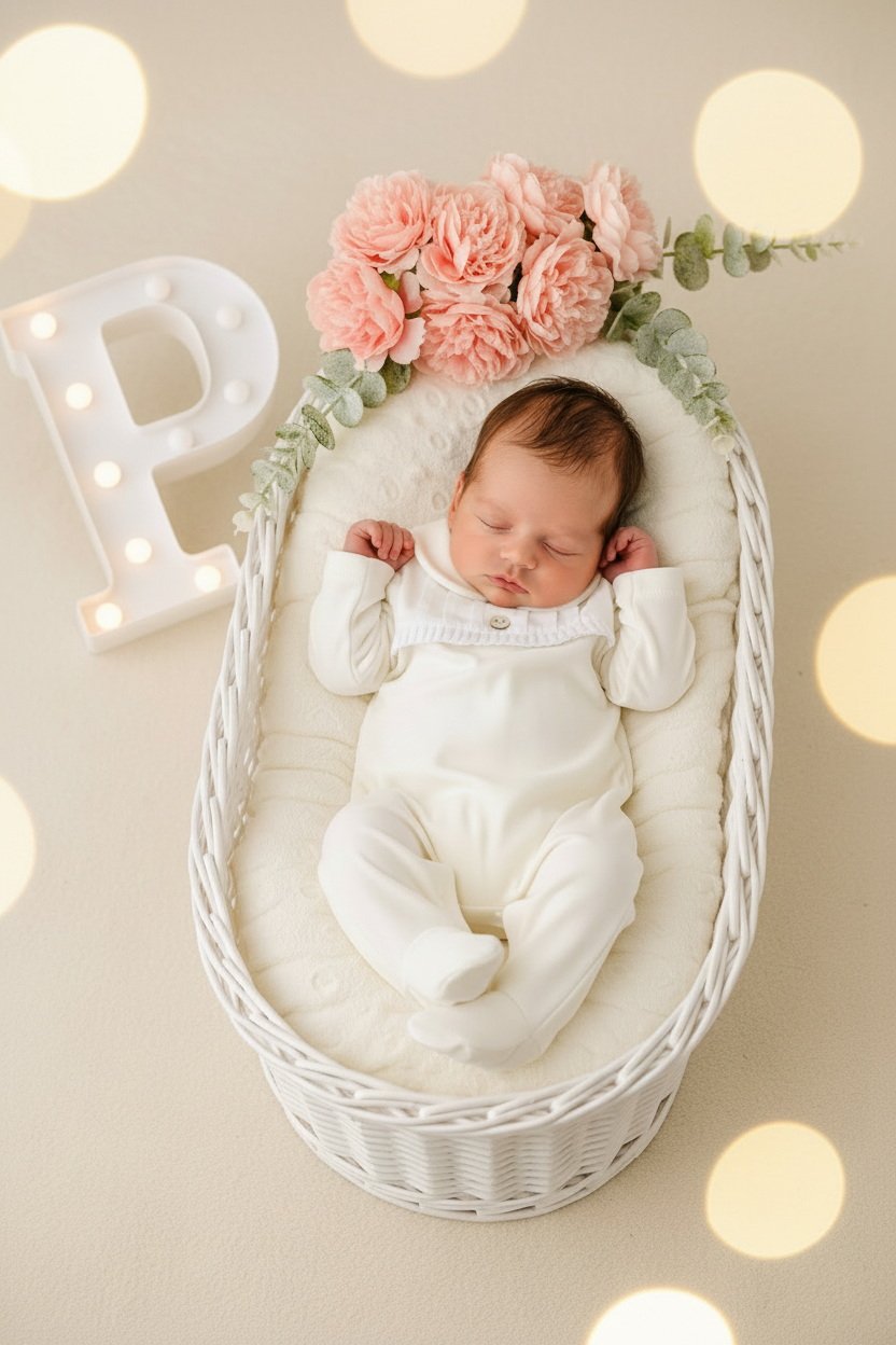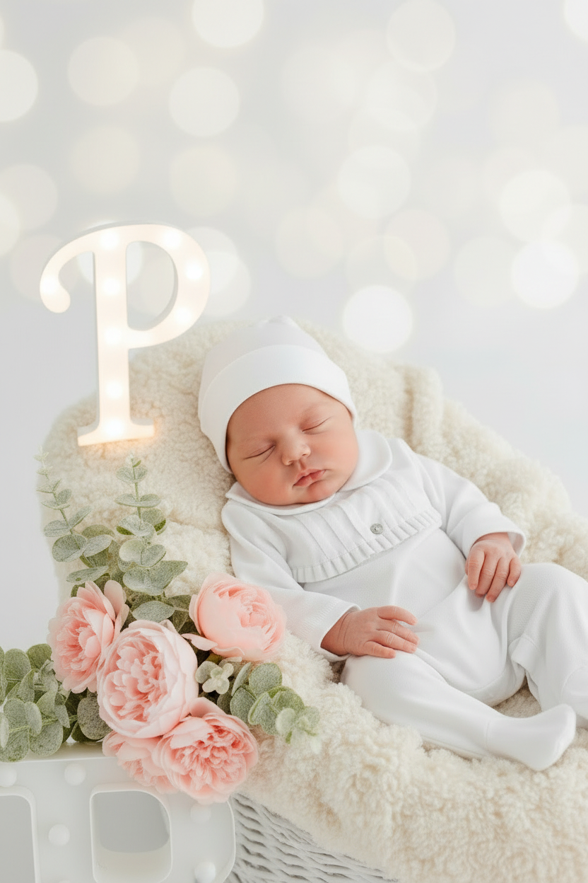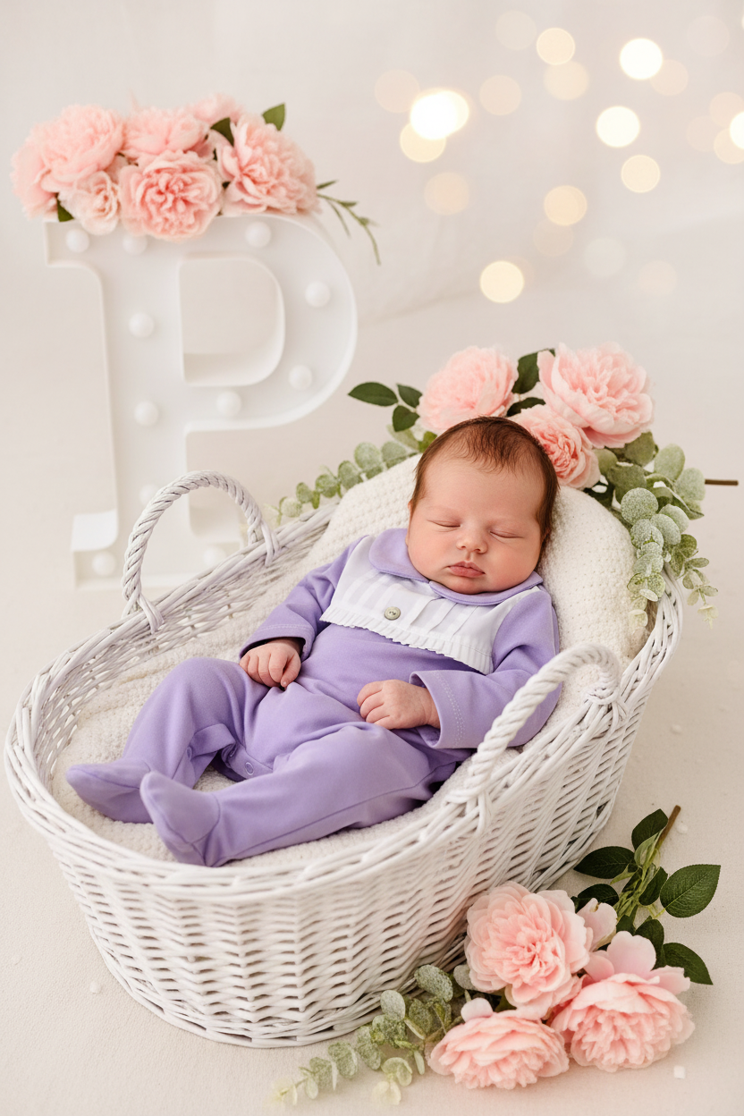 Babygrow em algodão com gola Peter Pan e botão madrepérola.