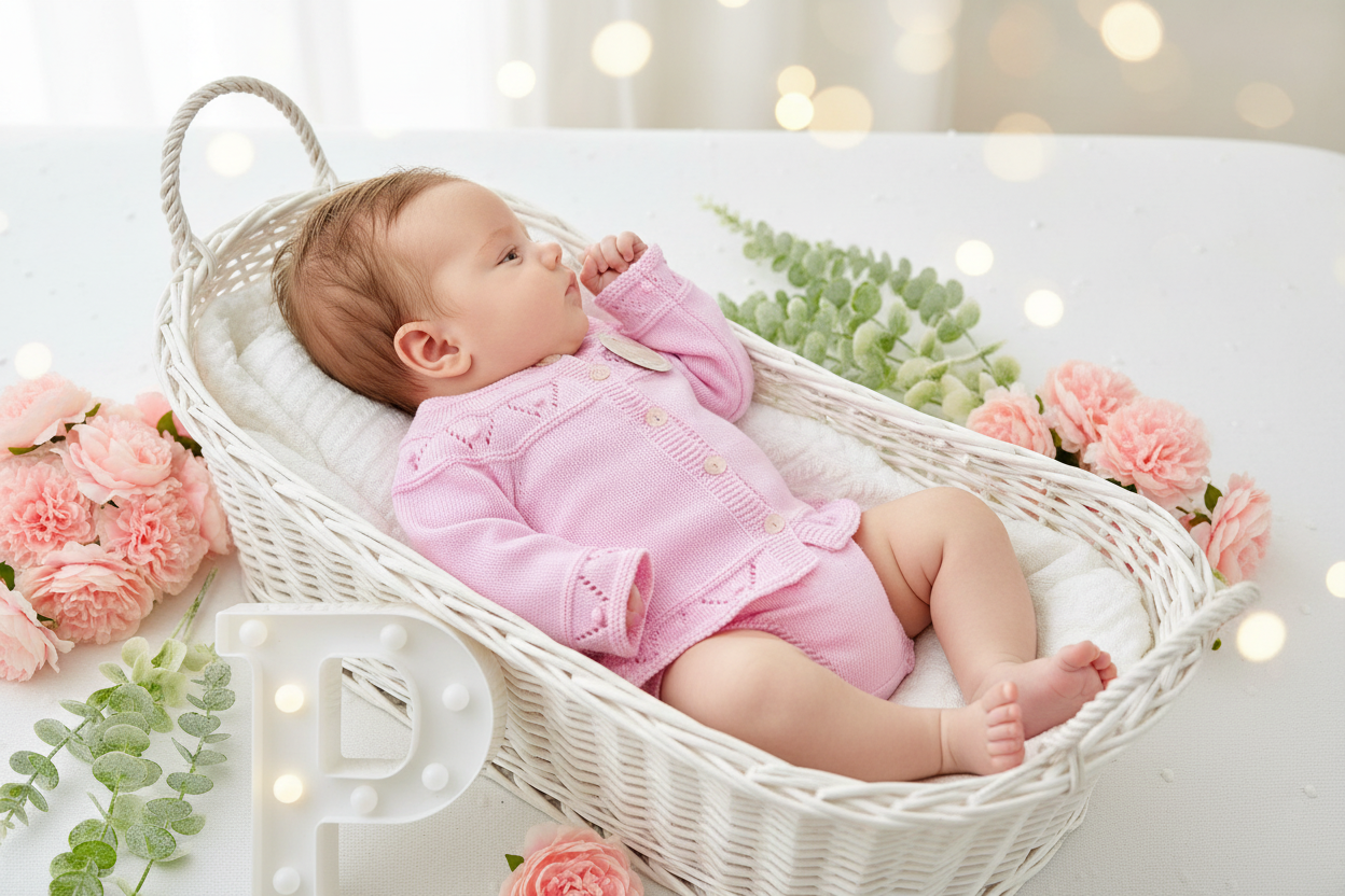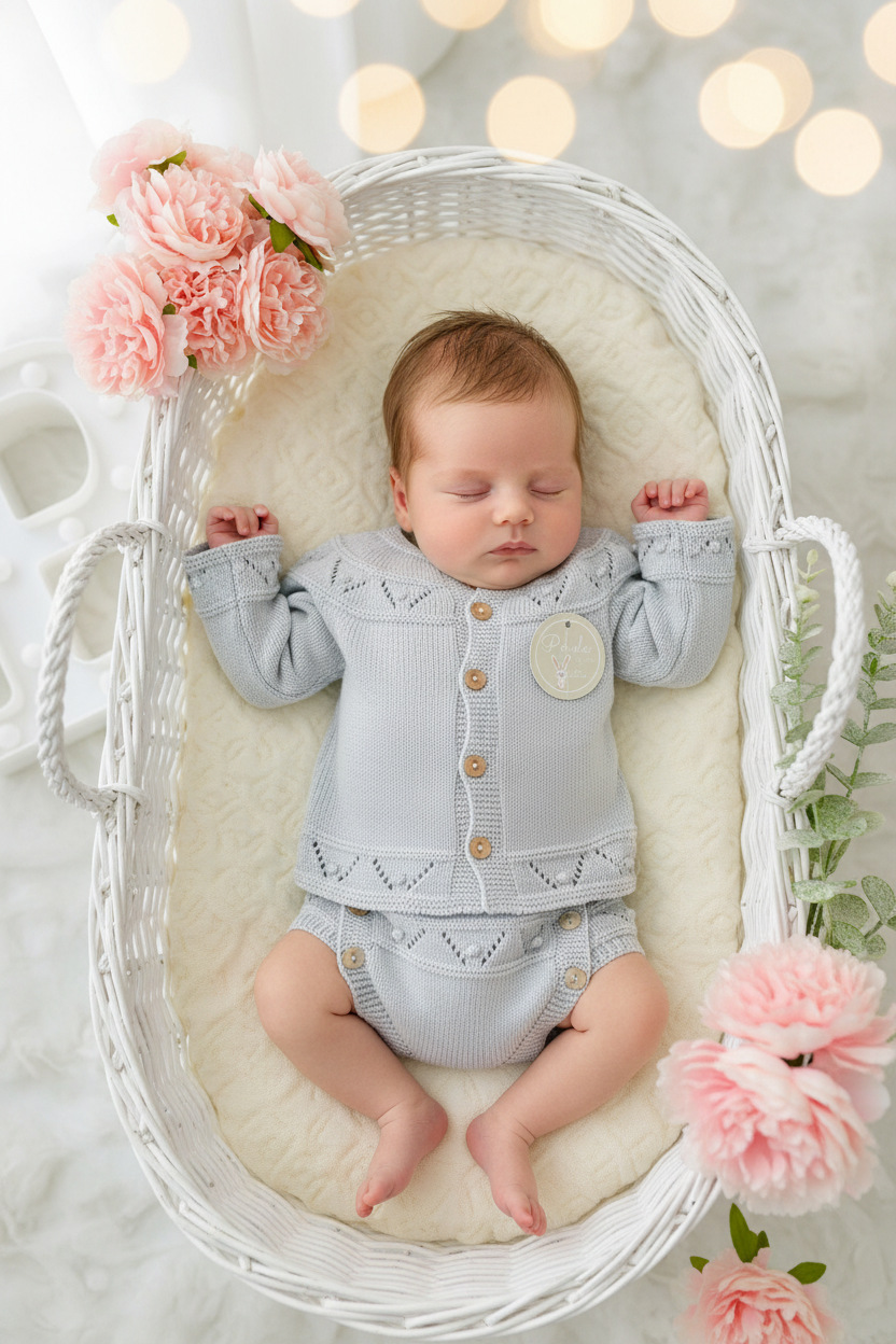 Este adorável conjunto inclui casaco e tapa fraldas, confeccionado em malha fina de algodão puro para proporcionar o máximo conforto e suavidade à pele delicada do bebé.