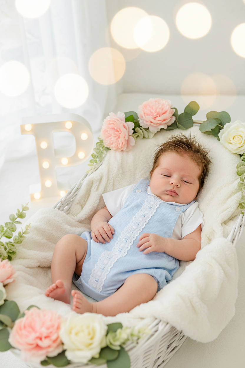 Conjunto João em azul: fofo com fita de renda e camisola com golinha de camisa.