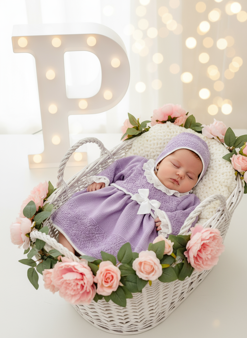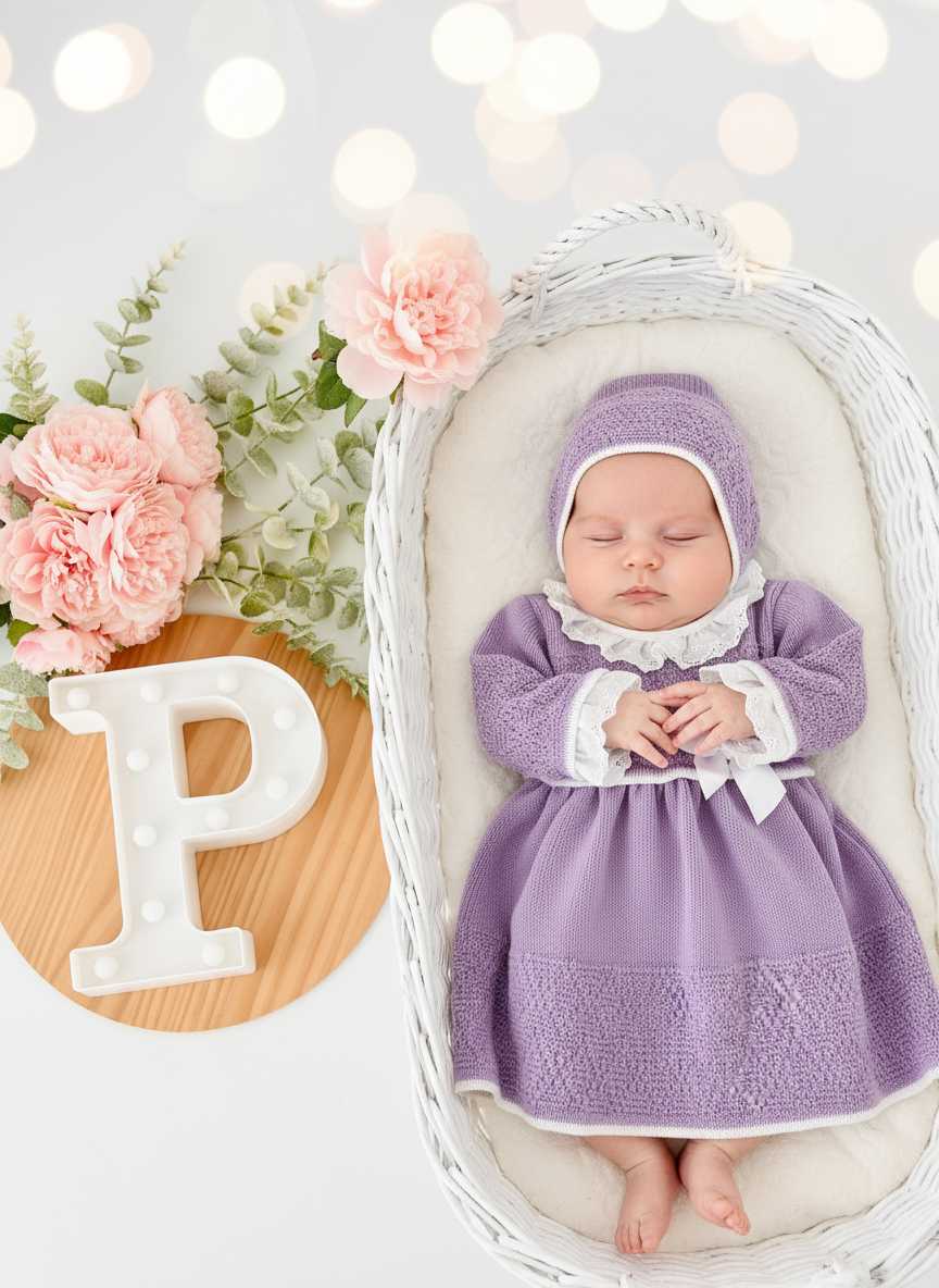 Conjunto encantador de 2 peças em malha quentinha e macia: vestido lilás com detalhes em broderie anglaise e touca coordenada.