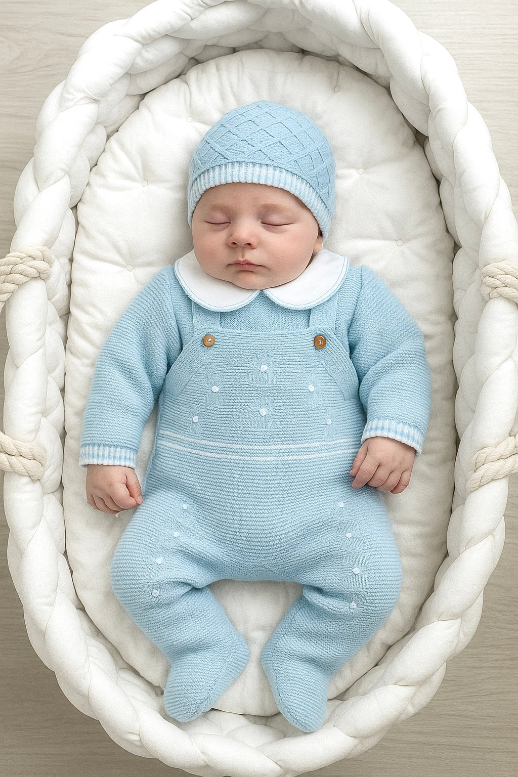 Saída de maternidade azul: jardineiras, camisola e gorro Outono/Inverno
