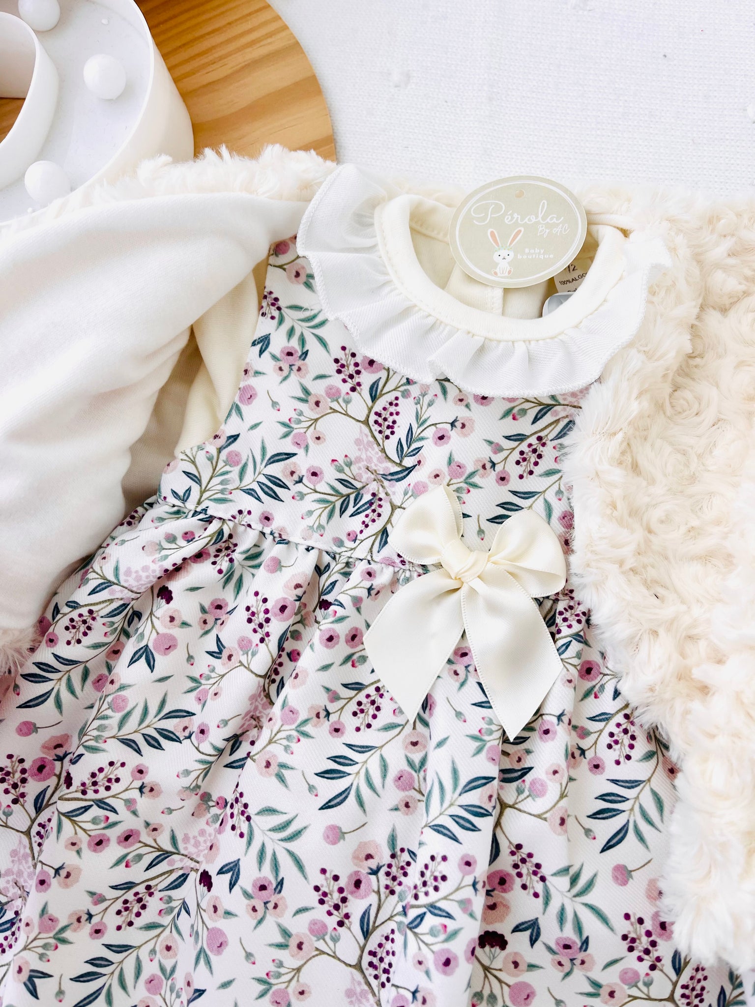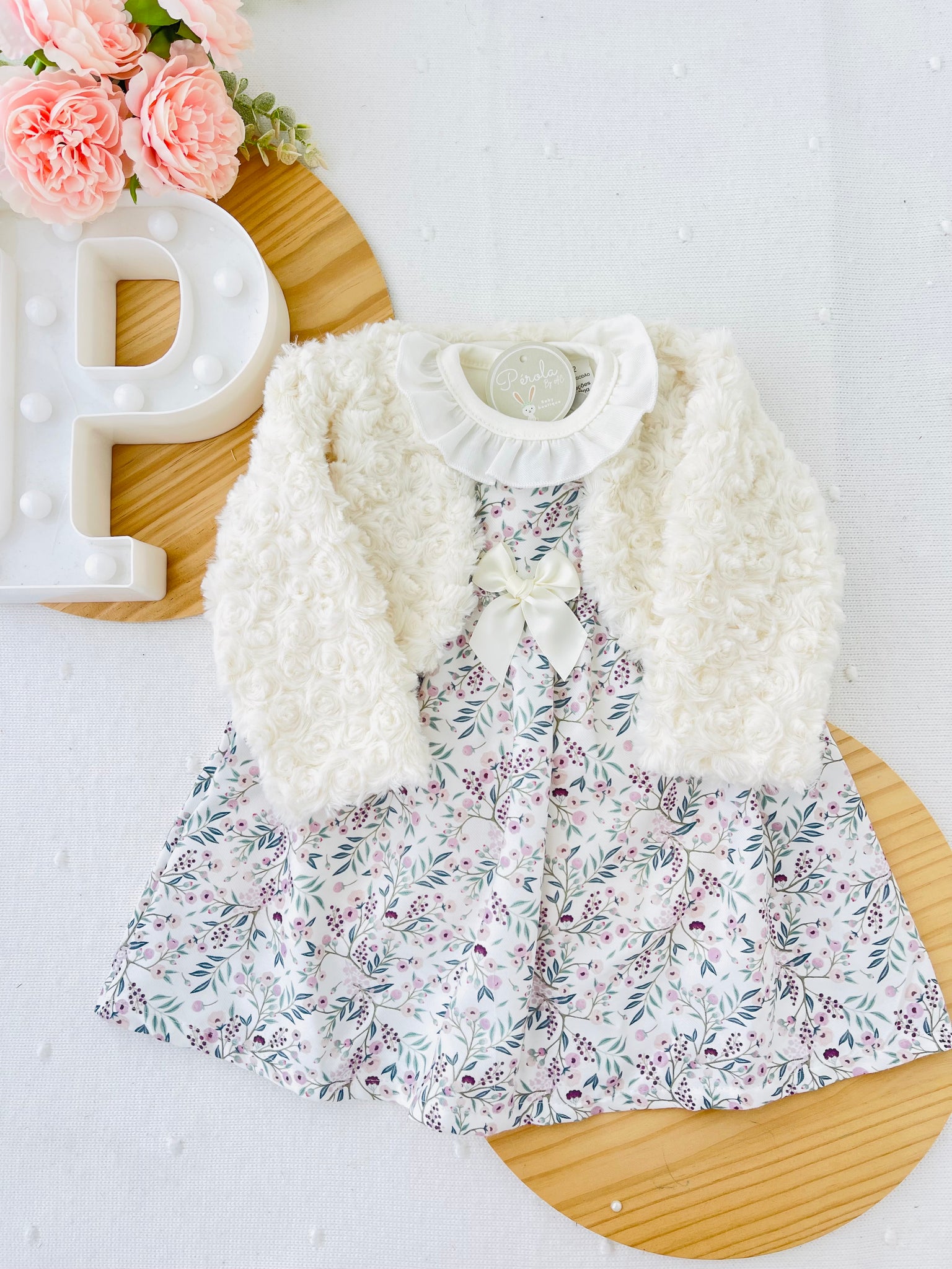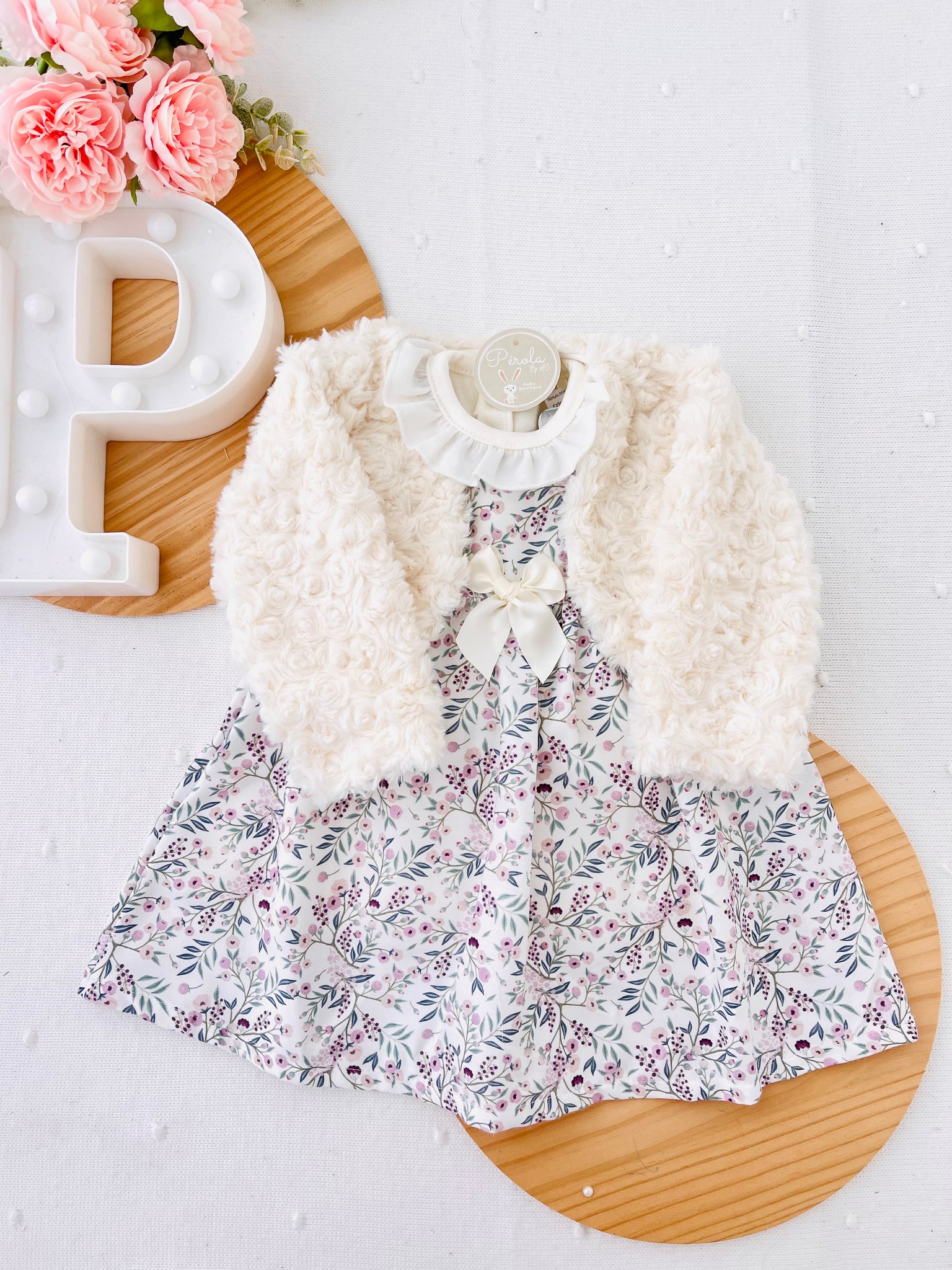 Conjunto Clarinha: casaco, vestido e camisola com golinha