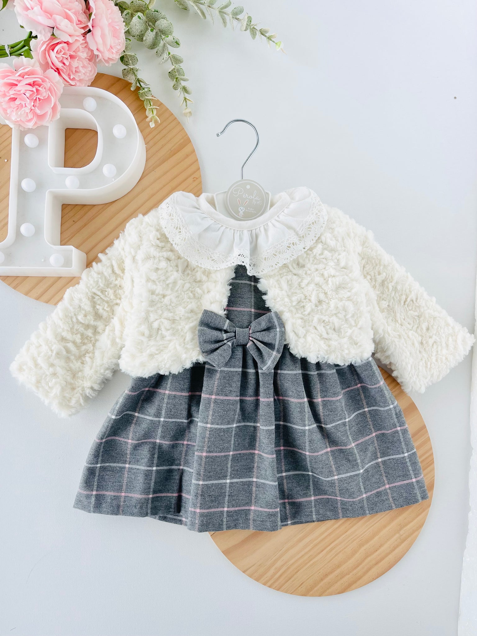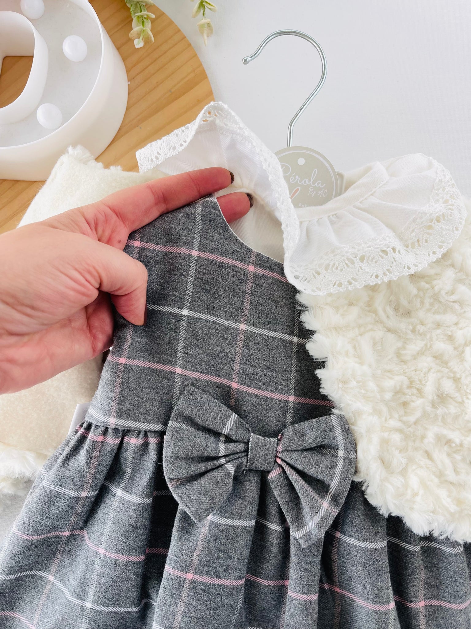 Conjunto elegante de 3 peças: casaco com pêlo por fora e tecido polar por dentro, vestido e blusa com renda na gola .