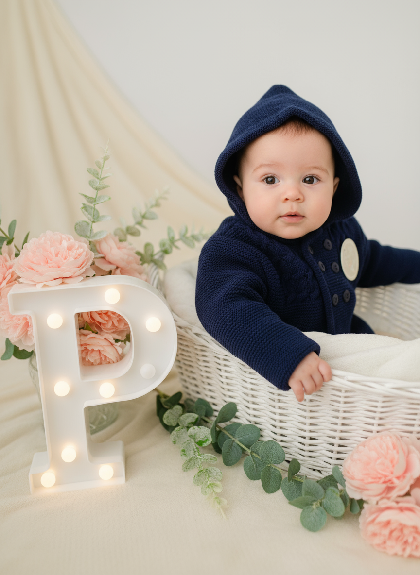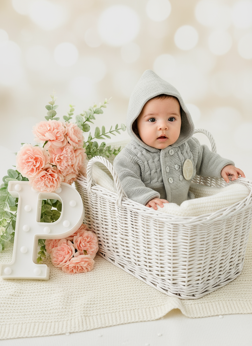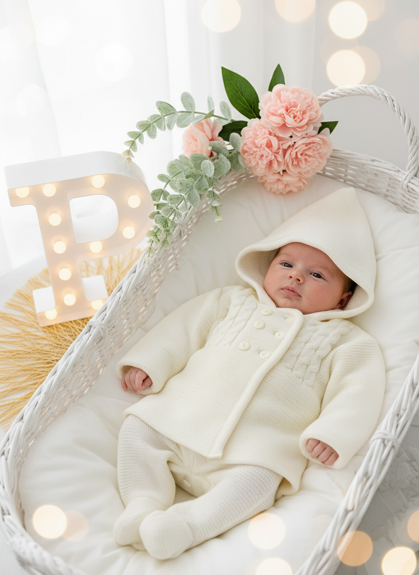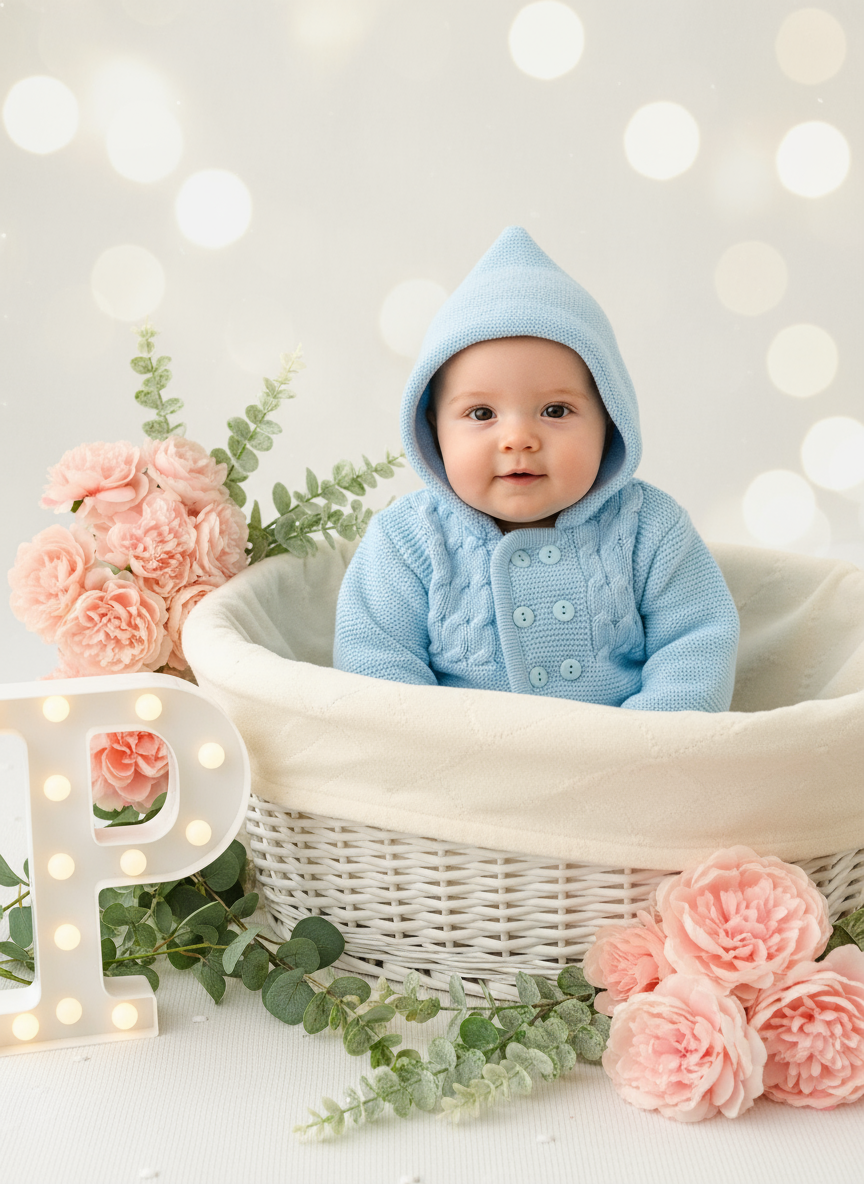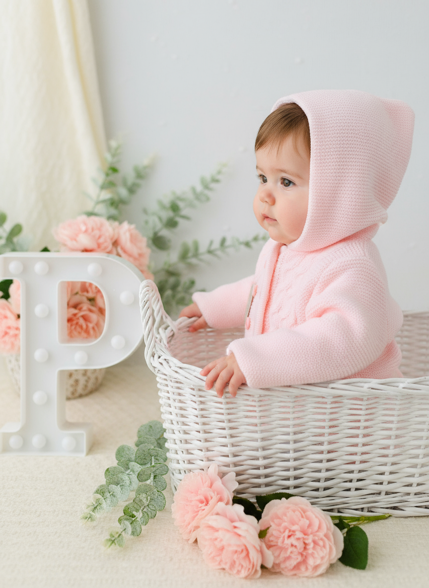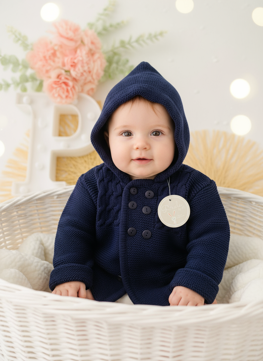 Este casaco apresenta um design clássico com painéis de tranças verticais na frente, fecho de botões coordenados, mangas texturizadas e acabamentos canelados nos punhos e bainha. O capuz com ponta adiciona um toque adorável e mantém o bebé bem protegido do frio.