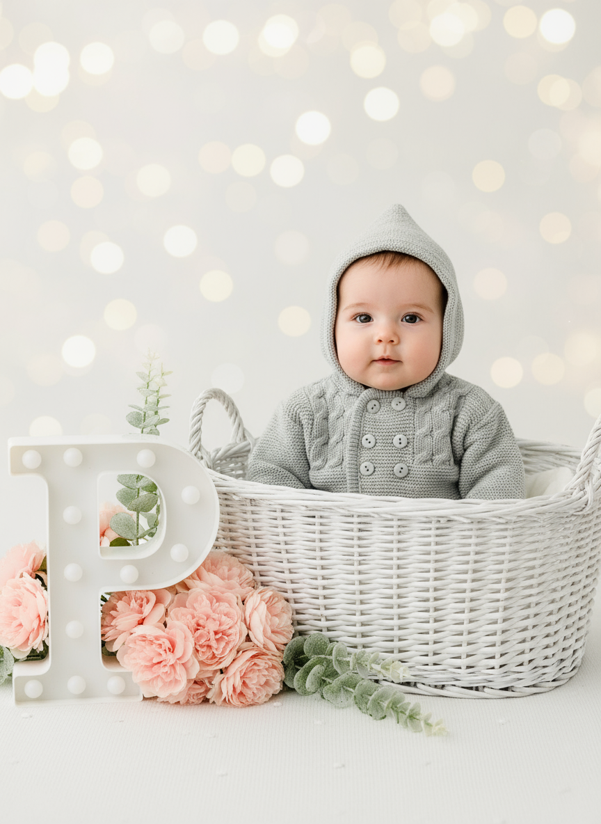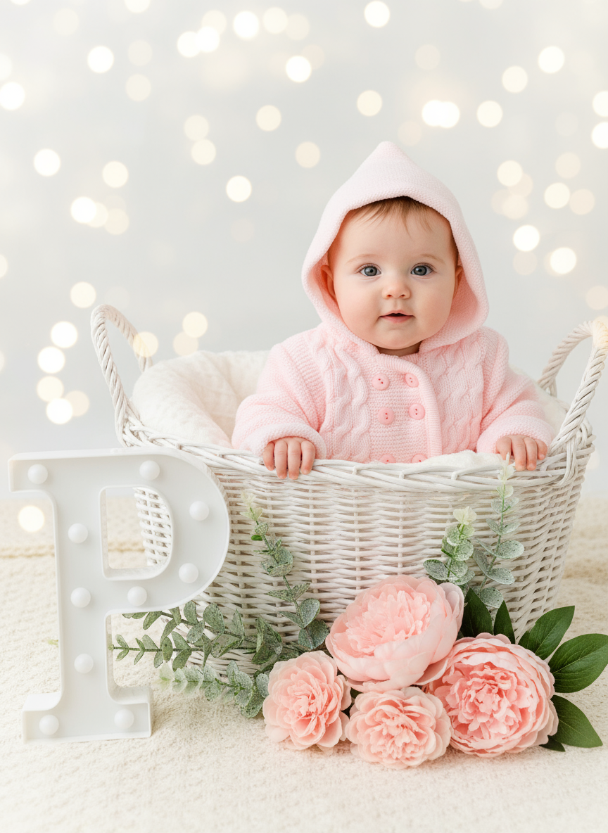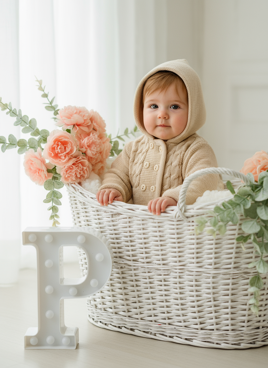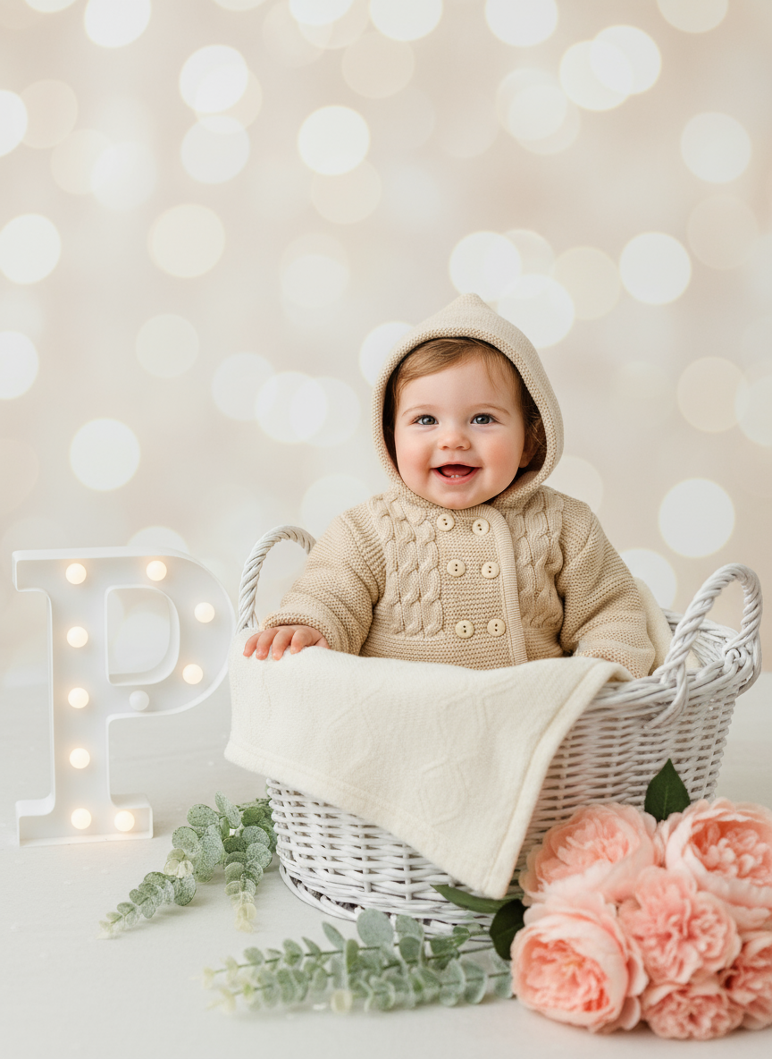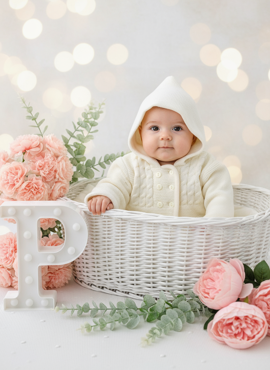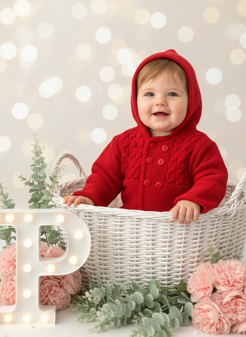 Este casaco apresenta um design clássico com painéis de tranças verticais na frente, fecho de botões coordenados, mangas texturizadas e acabamentos canelados nos punhos e bainha. O capuz com ponta adiciona um toque adorável e mantém o bebé bem protegido do frio.