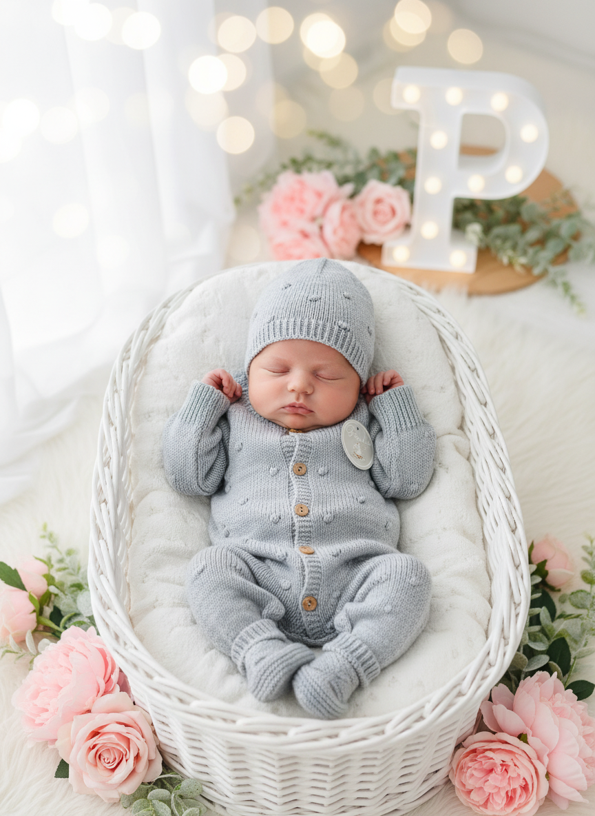 Conjunto de malha bolinhas 3 peças: macacão, gorro e carapins.