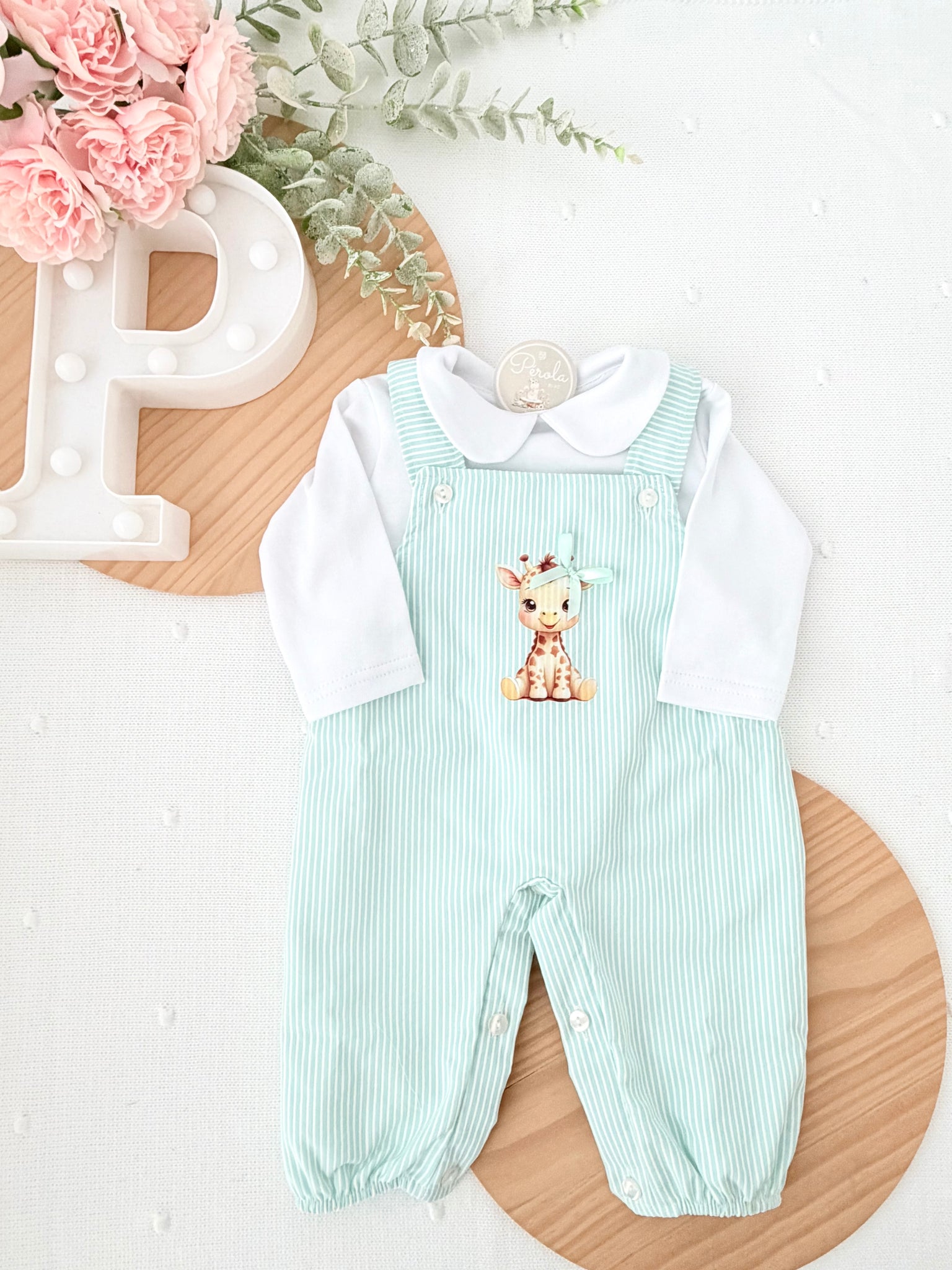 Conjunto girafa verde: Jardineiras e camisola 3-12M