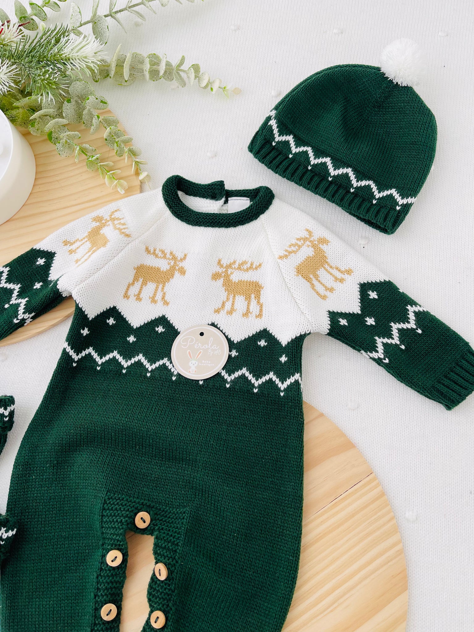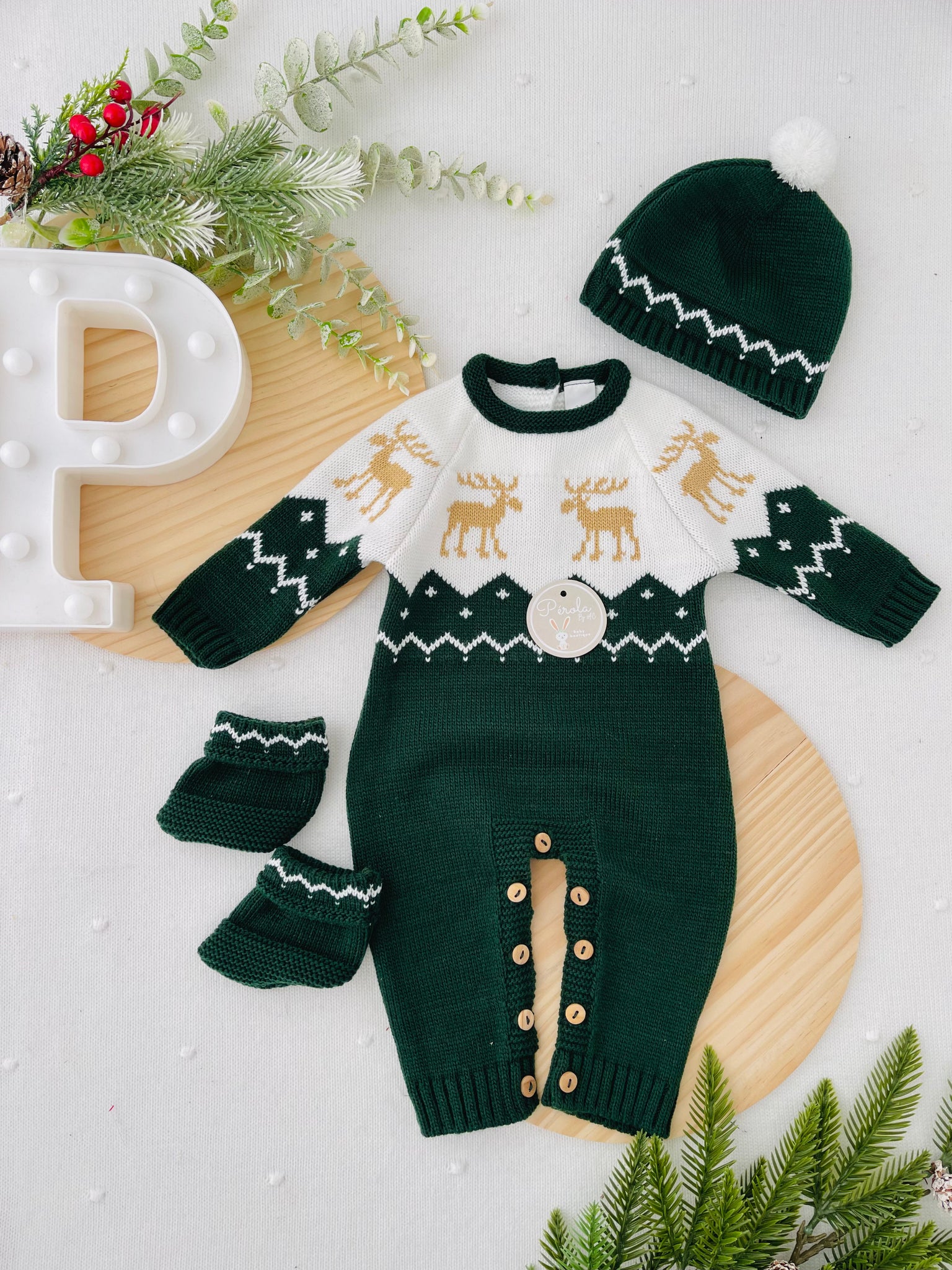 Conjunto Natal: macacão, gorro e carapins em malha quentinha.