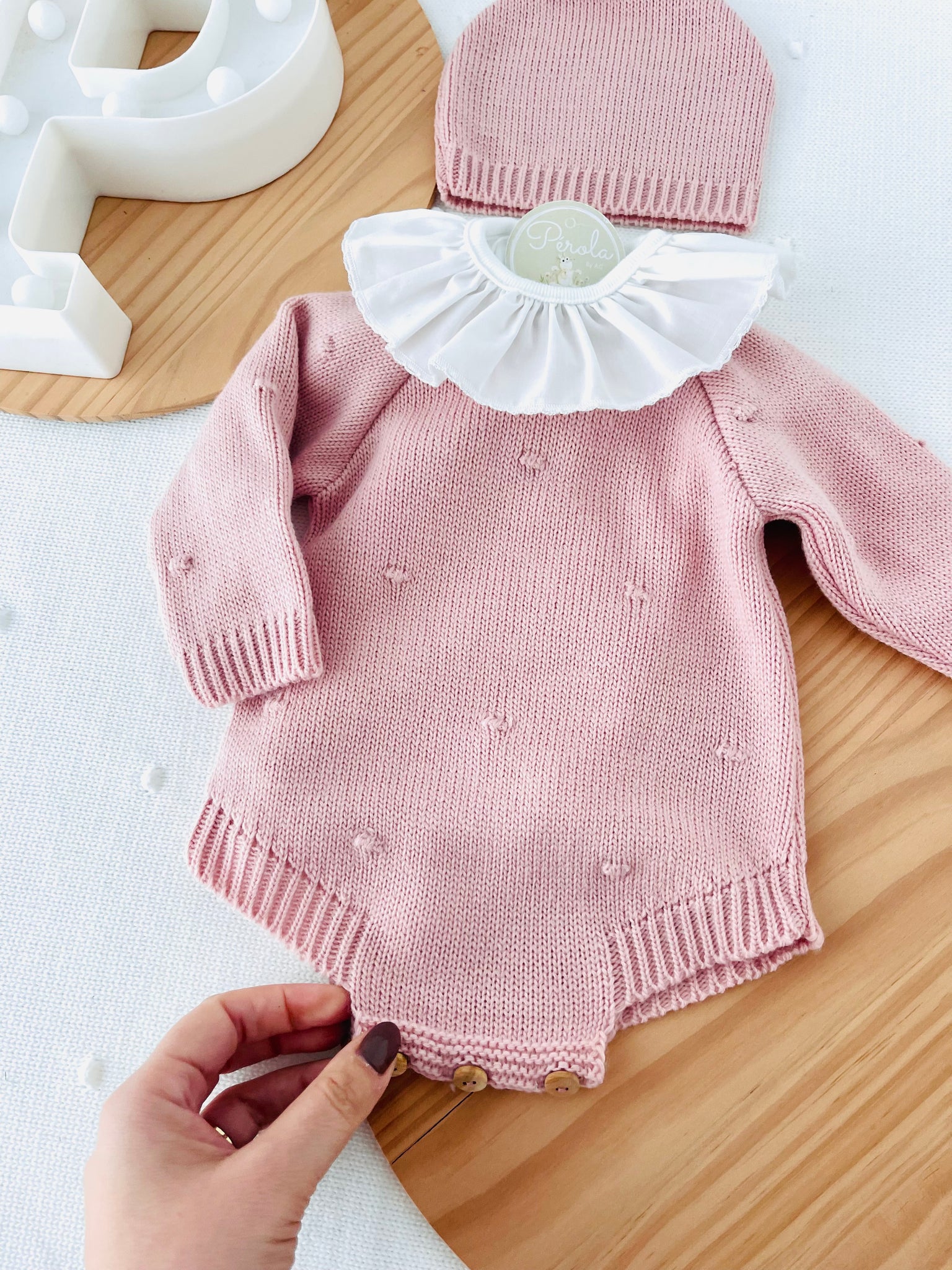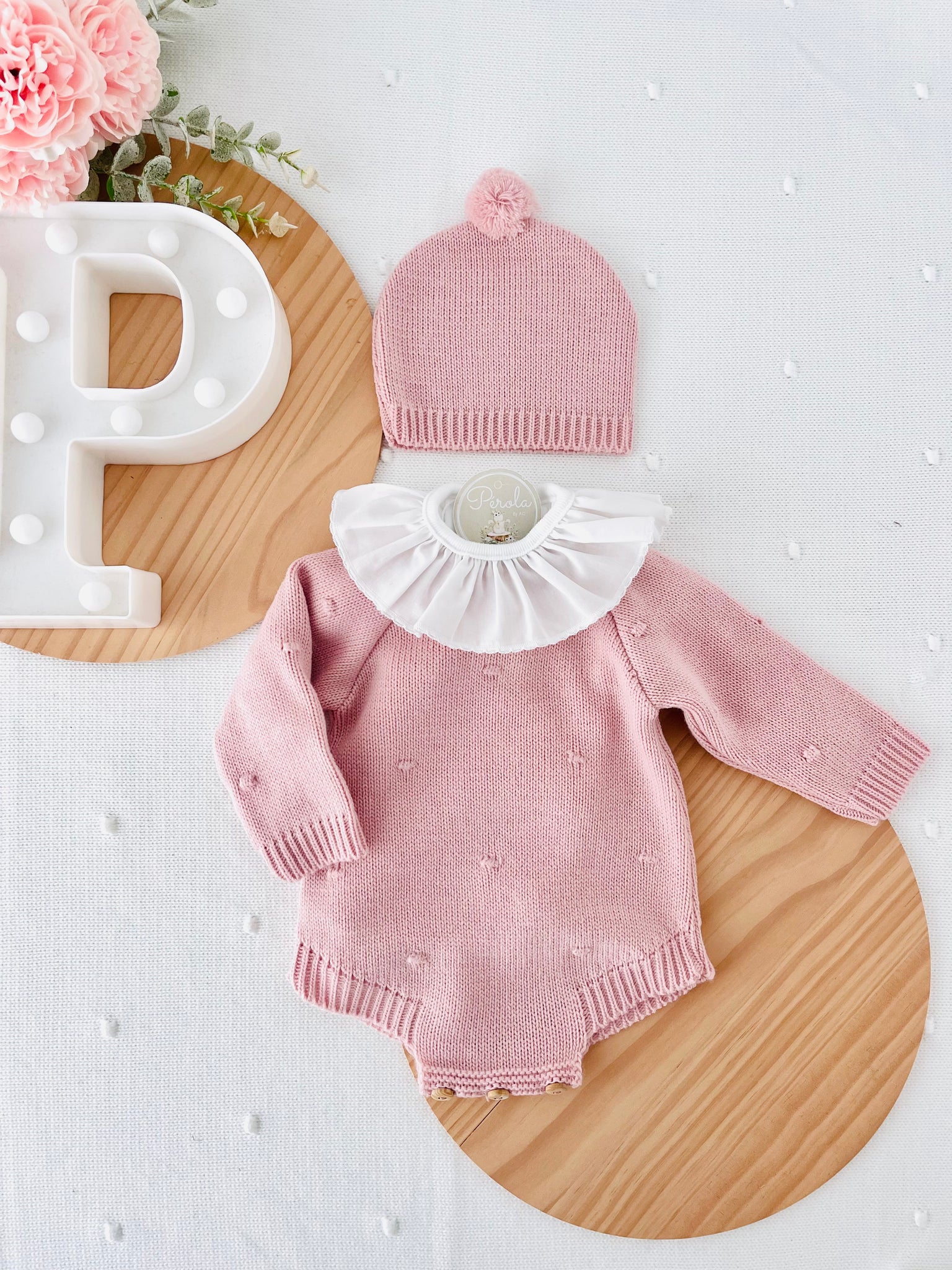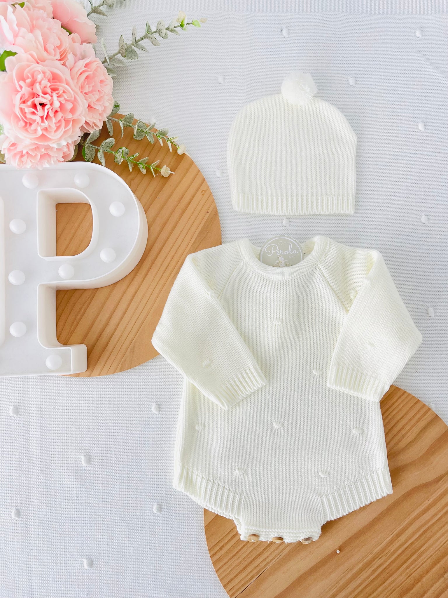 Conjunto fofo e gorro em malha suave com padrão de bolinhas encantador