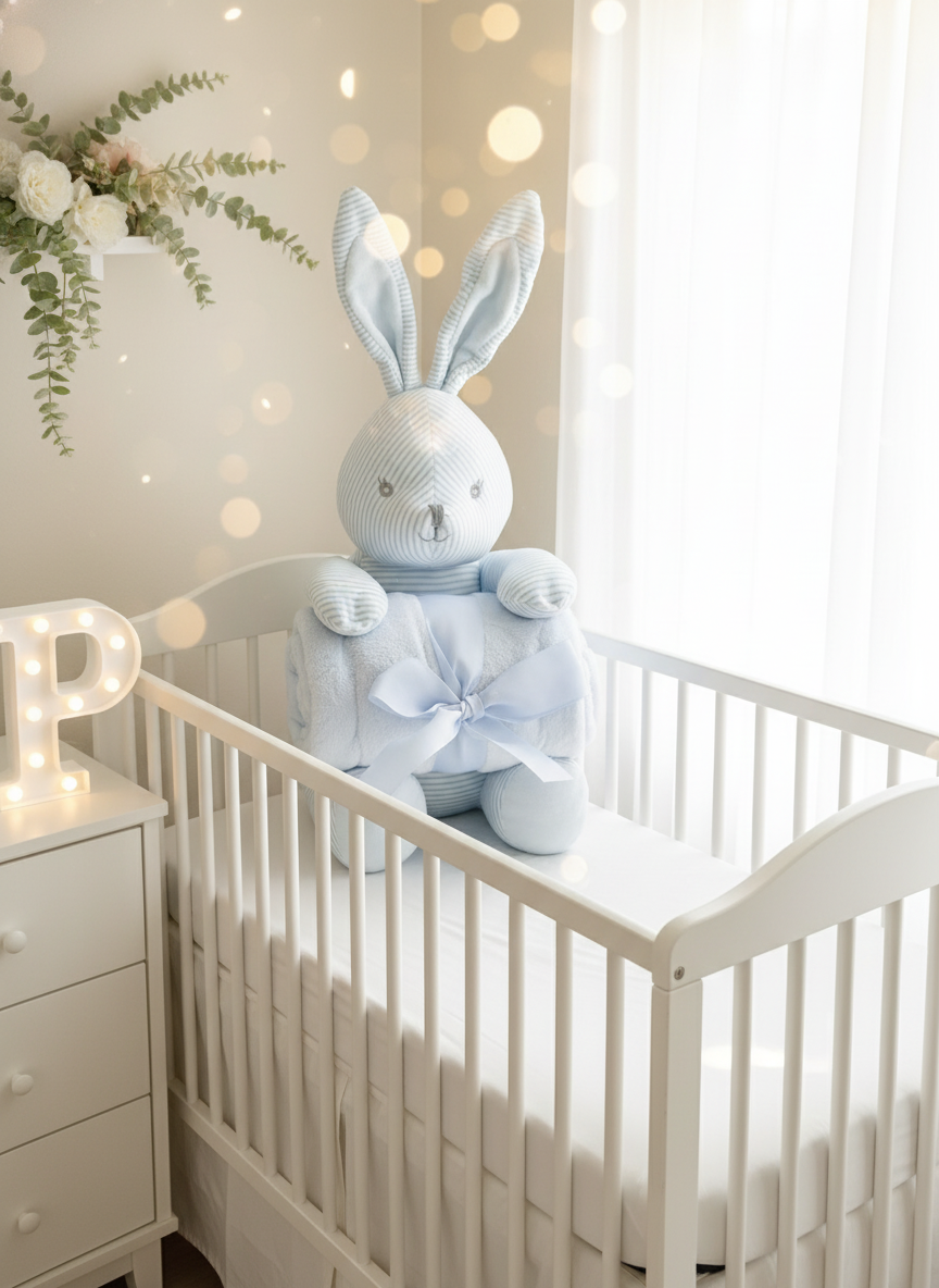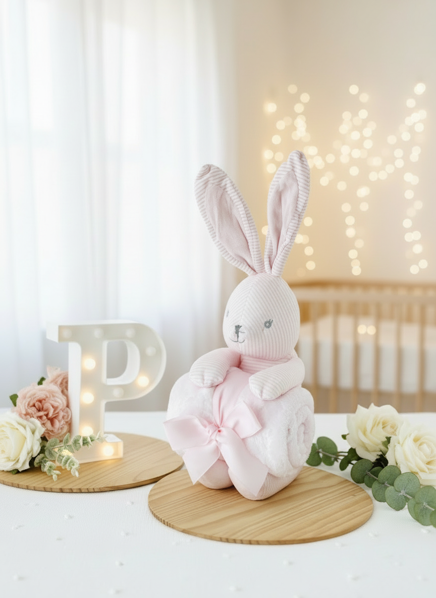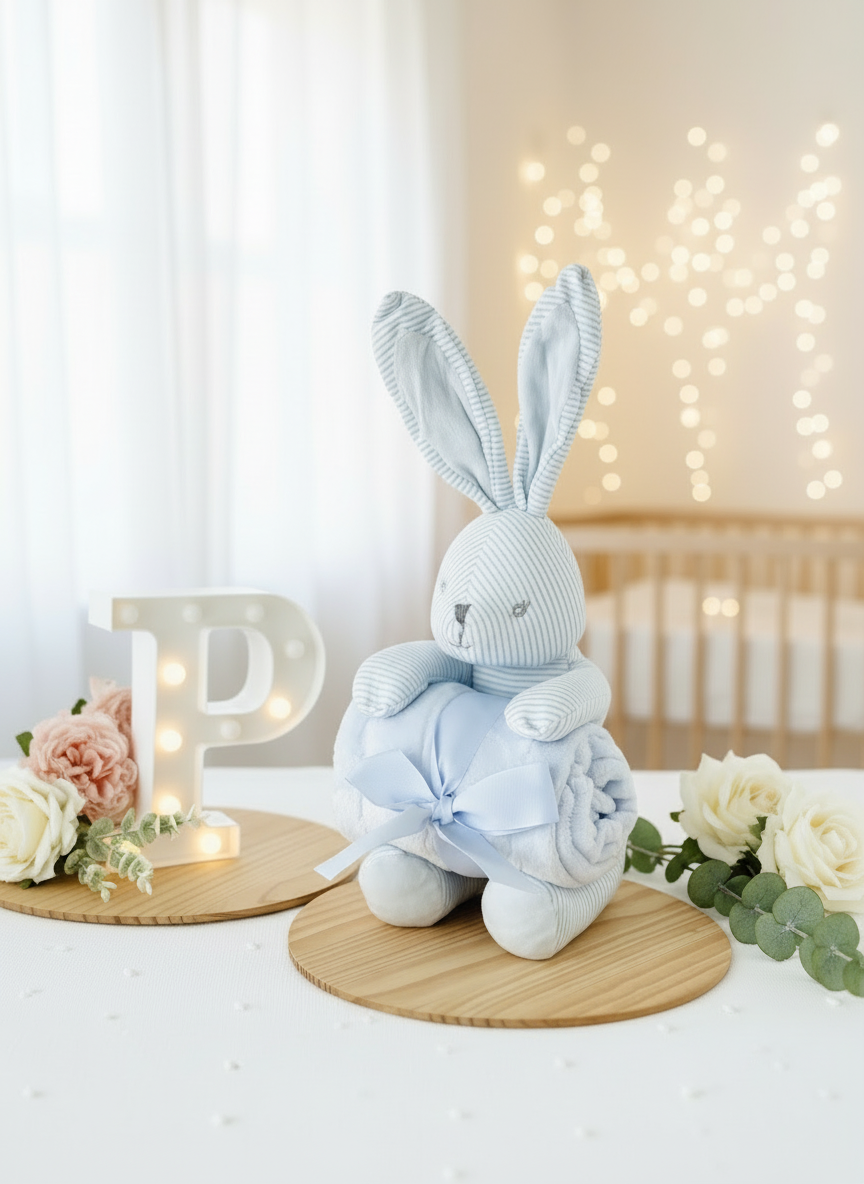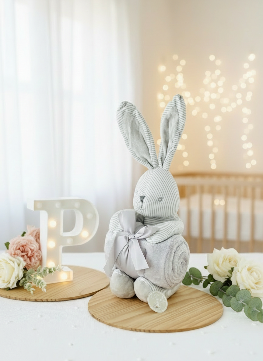 Este conjunto encantador de peluche coelhinho e manta polar é o presente perfeito para celebrar a chegada de um novo bebé ou surpreender uma futura mamã.